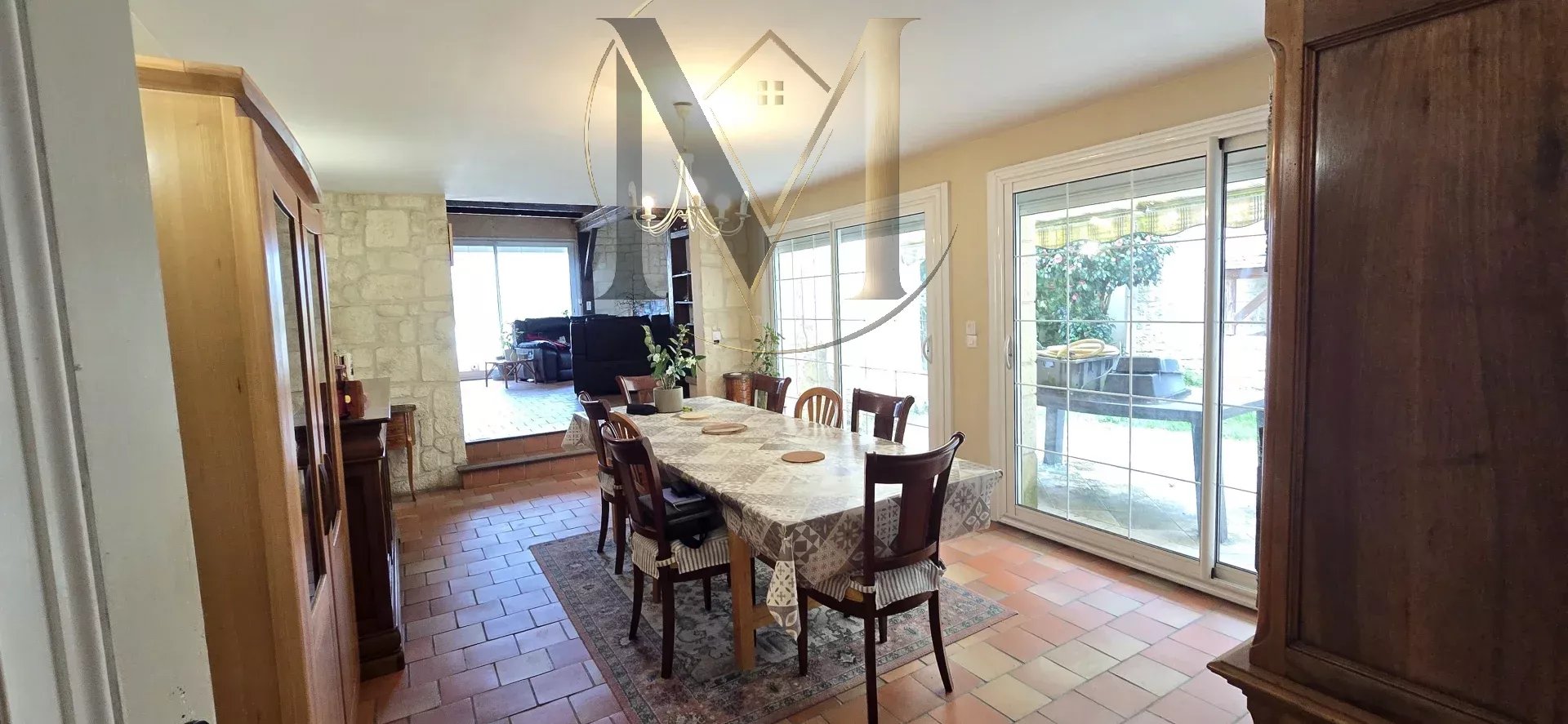- Une salle à manger et une cuisine ouvertes sur un patio intérieur plein de charme