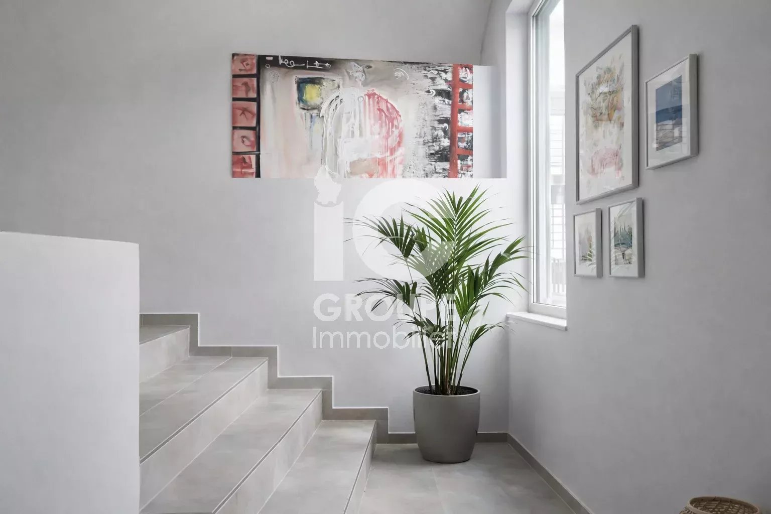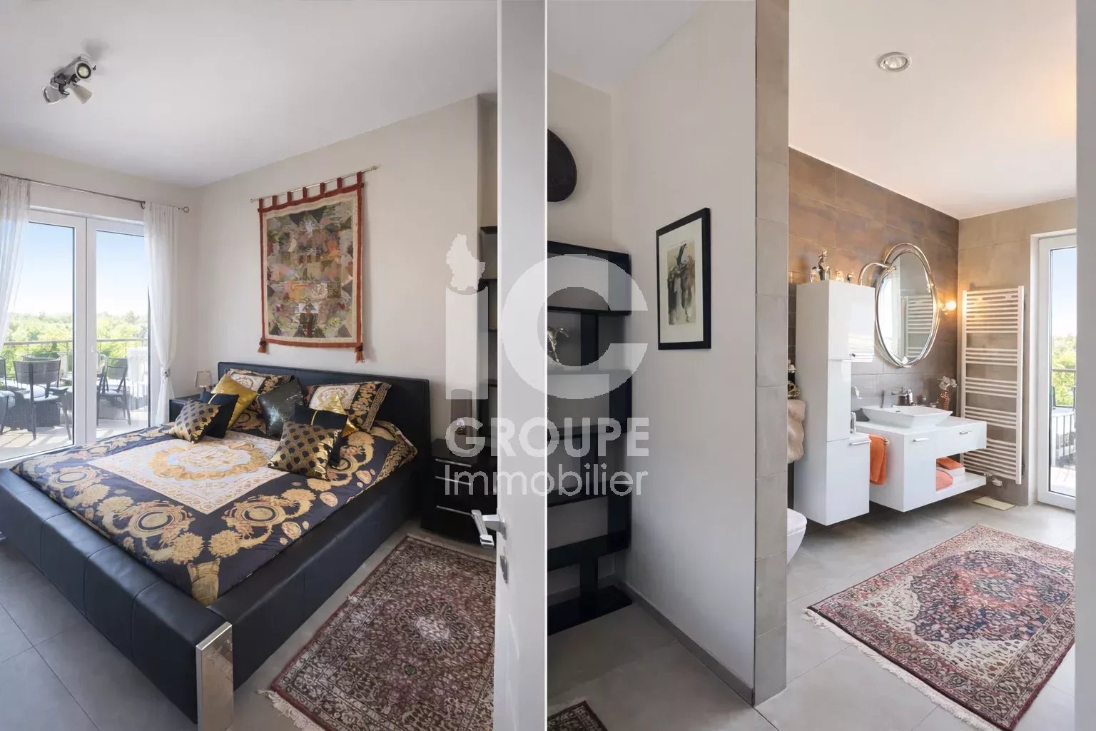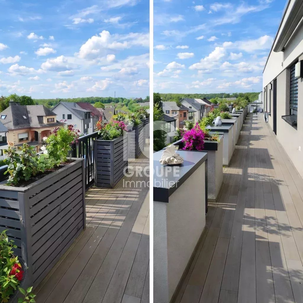Situé au dernier étage d’une résidence contemporaine construite en 2018, ce penthouse rare allie intimité, volumes généreux et prestations haut de gamme. L’ascenseur dessert directement l’appartement, renforçant le caractère exclusif du bien. Dès l’entrée, la luminosité naturelle et la fluidité des espaces séduisent immédiatement. Le vaste séjour, véritable cœur du penthouse, est entouré de deux magnifiques terrasses, créant une continuité harmonieuse entre intérieur et extérieur. Agencement & prestations • Grand séjour avec salle à manger, baigné de lumière • Cuisine moderne ouverte parfaitement intégrée • Suite parentale avec salle de bains privative et dressing • Deuxième chambre avec sa propre salle de douche • Toutes les salles d’eau disposent d’une fenêtre • Accès direct aux terrasses depuis les chambres • Espace cosy en bout de couloir, actuellement aménagé en bureau • WC séparé • Débarras avec raccordements pour machine à laver et sèche-linge • Deux emplacements de parking côte à côte en sous-sol inclus dans la vente Espaces extérieurs Les deux terrasses qui entourent le séjour offrent un véritable prolongement de l’espace de vie et permettent de profiter pleinement des beaux jours, dans un cadre résidentiel agréable. Les deux terrasses sont chacune équipées de stores bannes électriques, garantissant une protection solaire optimale et un confort maximal pour profiter pleinement des espaces extérieurs. Localisation – Sanem Sanem figure parmi les communes les plus recherchées du sud du Luxembourg grâce à : • Sa proximité immédiate avec Esch-sur-Alzette et Belval • Son accès rapide vers Luxembourg-Ville • Ses écoles, infrastructures sportives et commerces • Son environnement résidentiel calme et verdoyant Un emplacement stratégique combinant qualité de vie et excellente accessibilité. Disponible immédiatement pour visite. Pour tout renseignement complémentaire ou pour organiser une visite, merci de nous contacter au +352 621 198 178.
