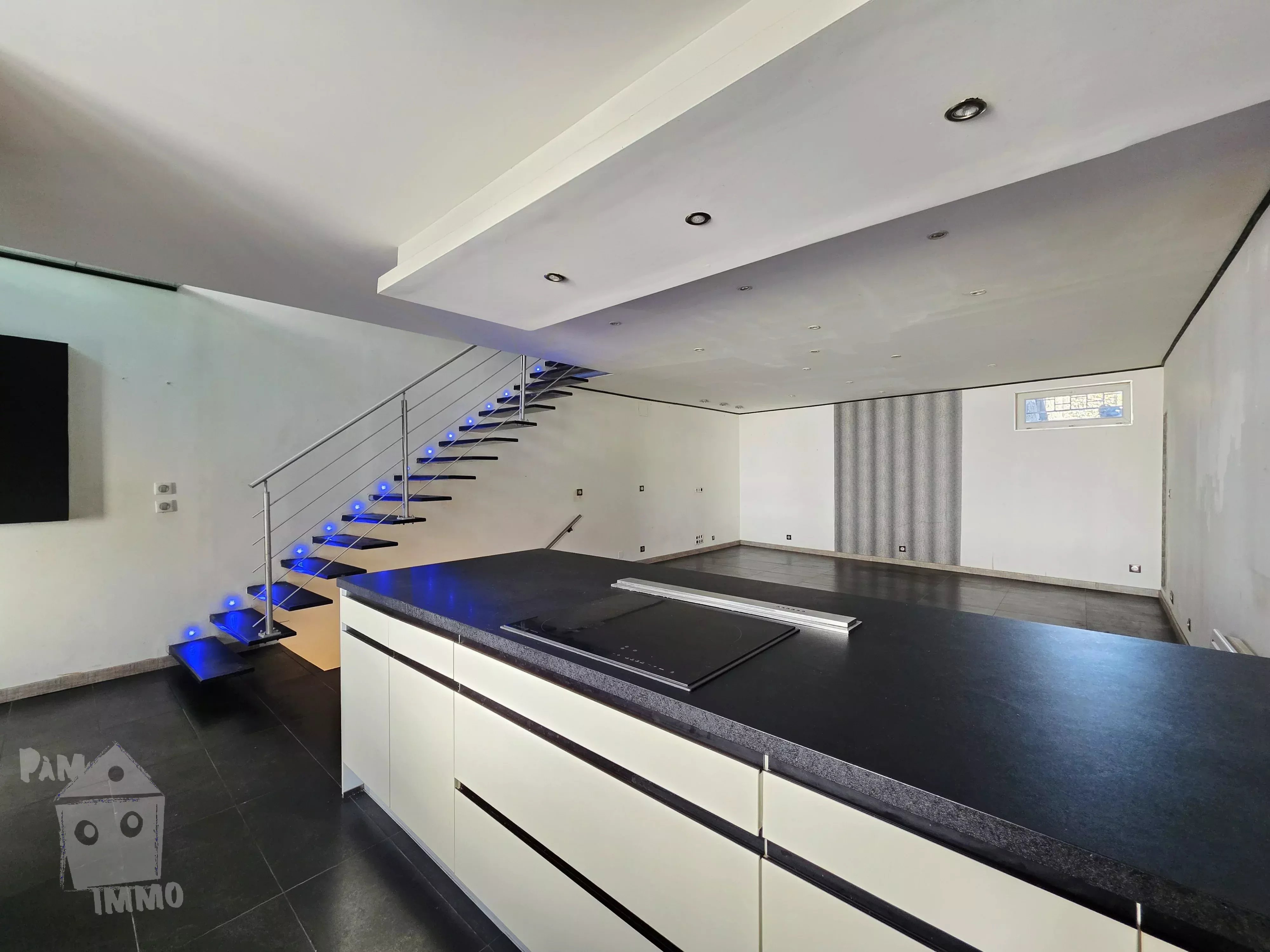 Le rez-de-chaussée se compose d’une entrée, d’une cuisine entièrement équipée ouverte sur un grand salon-séjour, formant un espace de vie agréable et bien agencé.