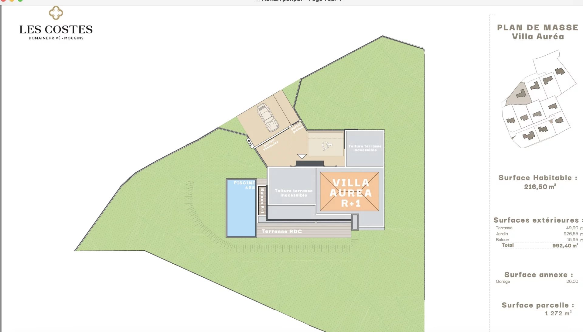 Ai piedi del borgo antico, scoprite "Les Costes", un nuovo eccezionale dominio privato di sole 10 ville d'autore. Consegna prevista per il 1° trimestre 2028. In questa cornice verdeggiante, la Villa Aurea sviluppa 216,50 mq di superficie abitabile su un magnifico terreno di 1.272 mq. Questa nuova proprietà dispone della propria piscina privata con solarium in legno e di un ampio garage chiuso. Cucina: Fornita con una cucina italiana di alta gamma Veneta Cucine (budget di 20.000 € incluso), personalizzabile. L'aspetto esclusivo: Costruita secondo i moderni standard RE 2020 con struttura in cemento armato, la disposizione interna è completamente personalizzabile. Include climatizzazione reversibile, domotica e spese notarili ridotte (circa 2,5% PUNTI DI FORZA: • ESCLUSIVITÀ: Un dominio intimo di sole 10 unità per la massima riservatezza. • SICUREZZA: Complesso interamente recintato, videosorveglianza e accesso sicuro (Vigik e smartphone). • POSIZIONE: Calma assoluta, a 4 minuti dal borgo di Mougins, 15 minuti dalla Croisette di Cannes e 30 minuti dall'aeroporto di Nizza.