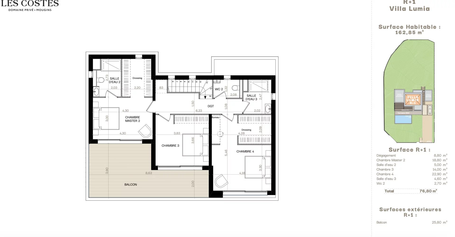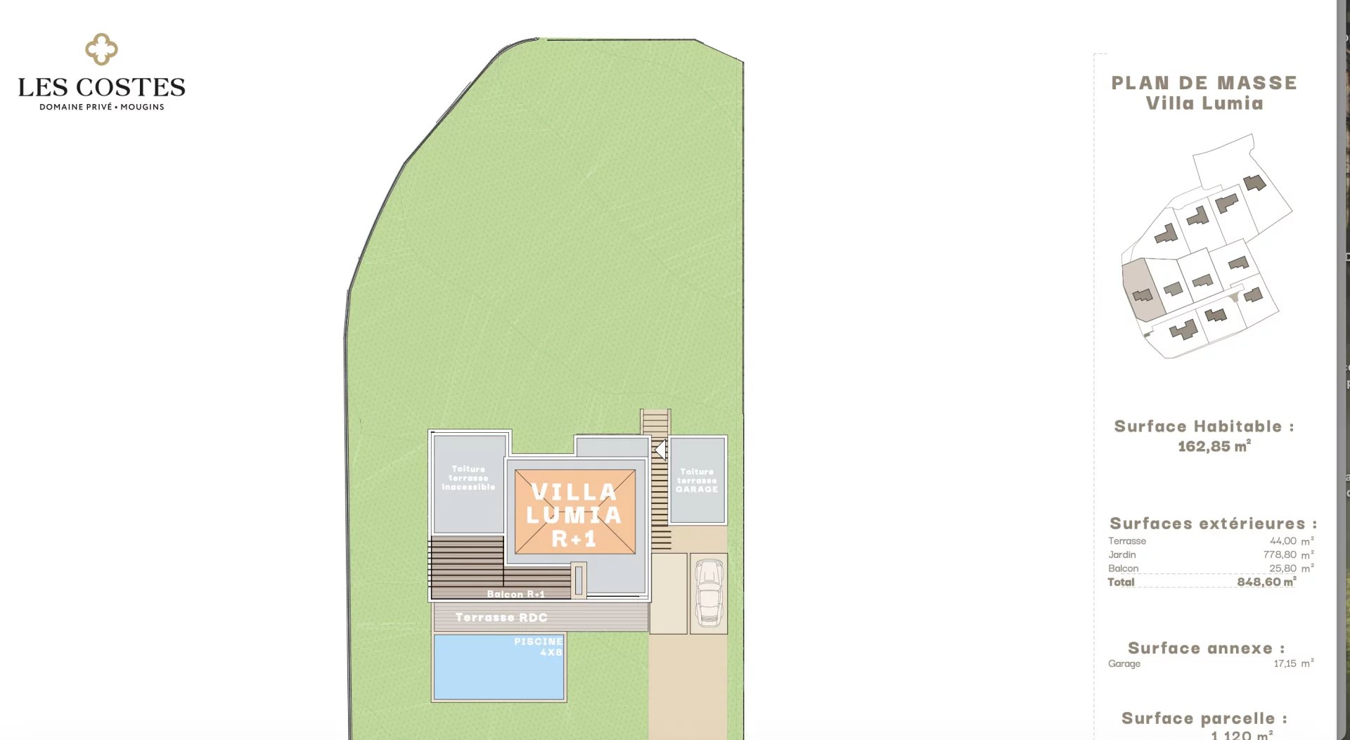 Localizzazione: Ai piedi del borgo antico di Mougins, scoprite questo nuovo dominio privato composto da sole 10 ville d'autore. Un contesto sicuro e prestigioso che garantisce la massima tranquillità. Dettagli della Villa (162,85 m² abitabili): Costruita su un lotto di 1.120 m², questa villa contemporanea offre spazi eleganti: • Piano Terra (86,05 mq): Soggiorno con cucina a vista di 47 mq che si affaccia sulla terrazza di 44 mq e sulla piscina privata. Suite padronale al piano terra. • Piano Superiore (76,80 mq): Seconda Suite Master e altre due ampie camere da letto con bagno. Grande balcone di 26 mq. • Dotazioni: Cucina italiana Veneta Cucine (budget 20.000 € incluso), finiture di pregio e domotica integrale. • Sicurezza: Area recintata con videosorveglianza HD (2 anni inclusi). Garage con ricarica per veicoli elettrici. Standard RE 2020. Vantaggio: Spese Notarili Ridotte (~2,5%). Consegna Q1 2028