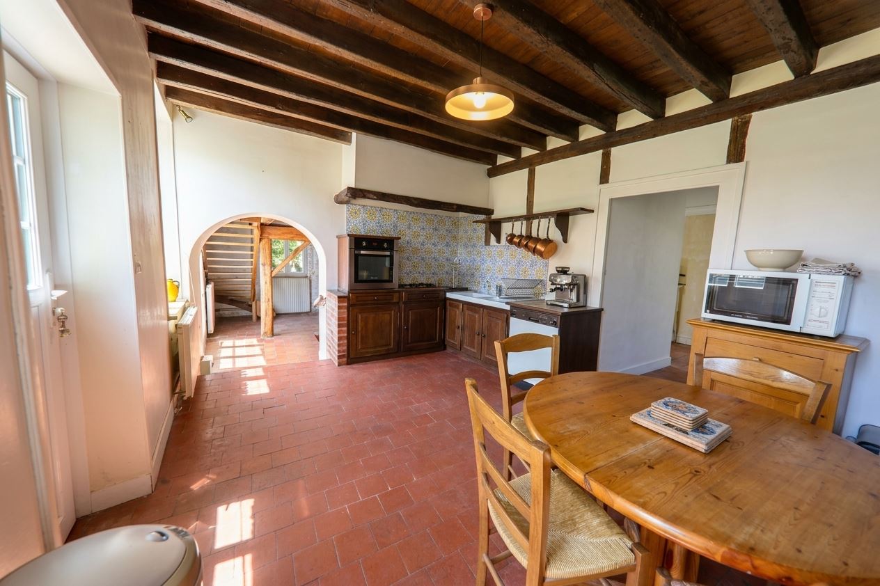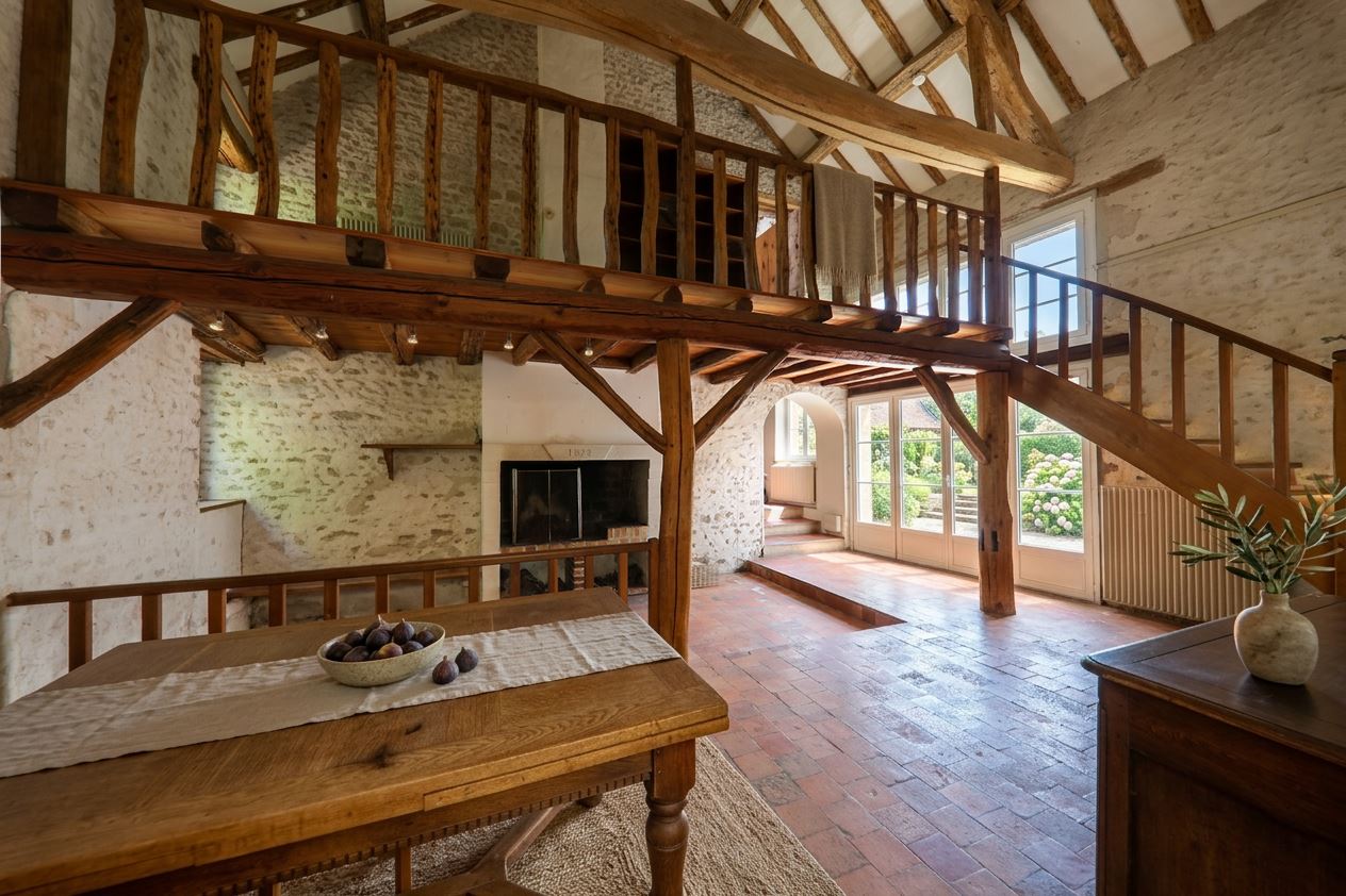 La maison principale, au cachet rural préservé, offre une vie de plain-pied avec une cuisine conviviale, une chambre et un superbe séjour cathédrale avec cheminée et mezzanine.