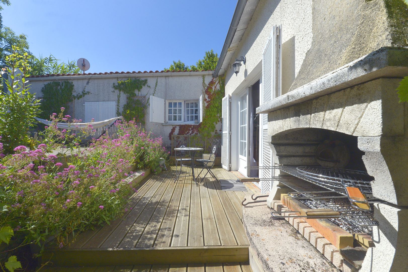 Vous pourrez profiter d'une grande terrasse qui longe la maison, comprenant une partie en bois pour le solarium et un carport végétalisé recouvert d'une vigne, offrant ainsi un agréable coin dinatoire ombragé. Les combles sont aménagées et isolées, comprenant une chambre, une salle de bain et des toilettes, ainsi qu'un espace pouvant être transformé en cinquième chambre pour enfant.