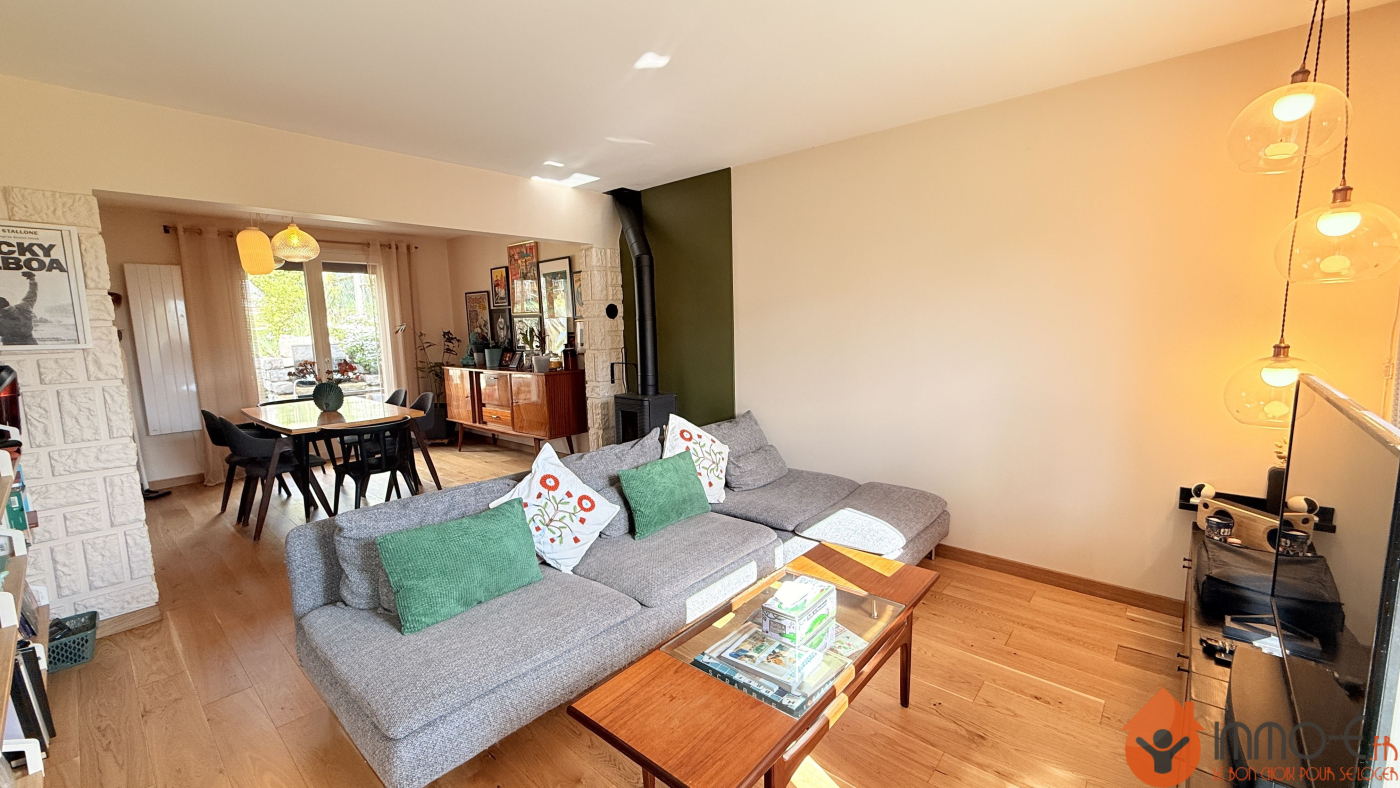 Une entrée accueillante ouvre sur un double séjour lumineux avec poêle, parfait pour des moments chaleureux en famille. Vous profiterez d'une cuisine ouverte moderne et entièrement équipée (installée en 2023), ainsi que de 2 chambres avec dressing, une salle de bains et des WC indépendants.