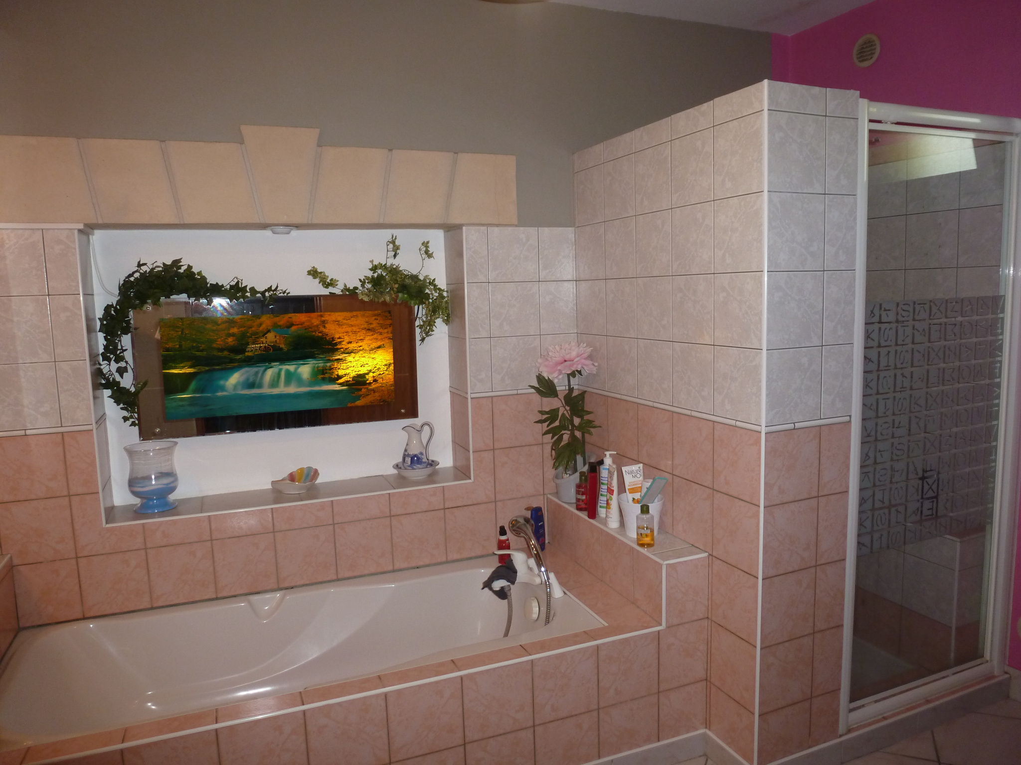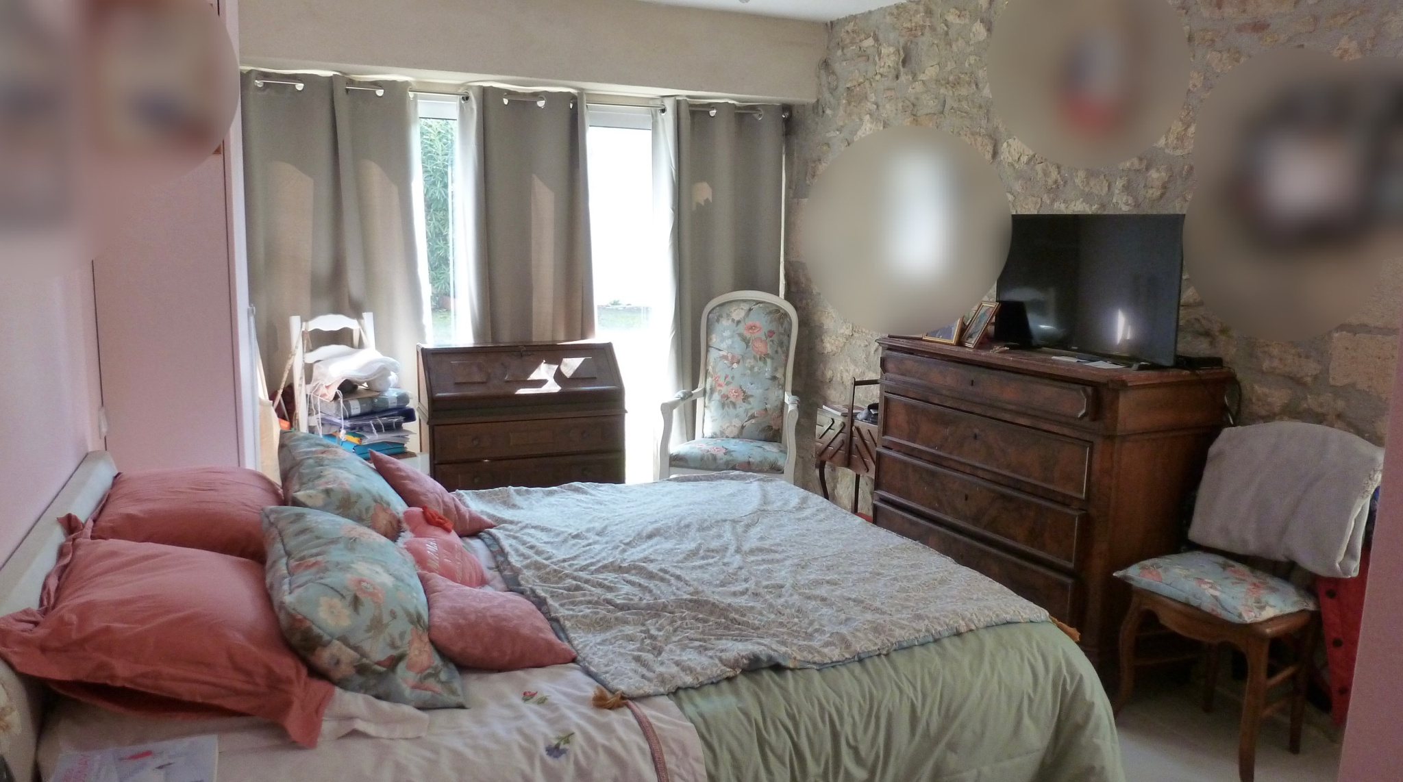 A l'étage : 4 grandes chambres : 26 - 17 - 17 - 15 m2 avec dressings - Une Salle de Bains 15m2 avec Douche Baignoire Lavabo . Un WC séparé.