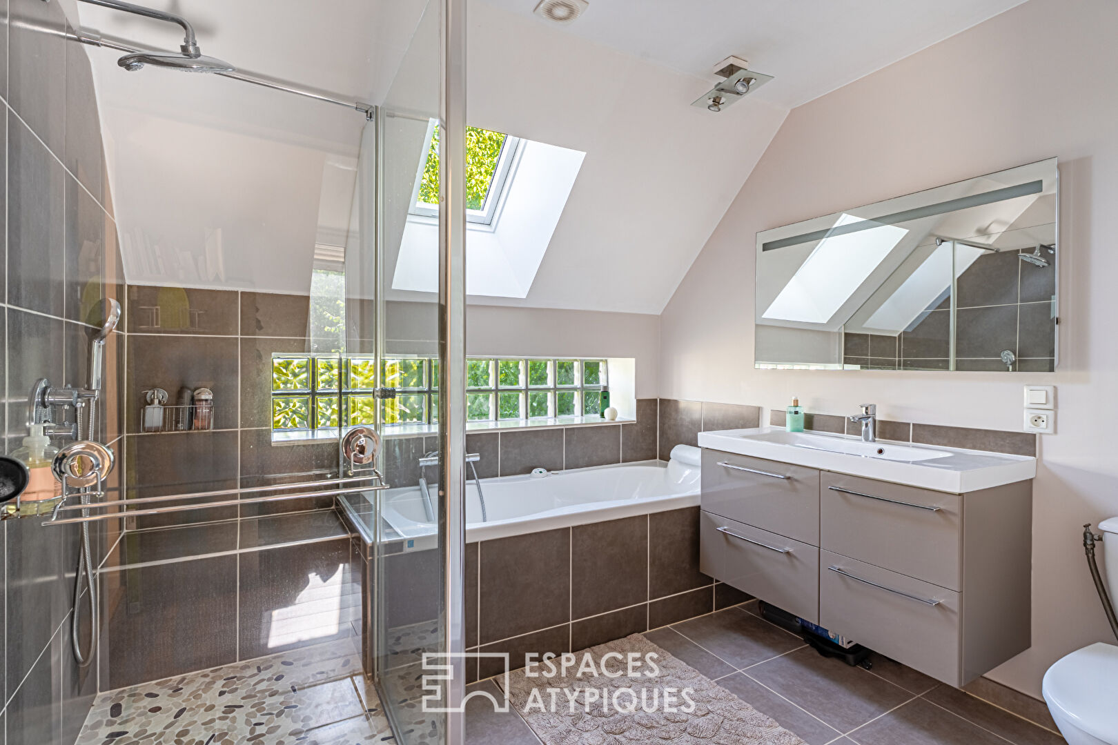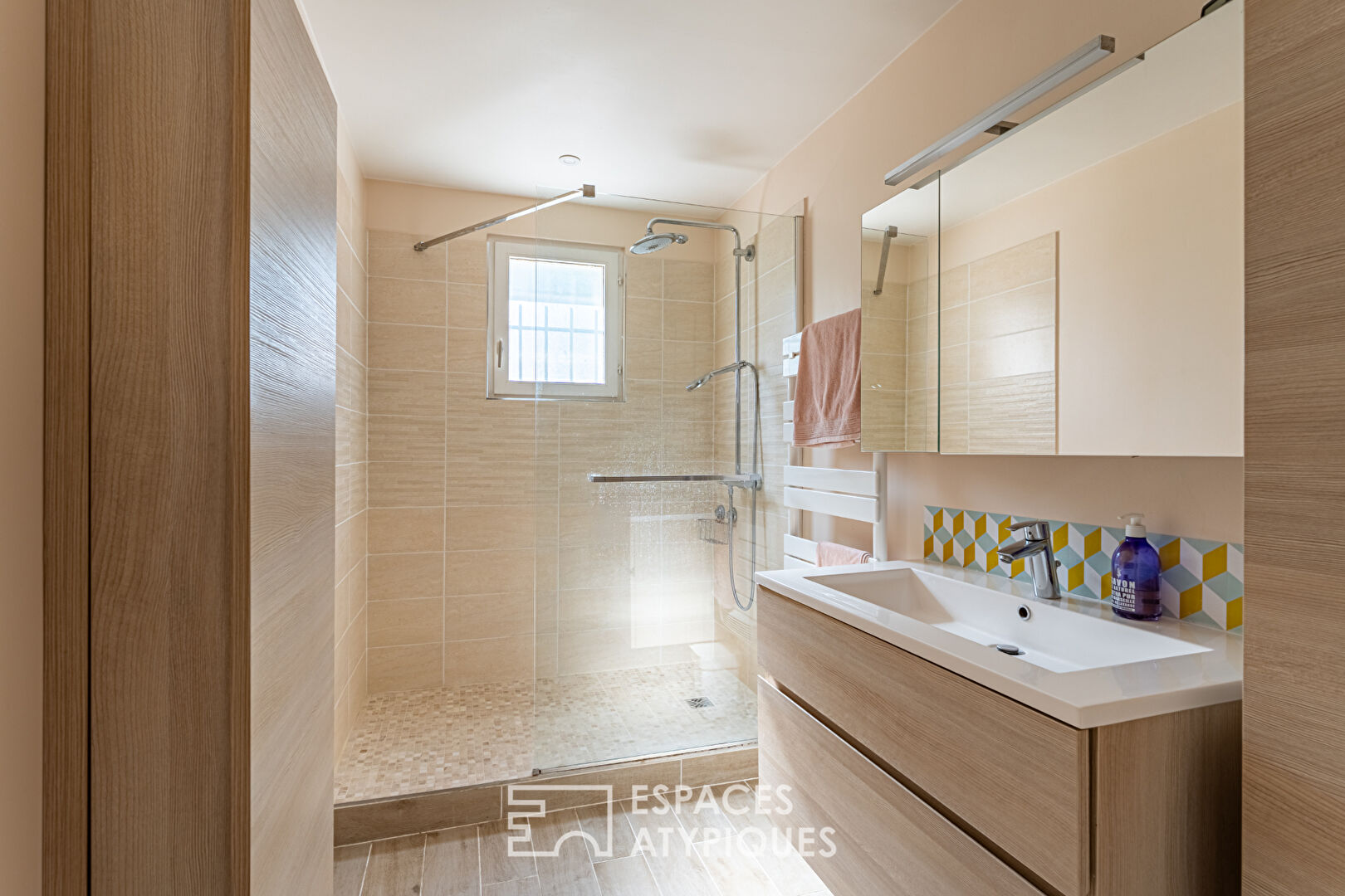 Cette charmante maison de 110 m² a pris place sur l'île de la Dérivation (jamais inondée) à Carrières-sous-Poissy, prisée pour son calme, dans cet environnement unique, avec son agréable jardin de 450 m² sans vis à vis. Cette île est accessible à pied, en vélo, moto ou quad par une passerelle surplombant l'écluse désaffectée depuis 1977 mais qui porte toujours l'empreinte des bateliers. L'entrée se réalise dans le salon avec son poêle à granule et sa salle à manger qui partagent une belle surface de réception de 41 m² avec la cuisine ouverte, tournés sur la terrasse exposée ouest sur jardin, et vue Seine. Le dégagement, à droite, mène à une petite chambre qui s'offre une jolie salle d'eau. A gauche du salon, une chambre/salon d'invité développe une surface de 9 m² et jouxte la buanderie de 8 m² (supplémentaires). L'escalier dessert l'espace nuit du premier étage qui se compose d'un palier, d'une jolie chambre de 11 m² avec rangements, puis de la suite parentale de 17 m² qui s'offre son dressing et sa salle de bains privés. Discrètement placés sous la terrasse du bord de rive, se trouvent un atelier et une pièce de rangement. Un grand cabanon de jardin en bois, un double box sur rive, avec convention de la Mairie, complètent les prestations de ce bien. Cette agréable maison, discrète, sans vis à vis, au calme, avec son jardin joliment aménagé avec ses deux terrasses qui bénéficient d'une jolie vue sur le petit bras de Seine. Aucun travaux n'est à prévoir dans ce bel environnement hors du temps... Le bus est à100 m de la passerelle et vous emmènera en 10 min à la gare de Poissy pour le RER A, Eole ou le TER J : 18 min de St Lazare, trains toutes les 20 min Ecoles primaire et élémentaire à 15 min à pied. Ecole notre Dame des oiseaux de Verneuil à 18 min en voiture, CLASSE ENERGIE : D / CLASSE CLIMAT : A. Montant moyen estimé des dépenses annuelles d'énergie pour un usage standard, établi à partir des prix de l'énergie 2021, 2022 et 2023 (abonnement compris) : entre 1.850 et 2.550 euros Les informations sur les risques auxquels ce bien est exposé sont disponibles sur le site Géorisques : https://www.georisques.gouv.fr Contact : Sophie 07 61 00 52 78 RSAC Versailles : 832 411 144 Sophie STANDERA (EI) Agent Commercial - Numéro RSAC : 832411144 - Paris.