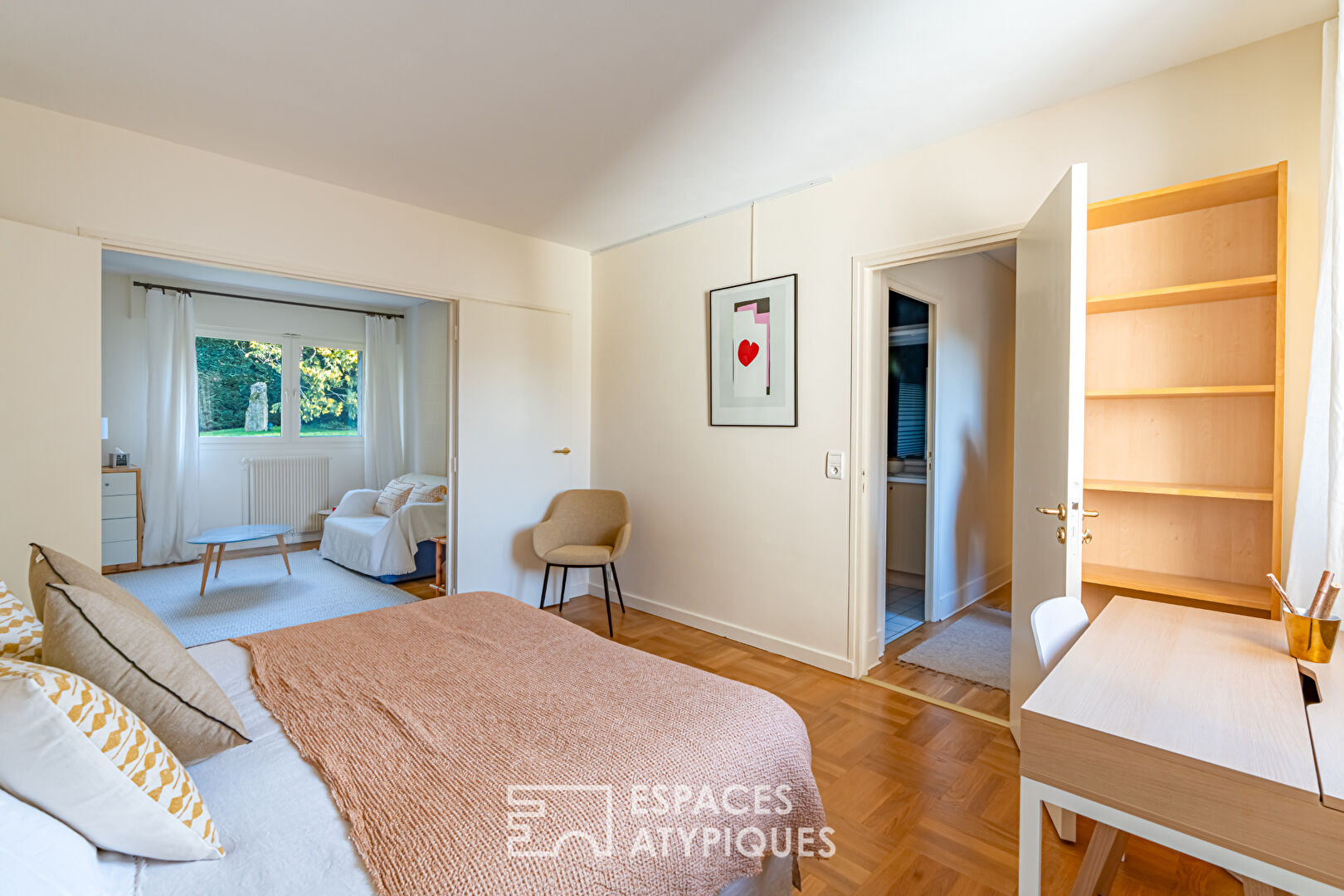 Située au coeur du charmant village de Fourqueux, quartier très recherché de Saint Germain en Laye, cette élégante propriété familiale bénéficie d'un environnement privilégié à proximité immédiate de la forêt, du golf, des commerces, des écoles et du Lycée international (15 min en bus, ou 20 min à pied). Edifiée en 1984, par un ingénieur spécialisé dans la conception d'ouvrages d'Art, cette maison à l'architecture avant-gardiste, reconnaissable à sa toiture papillon, développe 421 m² (475 m² au sol) répartis sur trois niveaux. Ses superbes volumes, baignés de lumière grâce à de larges ouvertures, offrent un cadre de vie rare, discret et entouré de verdure. Le rez de jardin, accessible par une volée de marches, s'ouvre sur une vaste entrée desservant une triple réception composée de deux salons lumineux avec cheminée et d'une salle à manger ouvrant sur une agréable terrasse sans vis à vis. Ce niveau accueille également une cuisine indépendante, une salle à manger familiale et une chambre qui profite d'un salon/bureau et de sa salle de bains privée. A l'étage, un palier distribue deux chambres avec mezzanine, une suite parentale avec dressing et une grande salle de bains facilement transformable en deux salles d'eau (plans et chiffrage étudiés et à disposition). Le niveau rue propose un véritable espace indépendant avec un joli appartement de 58 m² (inclus dans la surface totale), disposant de sa propre entrée. Une entrée de service avec boot room, une salle de sport ainsi qu'un vaste bureau de 35 m² aménageable selon ses envies en salon TV, salle de jeux ou home cinéma. Une buanderie/lingerie et un local technique complètent ce niveau qui pourrait aussi être transformé pour héberger une profession libérale de 100 m² (plans et chiffrages étudiés et à disposition) Deux stationnements aériens sont possibles au sein de la propriété. Cette maison bénéficie d'une vidéo surveillance haut de gamme. Cette maison de caractère, de très belle construction, entourée de son écrin de verdure, offre un potentiel d'évolution et de réaménagement, idéal pour une famille à la recherche d'un bien unique, lumineux et modulable, en coeur de village et en toute discrétion... Ecole maternelle et élémentaire à 5 min à pied, Lycée international à 20 min à pied (15 min en bus) Tram 13 pour rejoindre le RER A de Saint Germain en Laye à 15 min à pied. Bus R1 à 9 min à pied Bus R2 sud à 5 min à pied A14 à 4 km CLASSE ENERGIE : D / CLASSE CLIMAT : D. Prix moyens des énergies indexés 01.07.24 (abonnements compris) : 5.588 et 7.560 euros par an. Contact : SOPHIE 07 61 00 52 78 RSAC Versailles : 832 411 144 Sophie STANDERA (EI) Agent Commercial - Numéro RSAC : 832411144 - Paris.