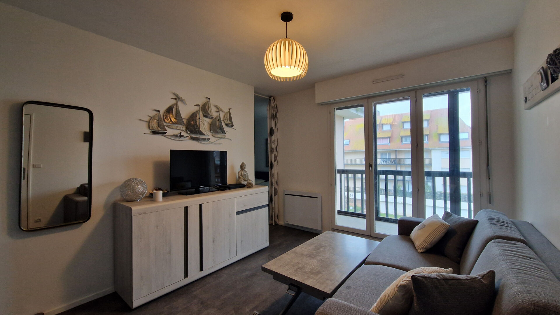 A 100 m de la plage et 5 min des commerces, dans une résidence fermée, un appartement de 3 pièces avec loggia et place de parking extérieure. (5.67 % honoraires TTC à la charge de l'acquéreur.) Copropriété de 429 lots.