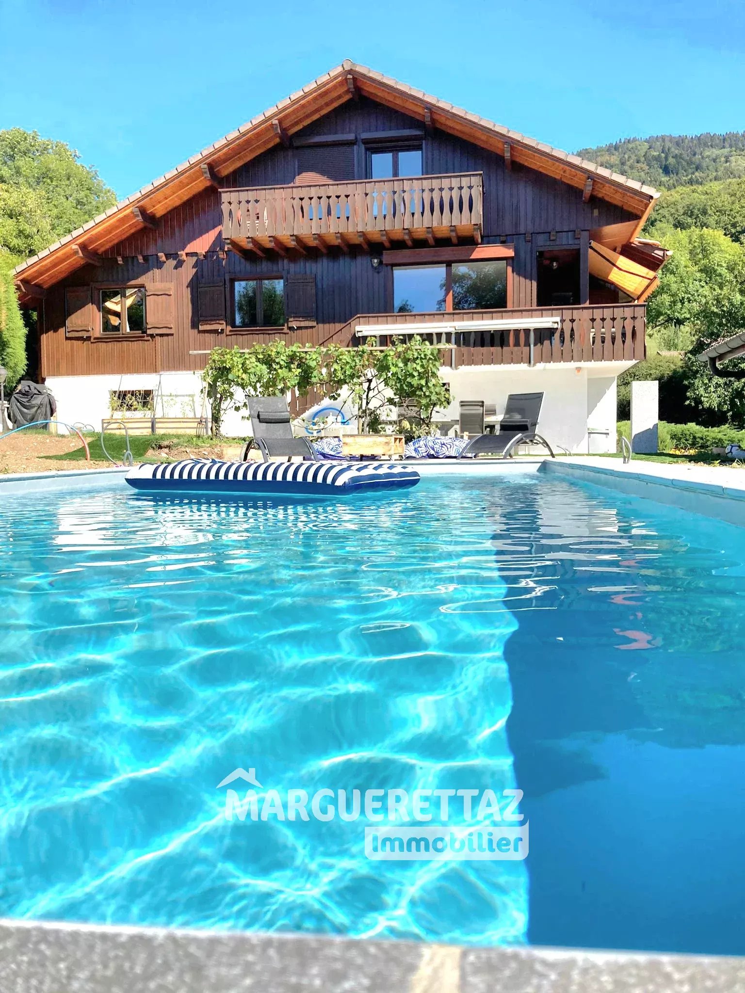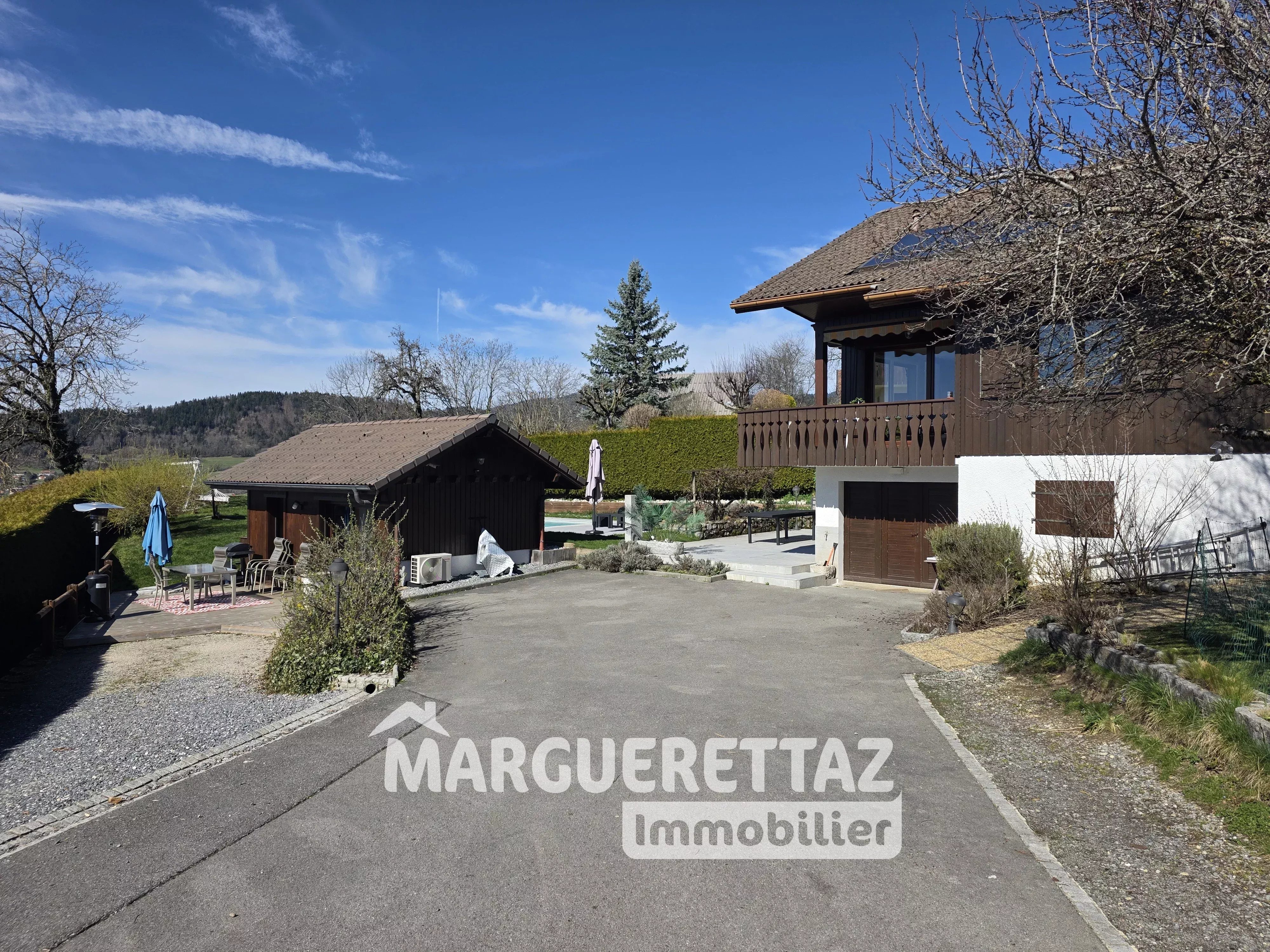 Situé dans un environnement calme et verdoyant à 5 minutes du centre et à 20 min de l'accès à l'autoroute, ce charmant chalet de 240 m² surface utile (160 m² habitables) offre de beaux volumes, une vue dégagée sur la campagne et un fort potentiel familial ou locatif. Édifié en 1989 et rénové en 2016, le bien est implanté sur une parcelle d’environ 1000 m² sans vis-à-vis, bénéficiant d’une exposition Sud-Ouest et d’une belle luminosité tout au long de la journée. Description du bien : Rez-de-chaussée : * Garage * Buanderie * Atelier * Local technique * Cave à vin * STUDIO 20 m² (chambre indépndante aménagée avec plaque de cuisson, douche et toilettes). 1er étage : * Entrée * Cuisine équipée ouverte * Salle à manger * Salon avec cheminée insert * Suite parentale avec grand dressing et salle de douches 2ème étage : * 4 grandes chambres * Salle de bains avec toilettes En complément, le bien dispose d'un autre STUDIO INDEPENDANT, annexe de 22 m² réalisé en 2022 entièrement équipé et muni d'une clim reversible, idéal pour accueillir famille, amis ou pour un projet locatif. Extérieurs : * Piscine (8 x 3,5 m) en béton banché recouvert en PVC armé garanti à vie. Chauffée avec pompe à chaleur. * Terrasse carrelée avec vue dégagée sur la campagne (vue sur terrain non constructible classé "zone montagne") * Serre à légumes en aluminium * Stationnements extérieurs 5 à 6 voitures Caractéristiques techniques : * Chauffage fioul avec chaudière WISMAN (conso moyenne 600 l/an) * Cheminée insert (conso moyenne 6 Stères/an) * Panneaux solaires pour chauffer l’eau chaude * Fibre internet * Equipement Triphasé * Adoucisseur d’eau * Radiateurs récents * Facades repeintes en 2020 en 5 couches * Grand ballon eau chaude * Assainissement : tout-à-l’égout Rentes locatives actuelles : * La maison = 3 500 Euro la semaine * Le studio de 20 m² = 500 Euro /mois * Le studio indépendant de 22 m² = 1 000 Euro mois Proche stations de ski, l'ensemble est loué très régulièrement sans difficulté. Performance énergétique : DPE : Niveau de consommation énergétique : D - 204 Niveau émission des gaz à effet de serre : D - 36 Estimation des dépenses annuelles entre 2 656 € et 3 594 € par an. Prix moyens des énergies indexés sur les années 2021, 2022 et 2023 (abonnements compris) conformément à l’arrêté du 31 mars 2021 en vigueur lors de l’établissement du DPE Prix : 749 000 € honoraires inclus charges vendeurs. Les informations sur les risques auxquels ce bien est exposé sont disponibles sur le site Géorisques : www.georisques.gouv.fr Contact : Céline JAMPIETRO – Conseillère Immobilier - celine.jampietro@marguerettaz.immo - 06.83.12.14.18