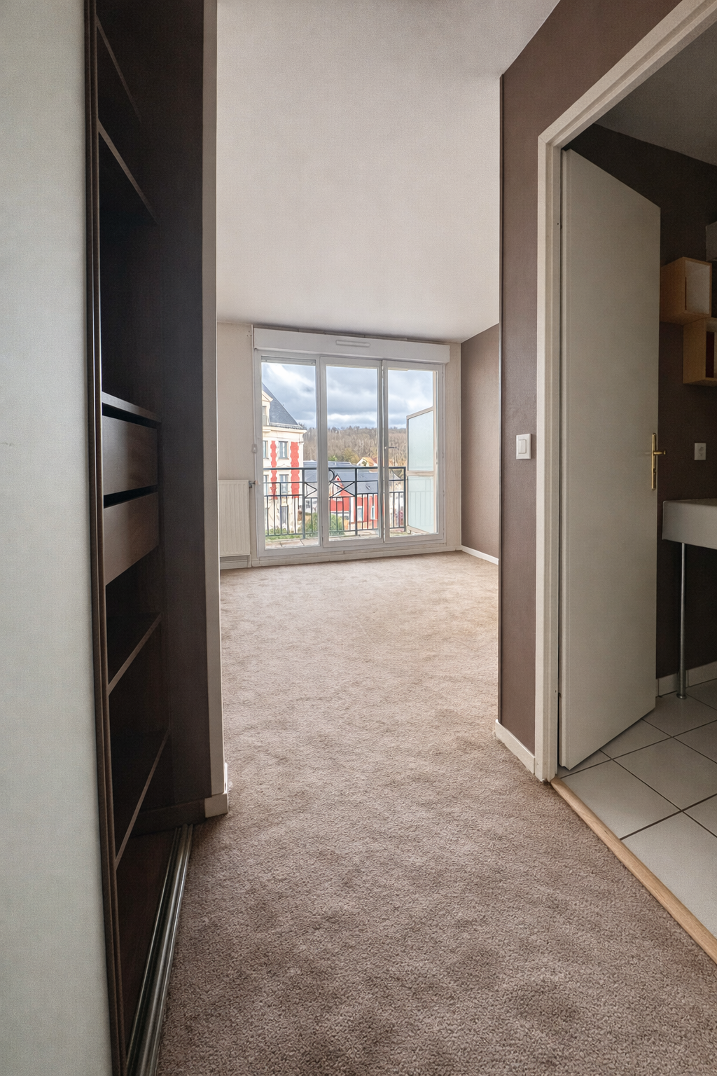 Une entrée avec rangements dessert une cuisine aménagée, indépendante et fonctionnelle. Le séjour lumineux s'ouvre sur un balcon. En face du séjour, une première chambre avec placard peut également faire office de bureau ou d'espace polyvalent.