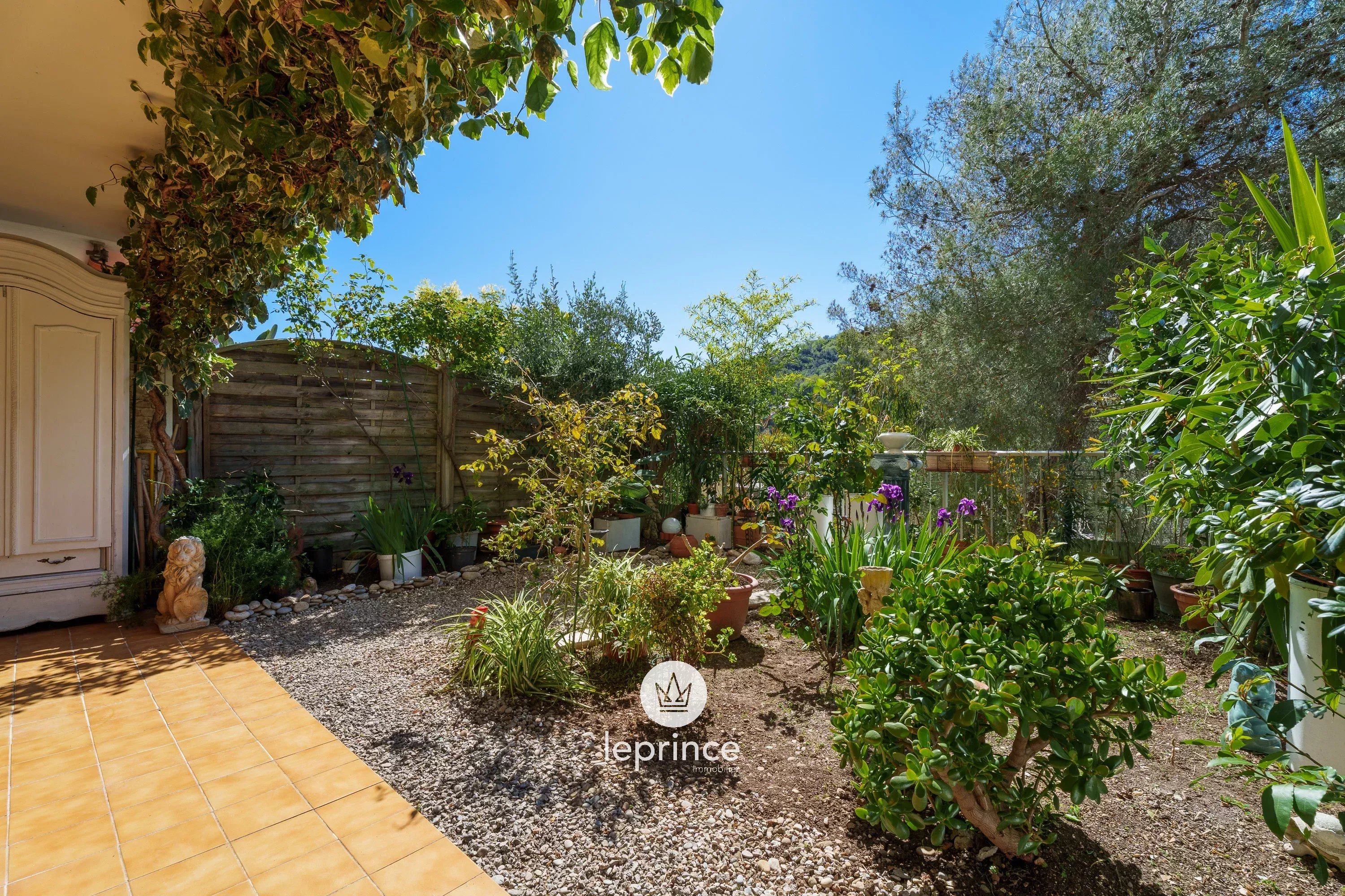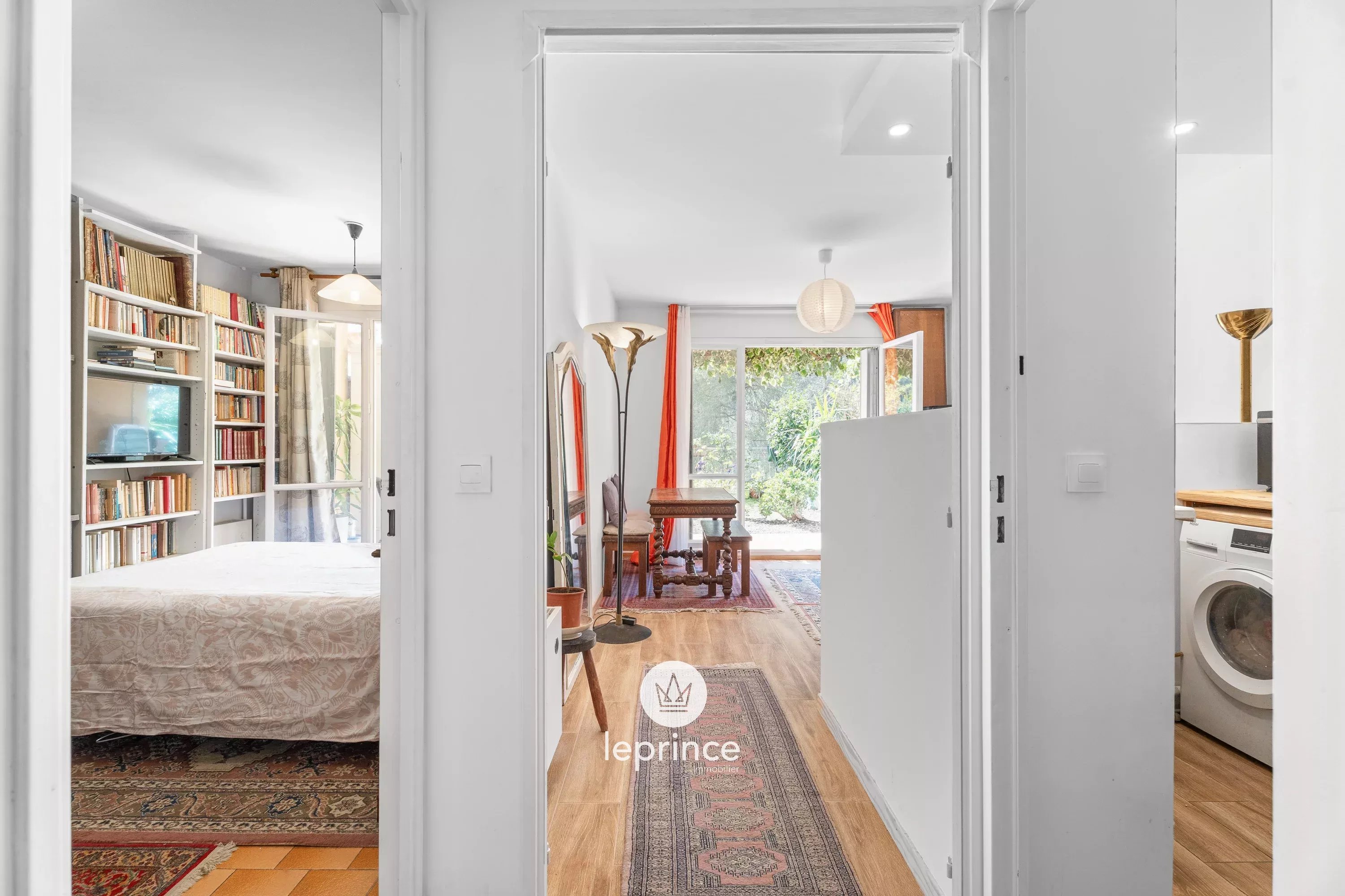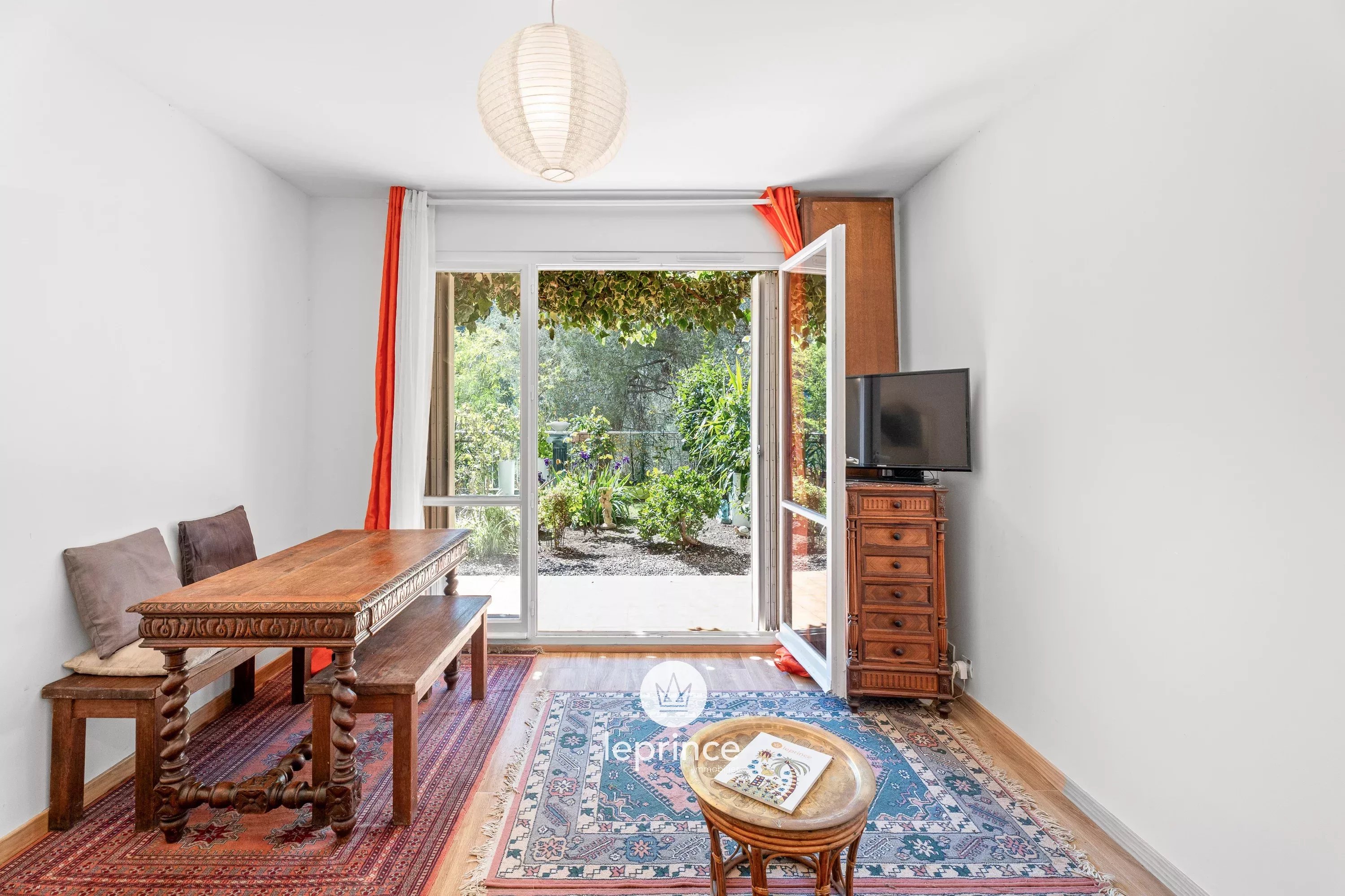 L’appartamento si apre su un soggiorno con cucina semi-aperta, che offre uno spazio abitativo funzionale. Questo spazio dà accesso a un piacevole giardino di 40 m² con vista sul verde.