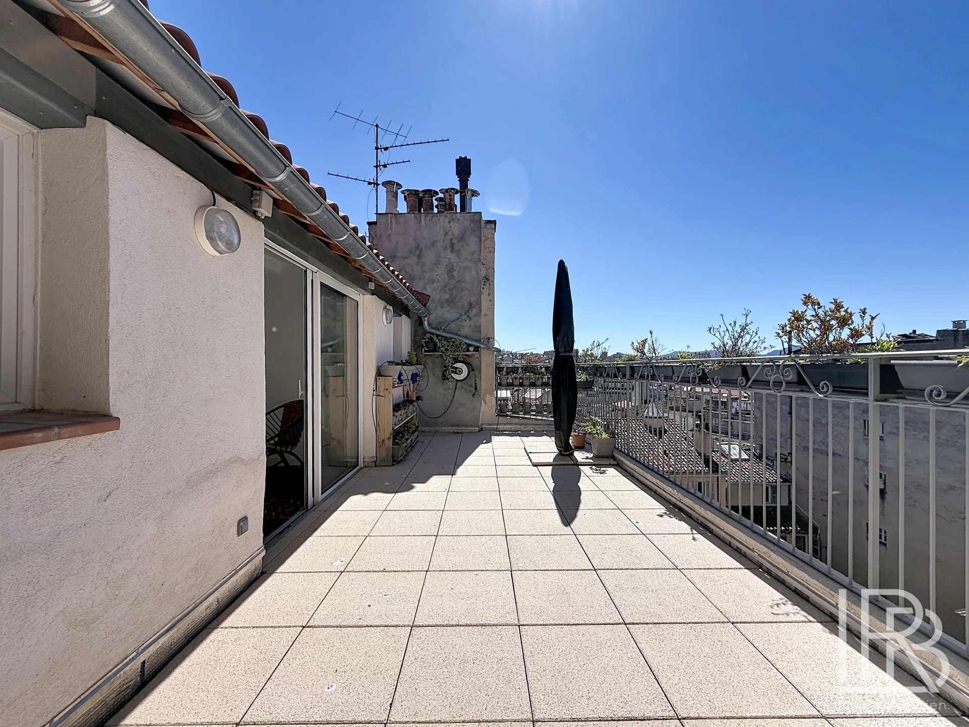 Le second niveau (5e étage, dernier étage) développe 59 m² et comprend un salon de 25 m² avec cuisine ouverte équipée, deux chambres (15 m² et 11 m²), une salle de bain avec douche et WC, ainsi qu’un accès direct à une terrasse de 25 m² particulièrement ensoleillée.