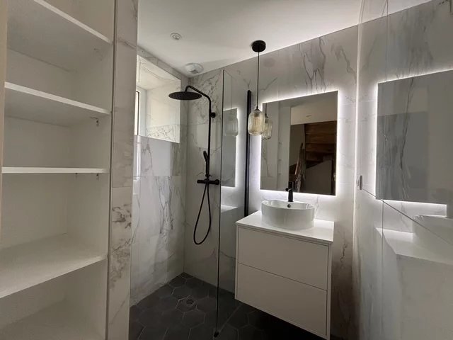 Au niveau inférieur : une grande chambre avec une salle d'eau et buanderie.