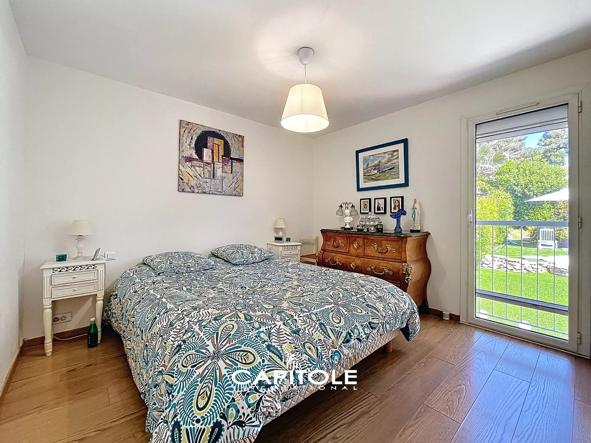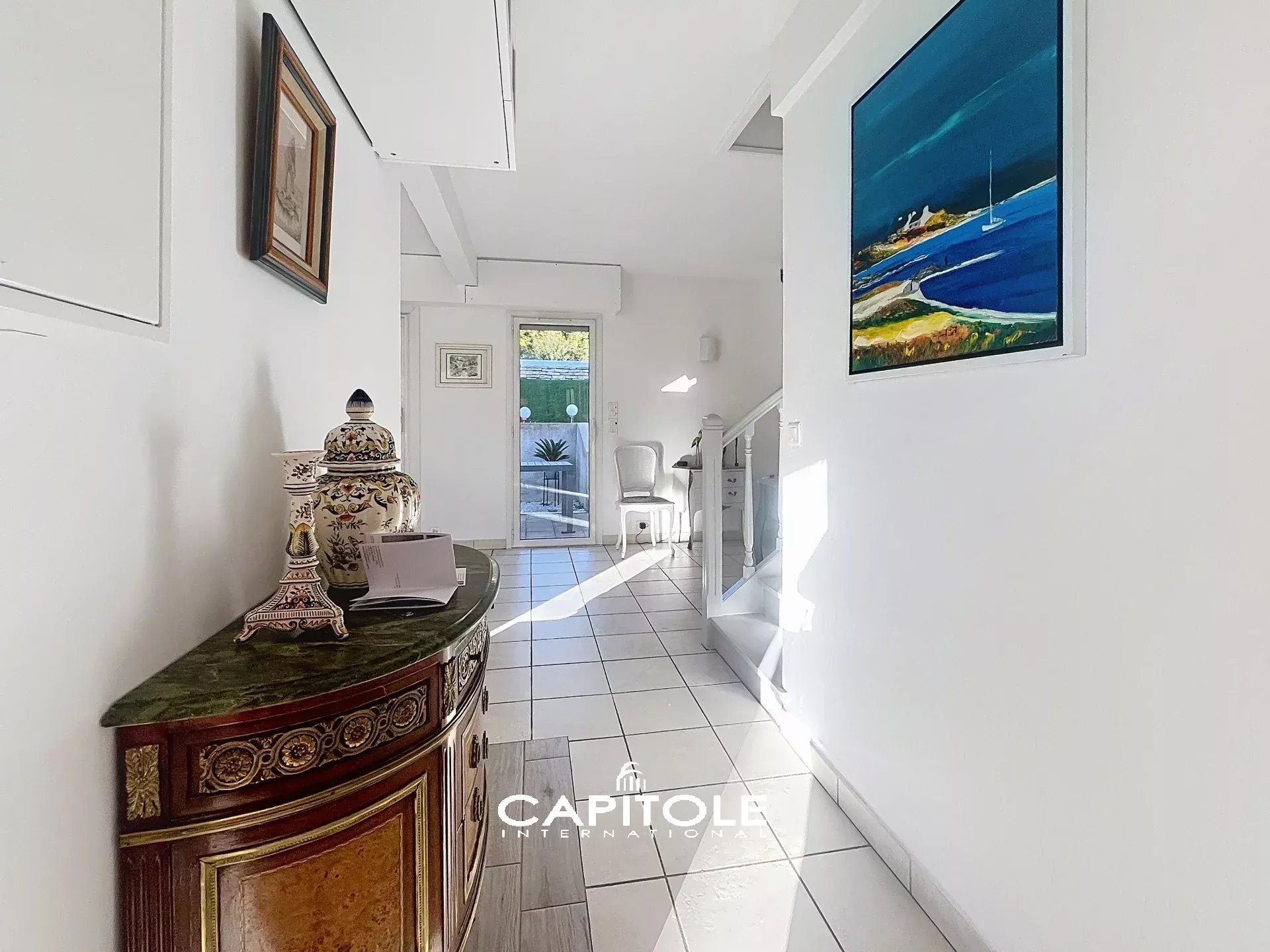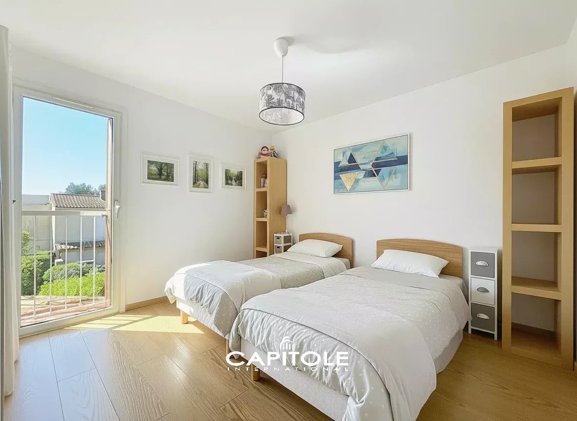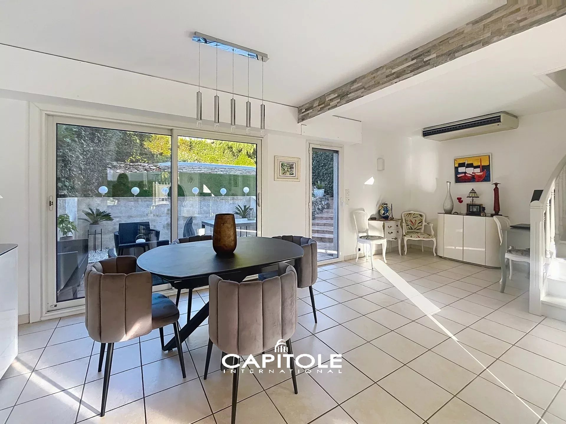 A VENDRE, dans un domaine fermé et sécurisé au calme découvrez cette charmante maison jumelée par le garage (25m2) entièrement rénovée, d’une surface de 93 m2, bénéficiant d’une excellente exposition. La maison se compose d’un agréable séjour lumineux, avec salle à manger ouvrant sur l’extérieur avec une belle terrasse, cuisine équipée, toilette invité. À l’étage, vous trouverez trois chambres (dont un bureau) ainsi qu’une grande salle de douche à l'italienne avec WC. Une belle terrasse de 11 m2, permet de profiter pleinement des beaux jours. Implantée sur un terrain d’environ 350 m², la maison dispose d’une piscine privative, idéale pour les moments de détente en toute intimité. Un garage de 25m2 complètent ce bien, avec une belle hauteur sous plafond, offrant de nombreuses possibilités de rangement ou d’aménagement. Une villa clé en main, parfaitement entretenue, idéale en résidence principale comme secondaire, alliant confort. Place de parking invité. réf MM1986VM