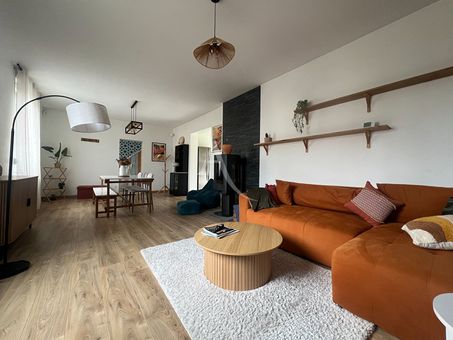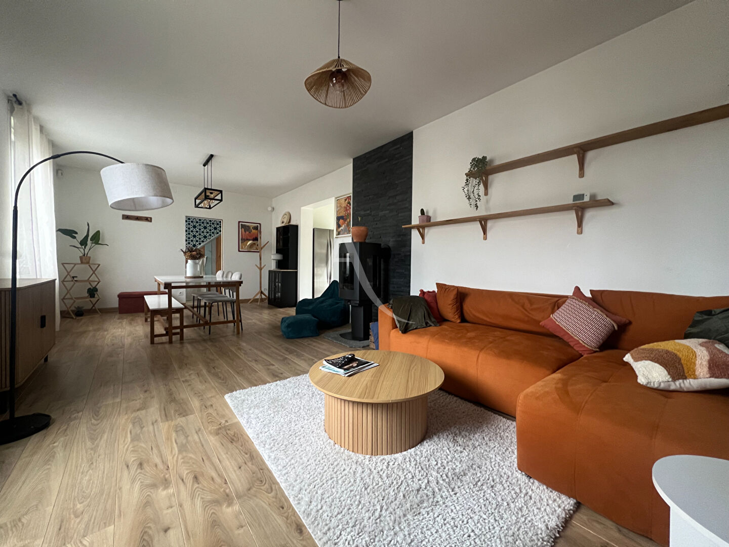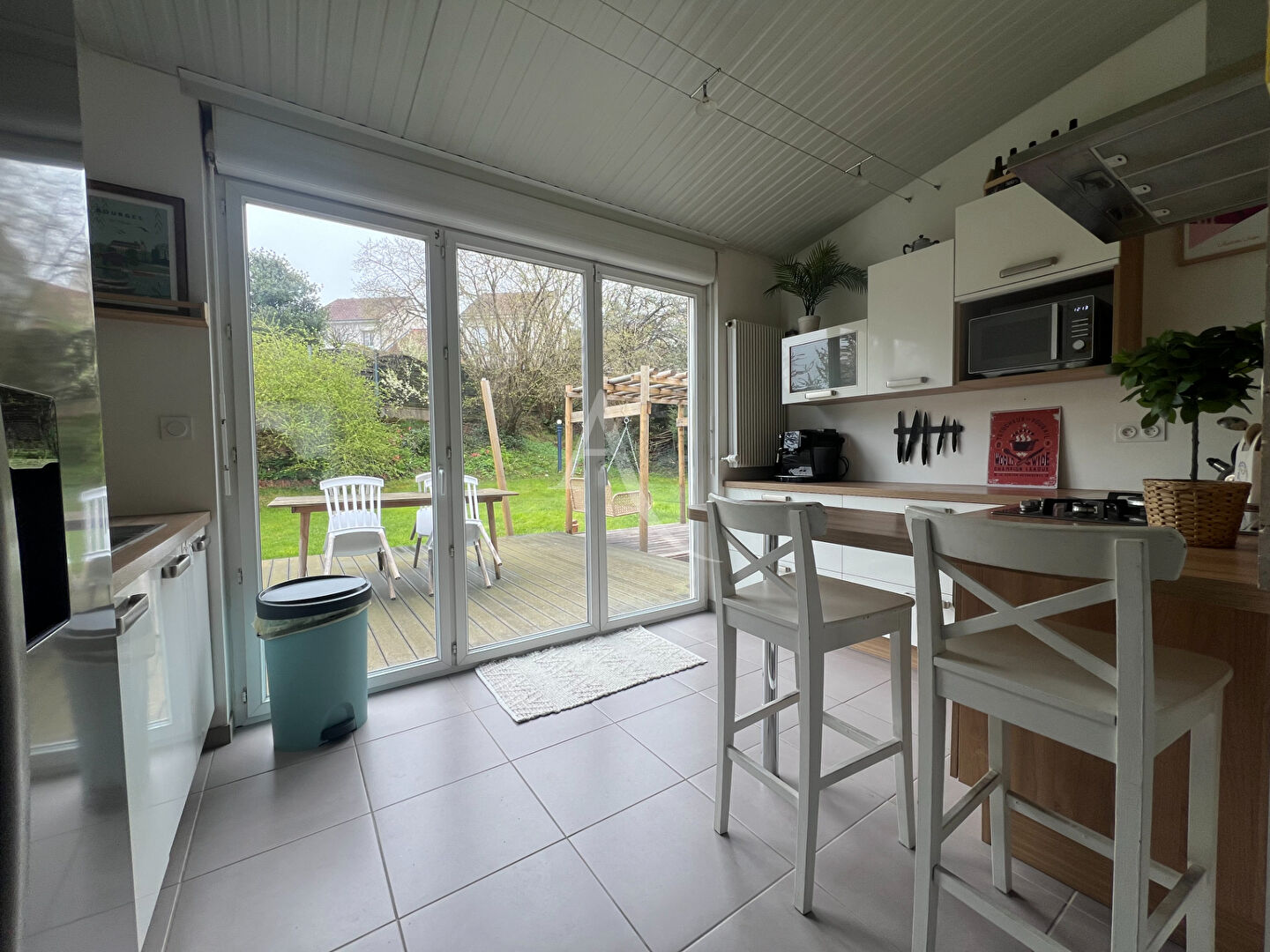 Magnifique maison année 30 entièrement rénovée et relookée avec soin par les propriétaires actuels. Bâtie sur un terrain d'un peu plus de 700 m2 en léger surplomb de la ville, cette maison offre en rez-de-jardin un séjour lumineux en partie ouvert sur la cuisine donnant directement sur la terrasse par sa grande baie vitrée. Le poele à bois dans le séjour assure un esprit cocooning des plus réussi. Sur ce même niveau vous trouverez un toilette indépendant et un second accés direct à la terrasse via une pièce d'eau avec douche italienne et meuble vasque, dissimulant dans de larges placards toute la partie technique de la maison : chaudière Gaz Frisquet, tableau électrique, coin lingerie avec machines à laver et sécher le linge. Depuis l'entrée vous accéder au premier étage par le clocheton de la maison aménagé en espace bureau du plus bel effet, avec accés à un balcon offrant une belle vue sur la ville. La partie nuit se compose d'une salle de bains lumineuse avec meuble double vasque, baignoire et WC, et d'un dégagement distribuant les deux chambres (dont une avec dressing). En dépendance la maison dispose d'un garage à vélo- cellier extérieur pour les éléments de jardin (outils, tonte...) ainsi qu'une cave sur la quasi-totalité de la maison. Stationnement dans la propriété avec une grande aire pouvant accueillir facilement 3 voitures. C'est maison est un vrai cocon ouvert sur jardin, proche de la ville, sans travaux à venir et avec des frais de fonctionnement optimisés par les travaux récents. N'hésitez pas à nous contacter pour tout complément. Louée meublée (2 chambres avec lit et armoires dressing, une salle d'eau, une salle de bains équipées, salon avec canapé, TV, table de salle à manger, chaises et banc, vaisselier, cuisine avec tabourets hauts, électroménager : LV, four, plaque, hotte, réfrigérateur, salon de jardin et aménagement terrasse.) Disponible maintenant.