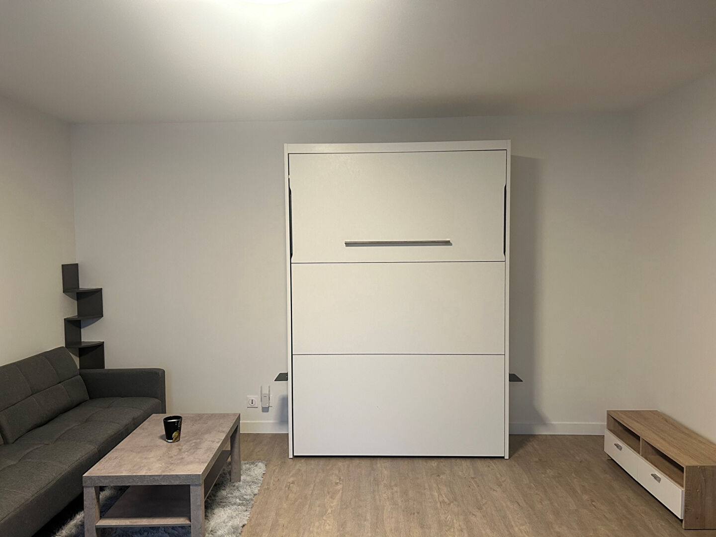 Dans petite résidence, joli studio meublé, coin nuit avec lit escamotable, cuisine équipée avec table et chaises, salle de douches avec wc, placards, balcon . En annexe: cave et place de parking chauffage individuel électrique , et eau froide également disponible le 15 Avril