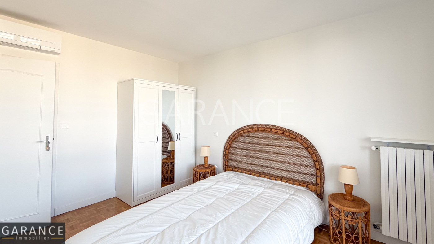 Il se compose d'une entrée avec rangements, d'un séjour lumineux, d'une cuisine indépendante entièrement équipée (lave-linge, lave-vaisselle, four, plaques de cuisson, table et nombreux rangements), d'une chambre avec placards intégrés, ainsi que d'une salle de bains et de WC séparés. Un dressing vient compléter les espaces de rangement. L'appartement est également équipé d'une climatisation, garantissant un confort optimal en toute saison.