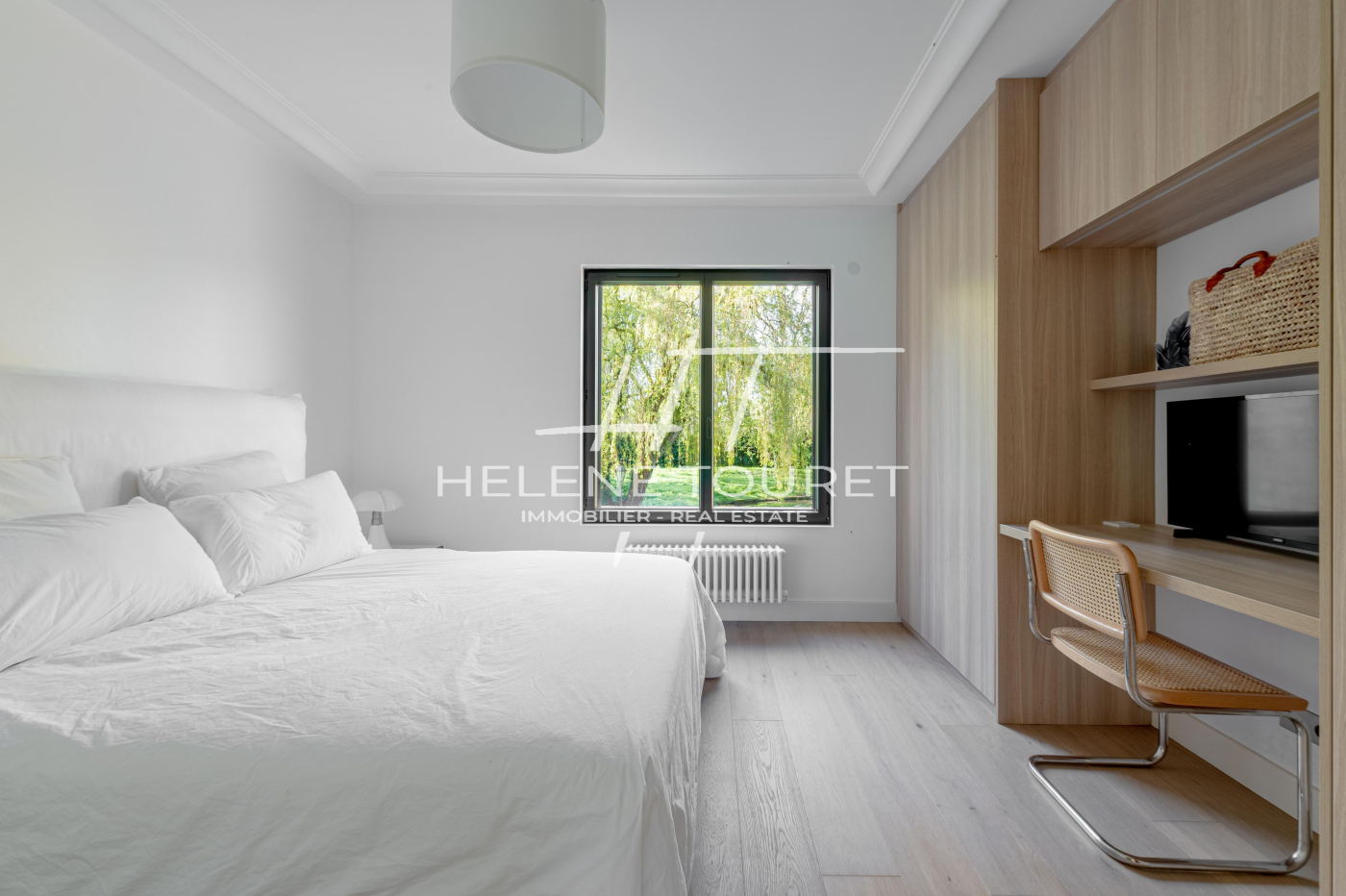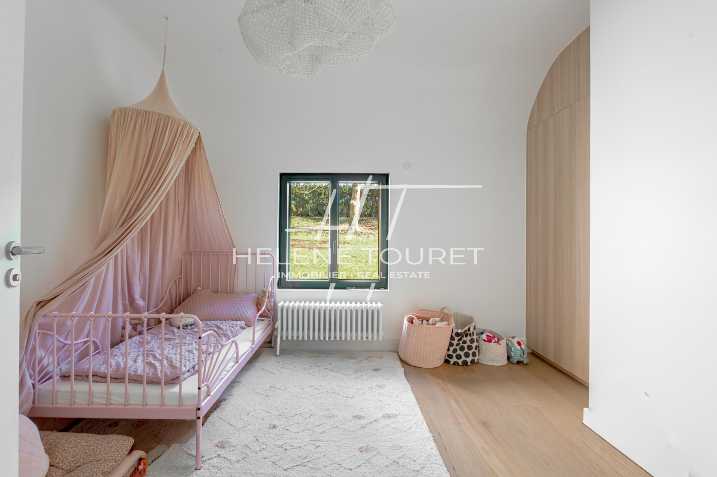 À l'étage, la somptueuse suite parentale, avec sa salle de bains privative et son dressing sur mesure, offre une bulle de sérénité, baignée de lumière naturelle.
