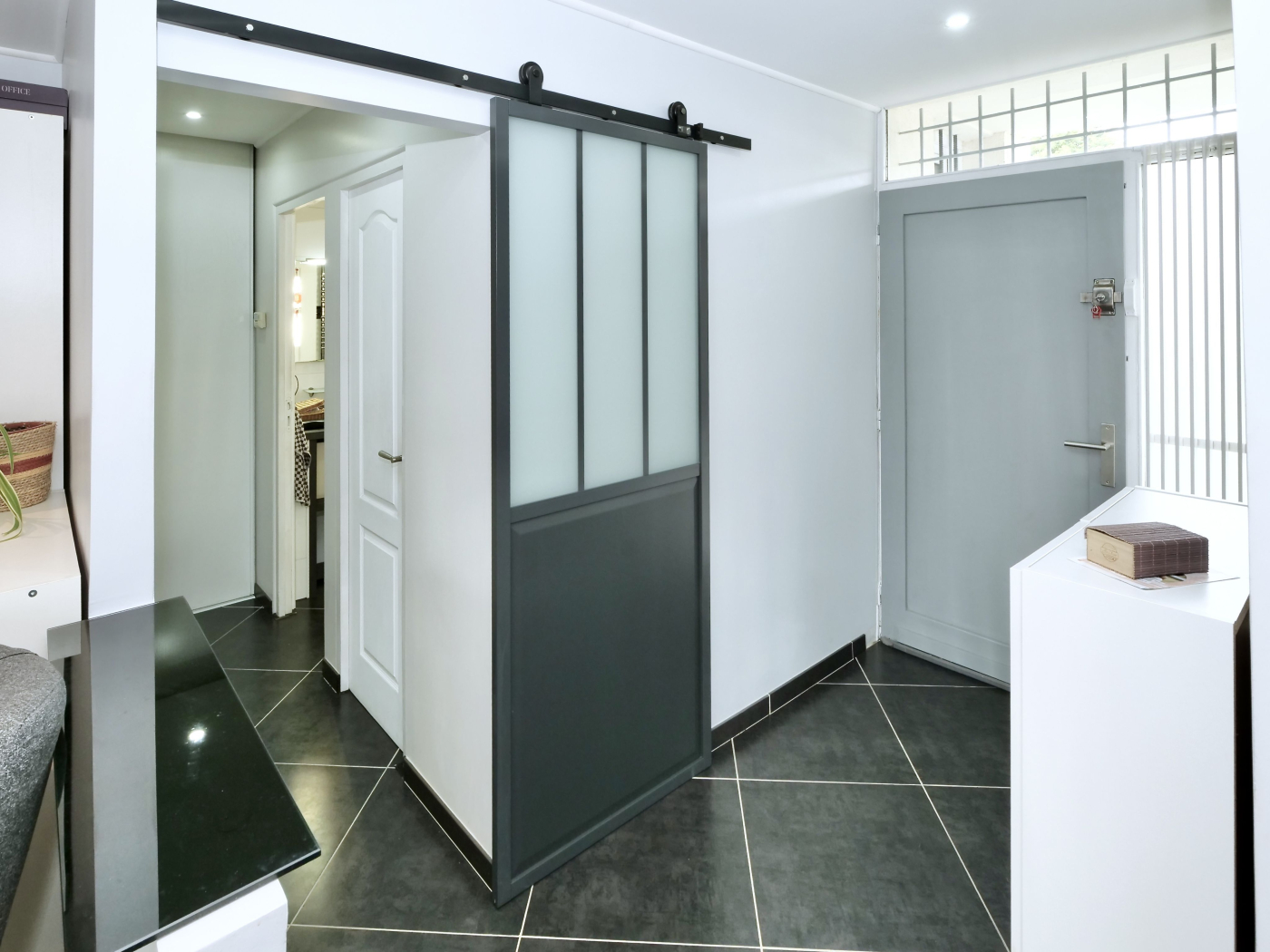 Grand séjour avec cuisine ouverte aménagée et équipée, espace salon. 2 chambres, long couloir avec nombreux placards/rangements, Wc séparé, salle de bains avec douche.