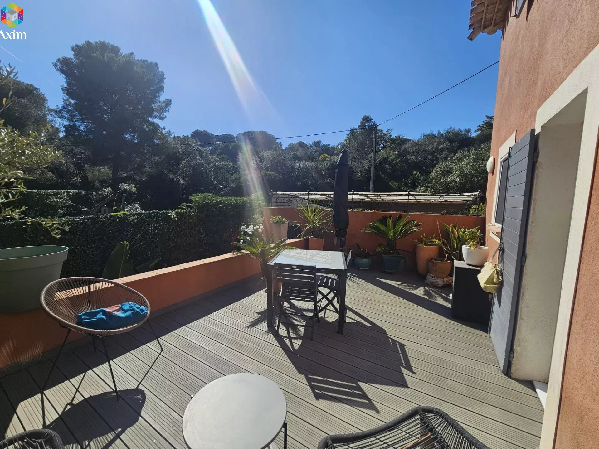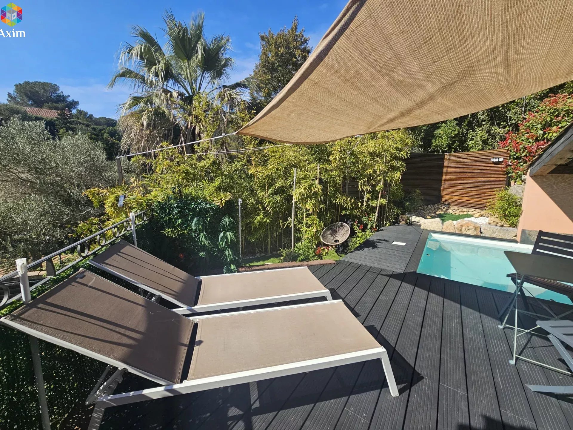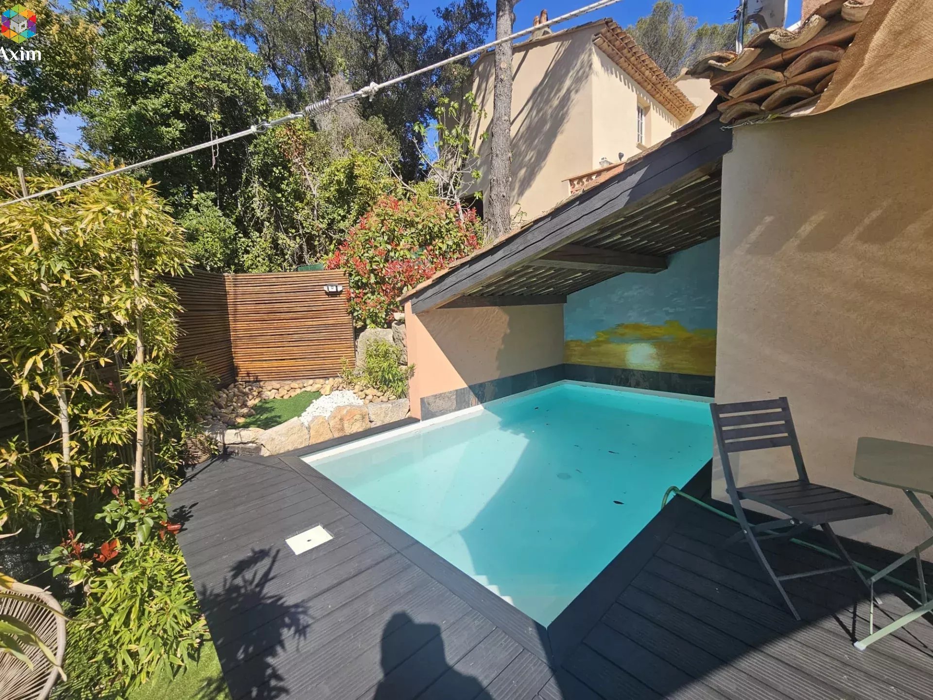 À l’extérieur, de nombreuses terrasses permettent de profiter pleinement du climat méditerranéen, complétées par une agréable piscine semi-couverte et ombragée, idéale pour des moments de détente en toute intimité.