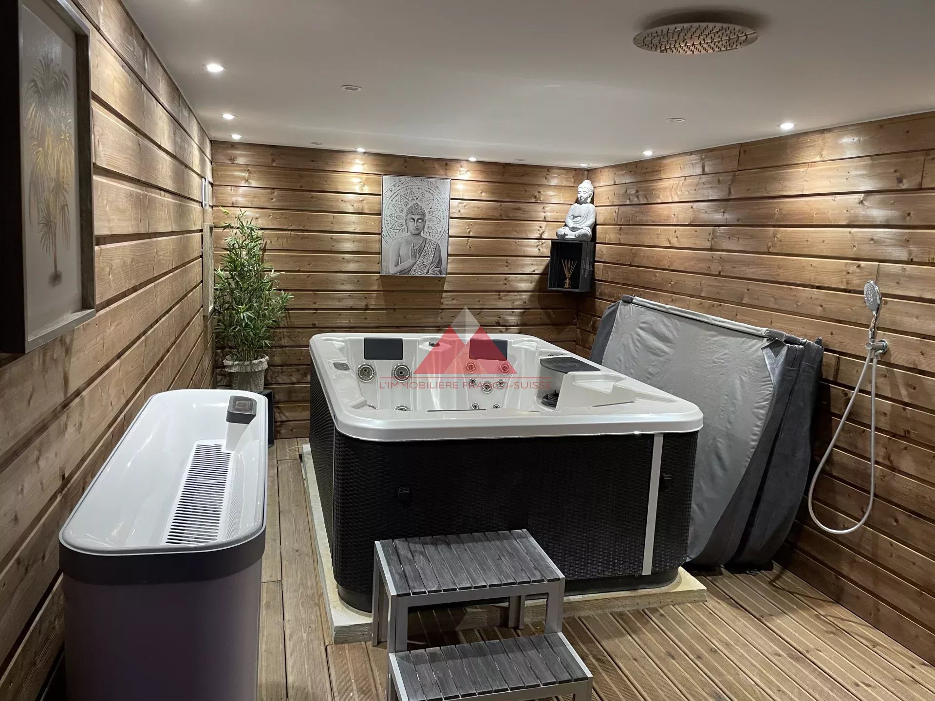 Pour votre détente, vous pourrez profiter de l'espace "bien être" avec un spa, un sauna et une douche zénithale ouverte, le tout dans un décor tout en bois aux teintes chaleureuses !