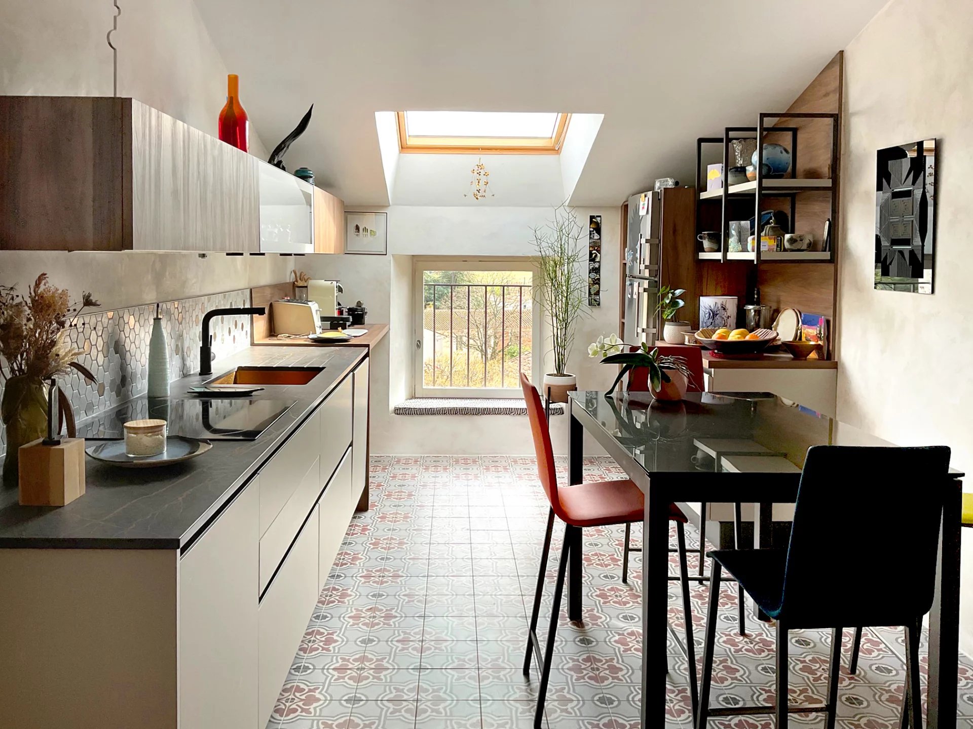 Les tomettes brutes ou vernies croisent le verre qui se mêle au bois, à la chaux, aux poutres d'origine patinées par le temps.