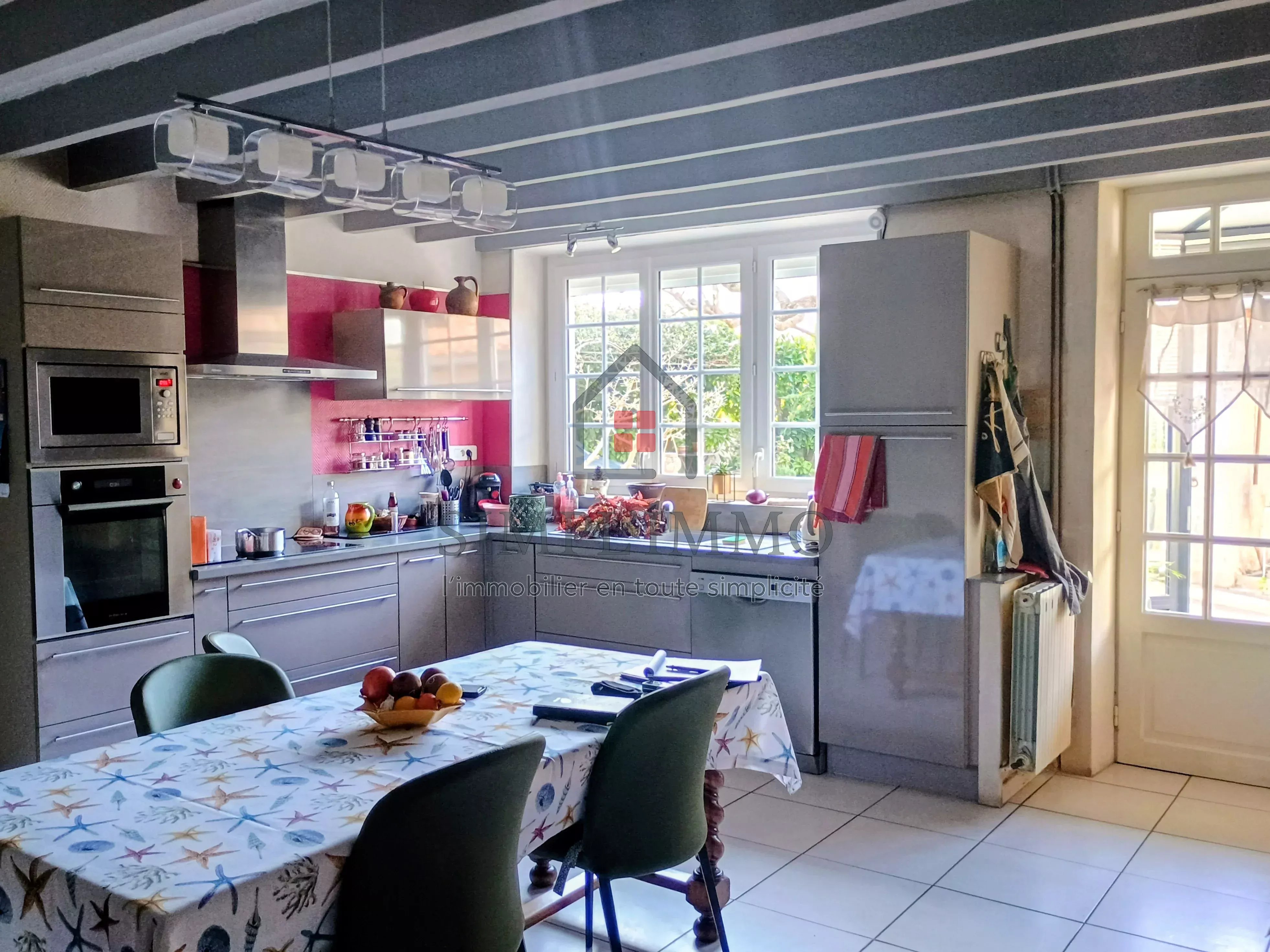 Elle se compose d’une belle cuisine aménagée, conviviale et fonctionnelle, avec un grand salon lumineux, idéal pour partager des moments en famille ou entre amis.