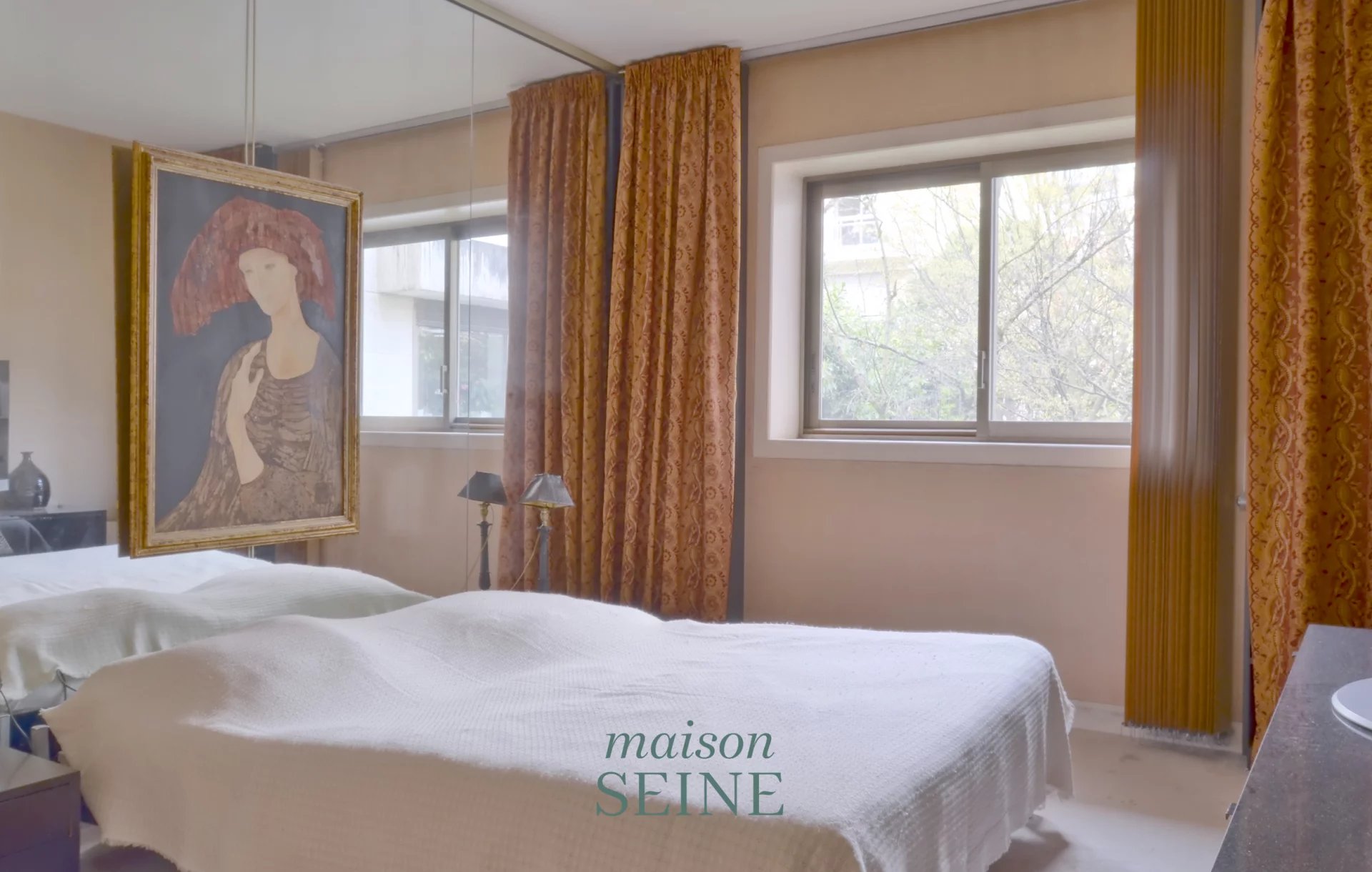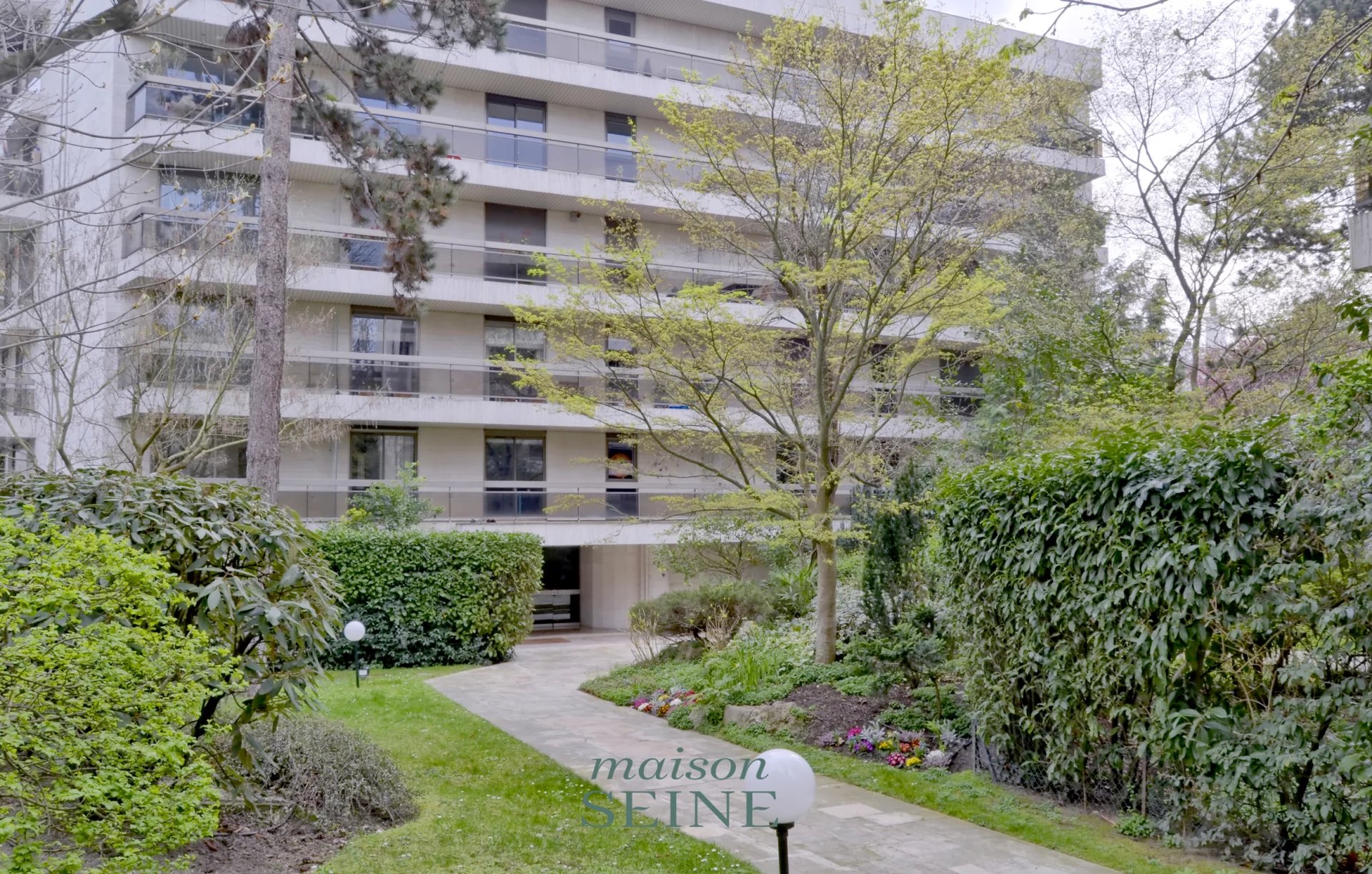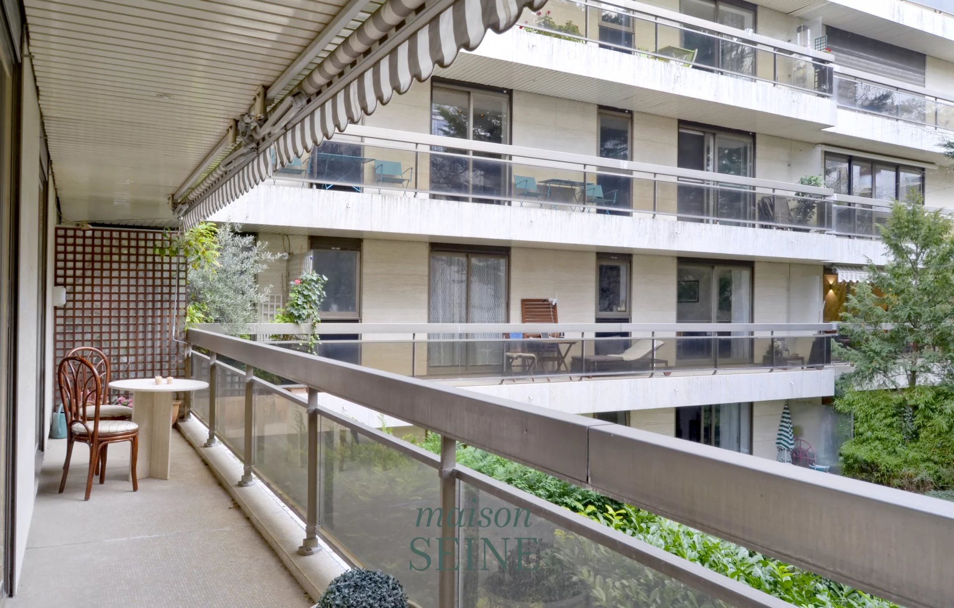 Idéalement situé dans un immeuble sécurisé, semi-récent de bon standing avec gardien et ascenseur, appartement traversant de 98,03 m² carrez au calme absolu entièrement sur jardin bénéficiant d'un grand balcon d'angle de 25 m².