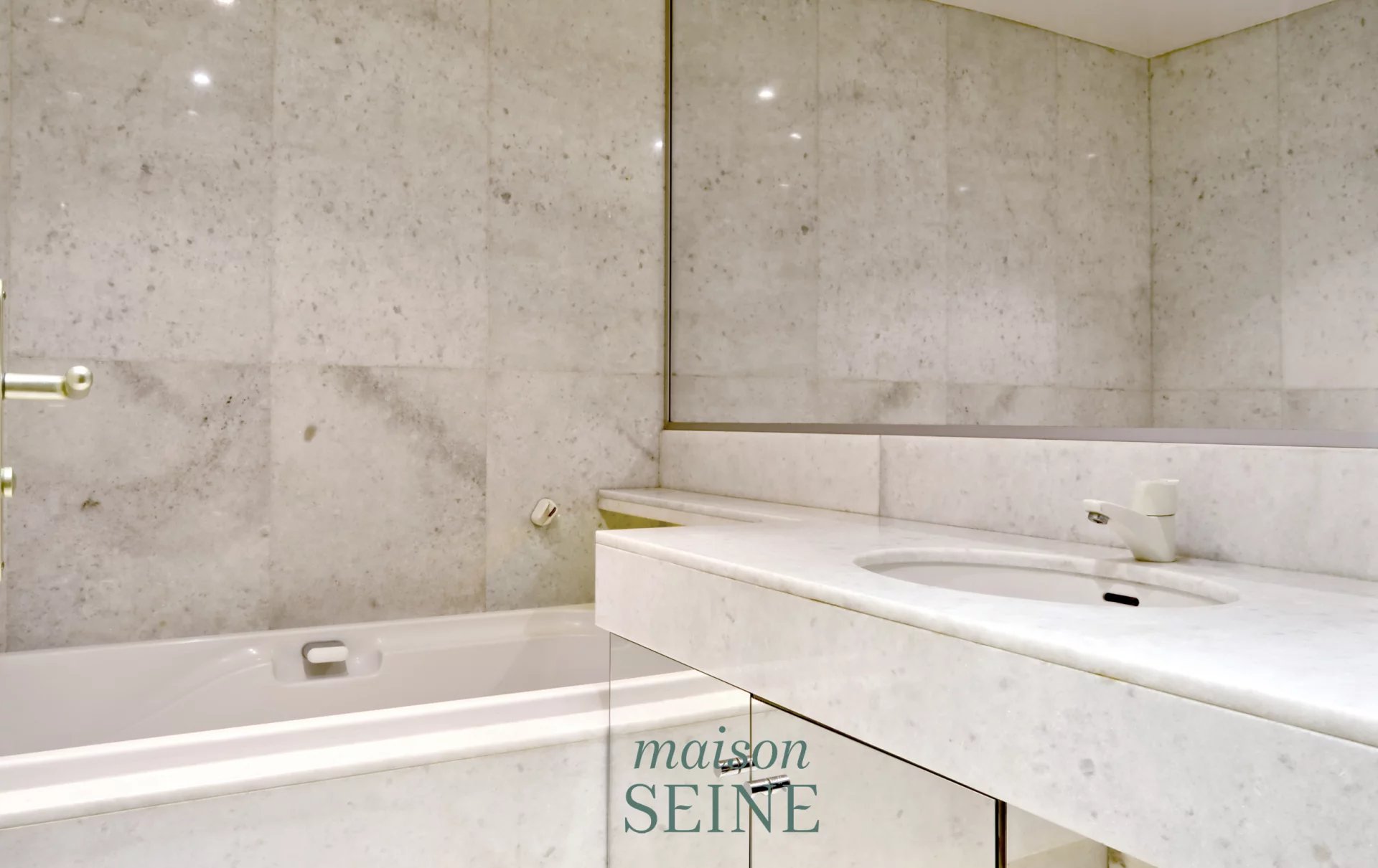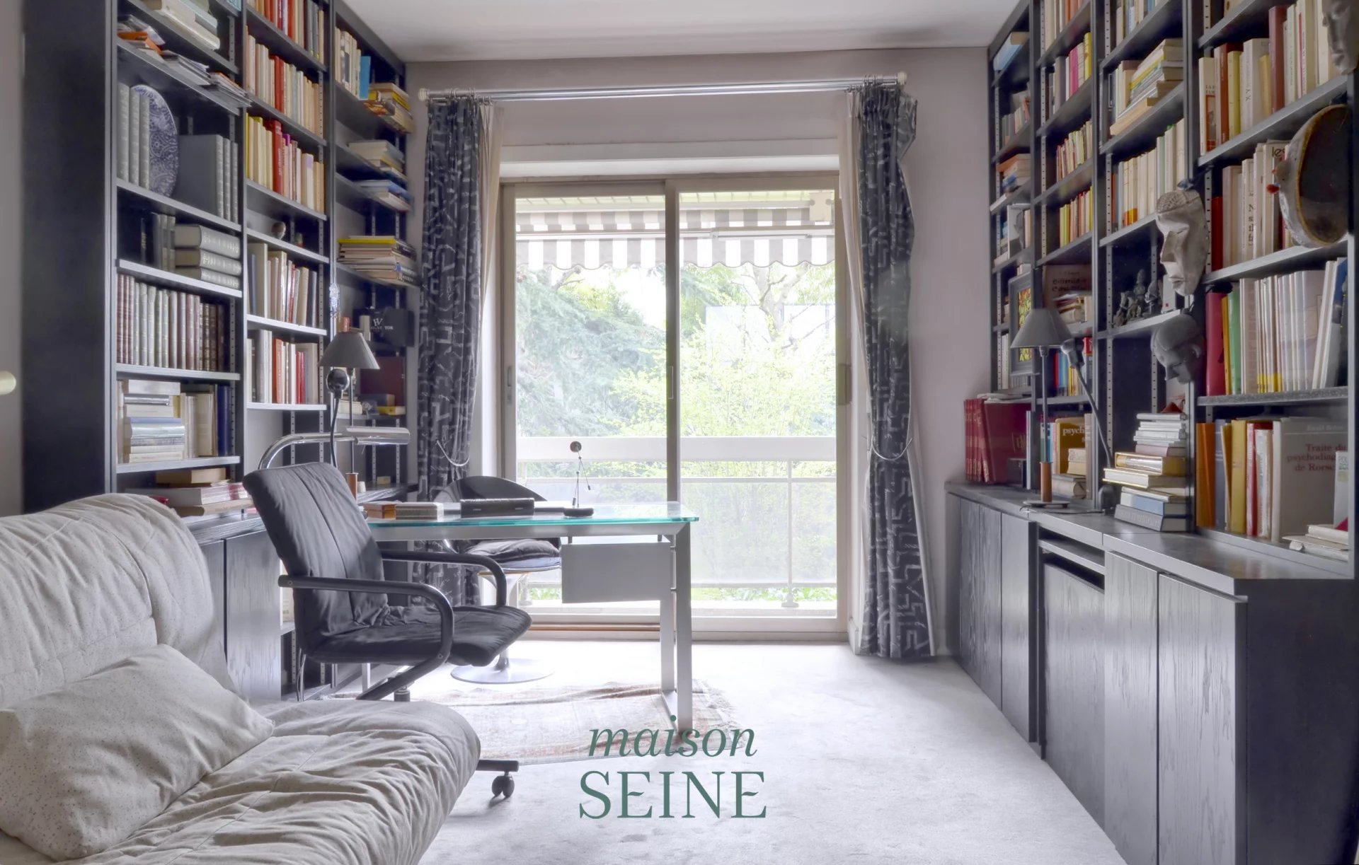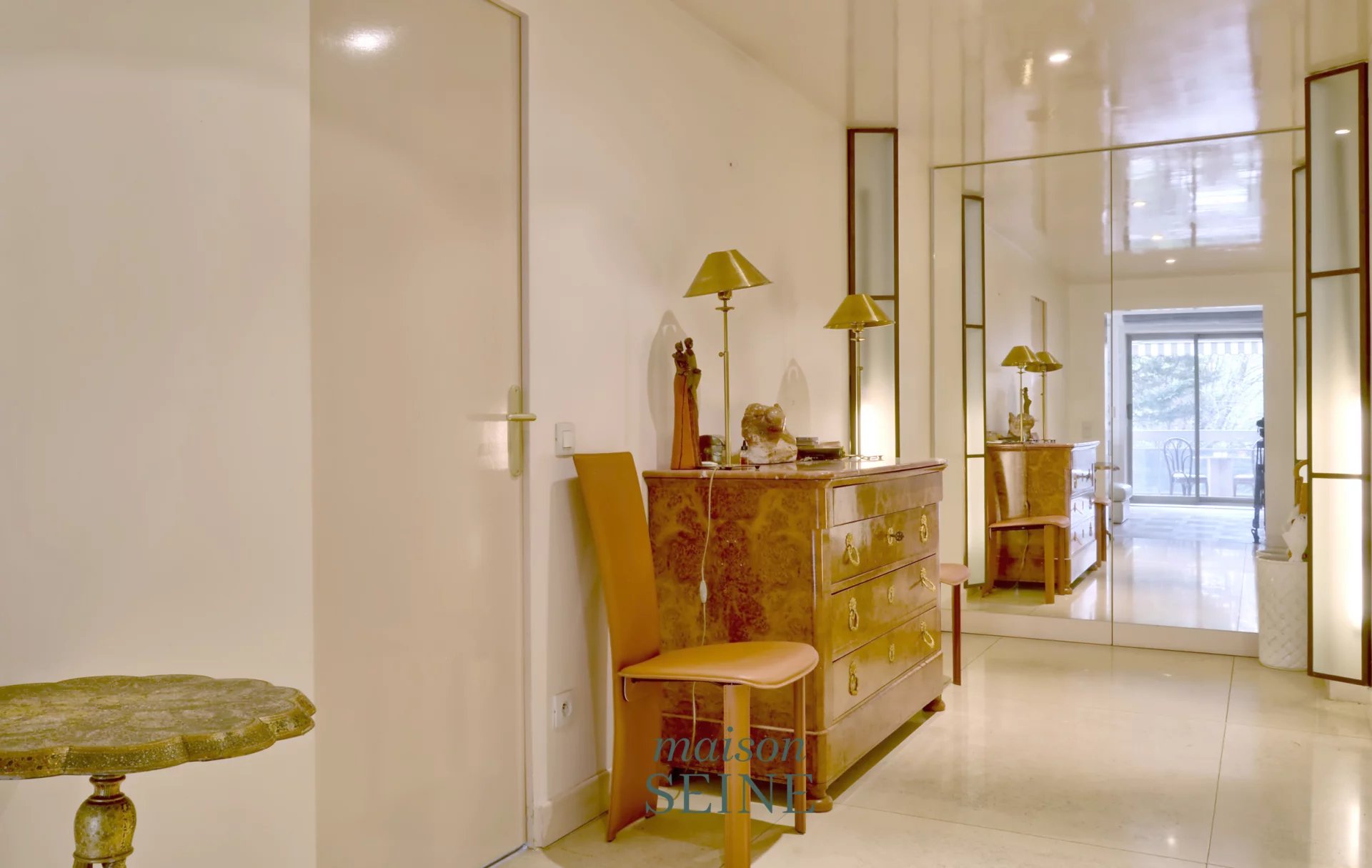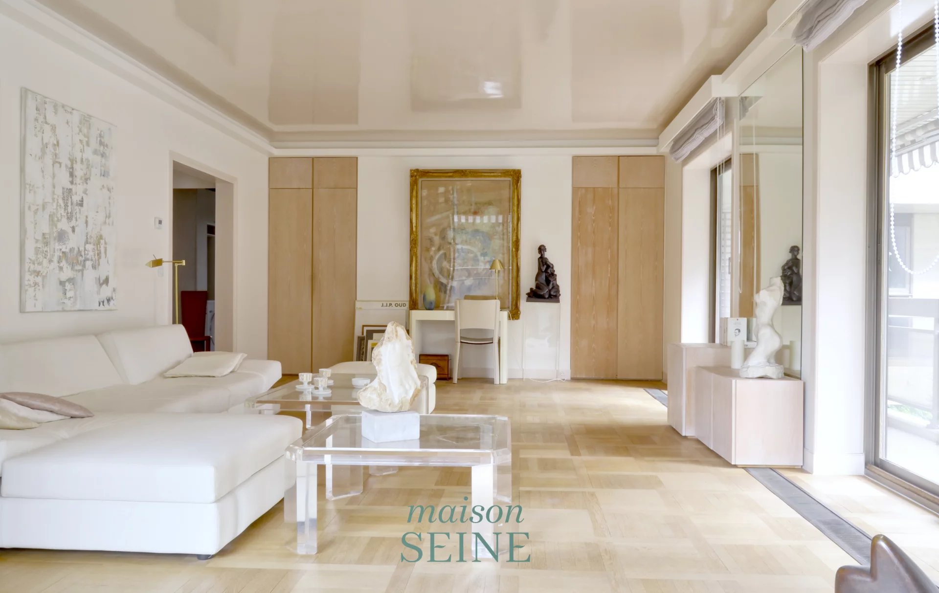 Idéalement situé dans un immeuble sécurisé, semi-récent de bon standing avec gardien et ascenseur, appartement traversant de 98,03 m² carrez au calme absolu entièrement sur jardin bénéficiant d'un grand balcon d'angle de 25 m².