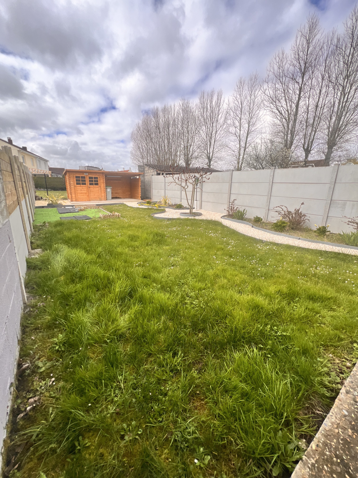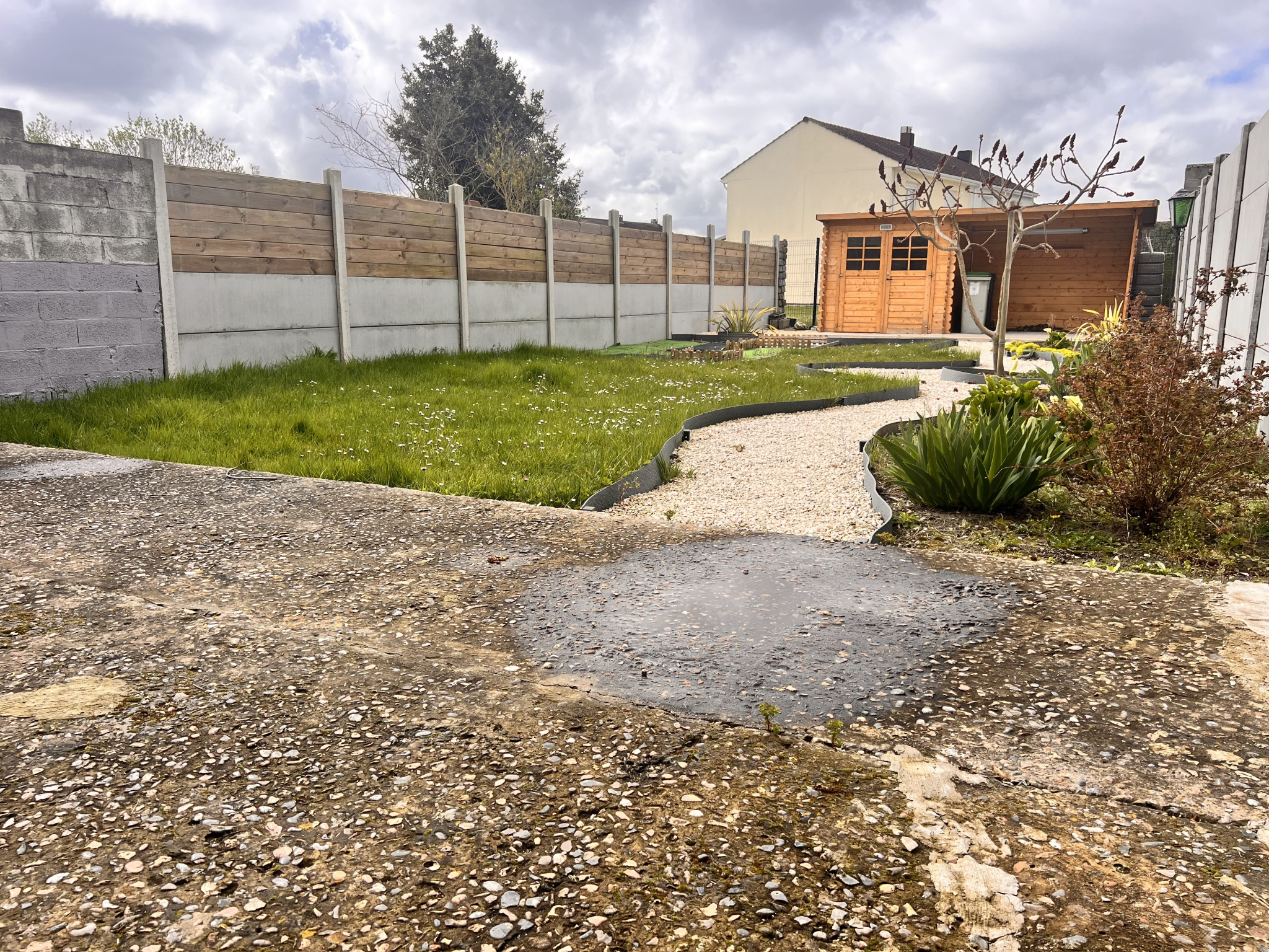 Beau jardin cloturé avec terrasse et dépendance + place de parking sur le devant de la maison.