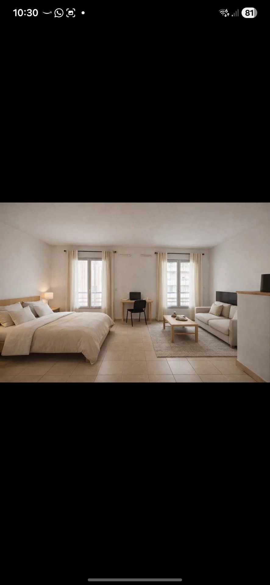 Son agencement permet d’organiser distinctement un espace nuit, un coin séjour et un espace repas ou bureau, comme illustré par le home staging proposé.