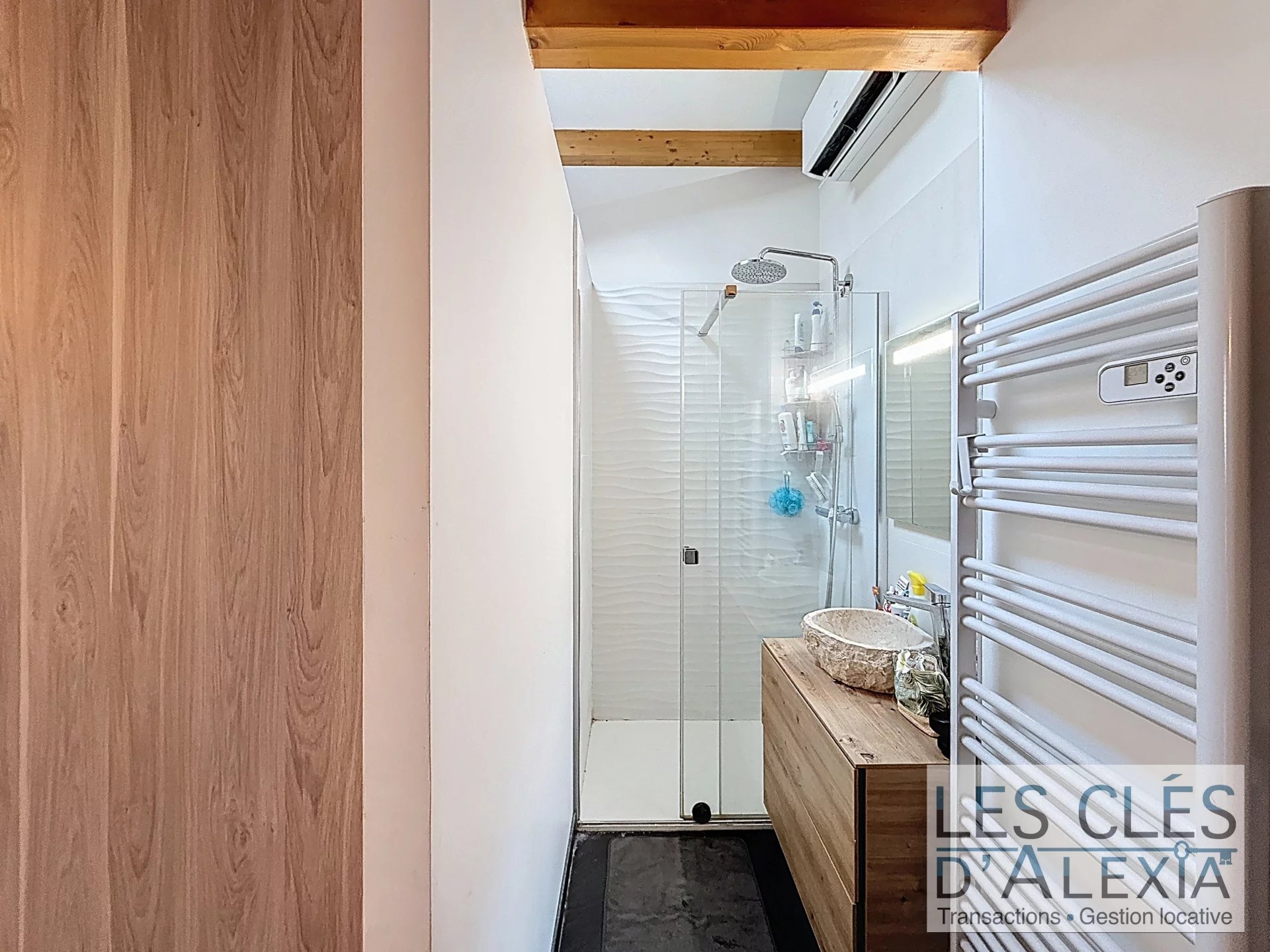 Dès l’entrée, le rez-de-chaussée dévoile un espace de vie convivial et ouvert, composé d’une cuisine avec coin repas, prolongée par un séjour chaleureux. Un mur en pierre apparente vient souligner le caractère du lieu. Une suite parentale avec salle d’eau complète ce niveau, offrant un vrai confort au quotidien.