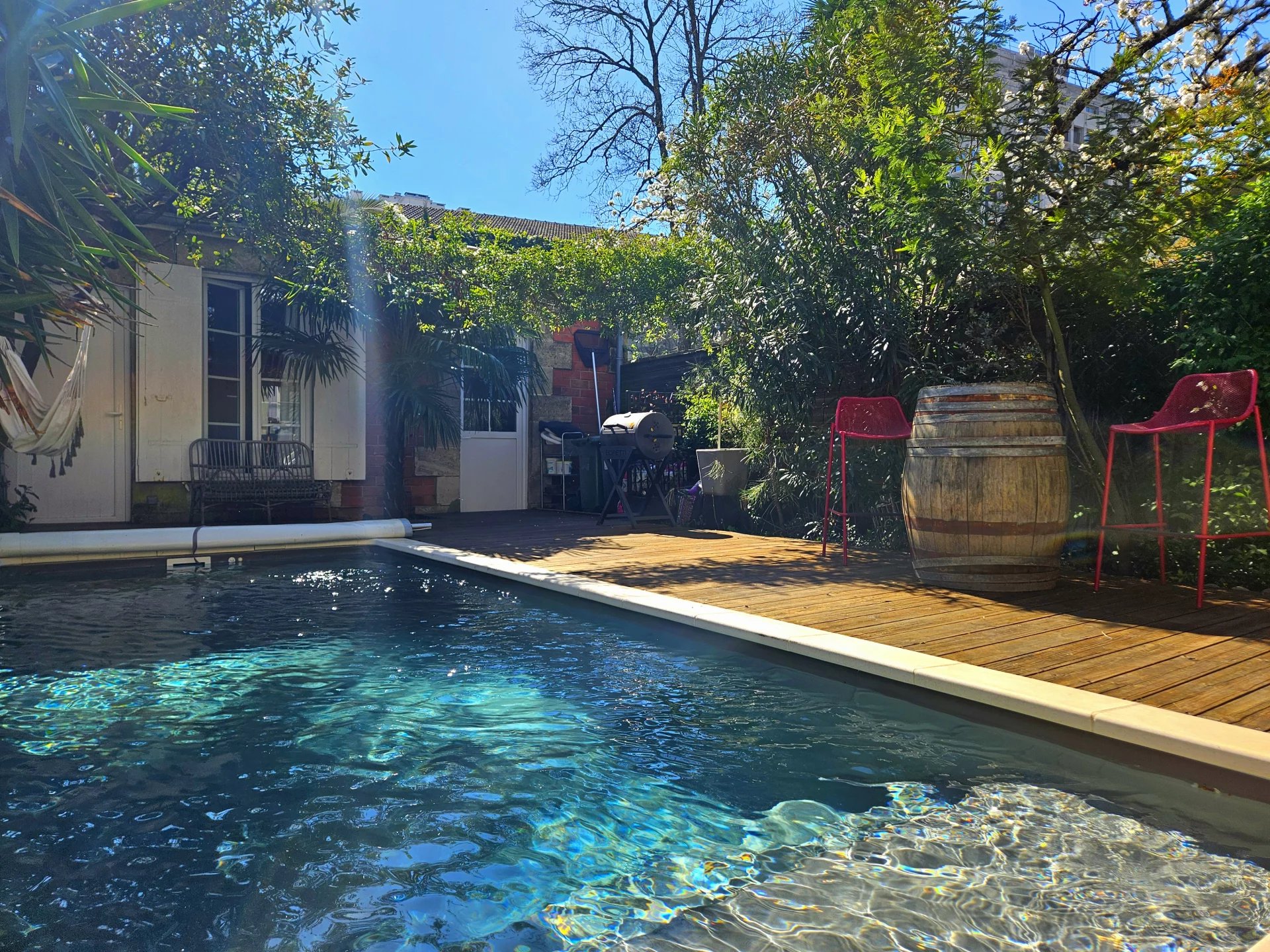 À l’extérieur, un espace parfaitement aménagé vous invite à la détente avec une piscine élégante, véritable havre de paix à l’abri des regards.