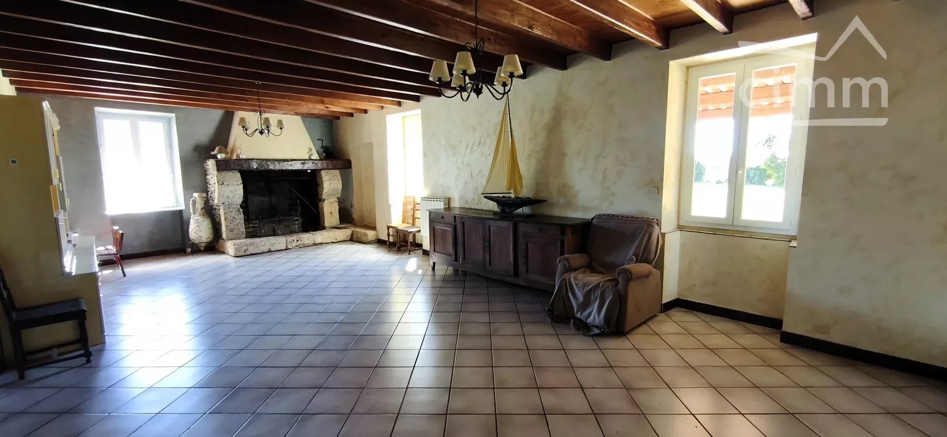 Au cœur de la propriété, la maison principale en pierre déploie 215 m² de surface habitable sur plusieurs niveaux. Elle s'articule autour d'une somptueuse pièce de vie de 100 m², véritable cœur battant de la demeure, baignée de lumière naturelle.