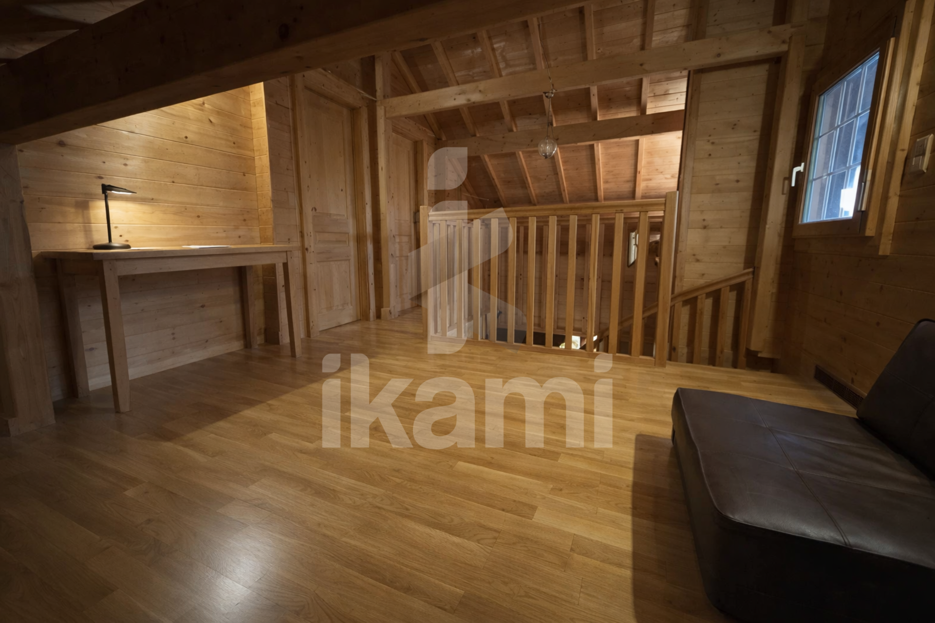 L'étage se compose d'une belle mezzanine ouverte sur un bureau, d'un espace nuit sous pente (coin lit cocooning) et deux chambres mansardées avec balcon.