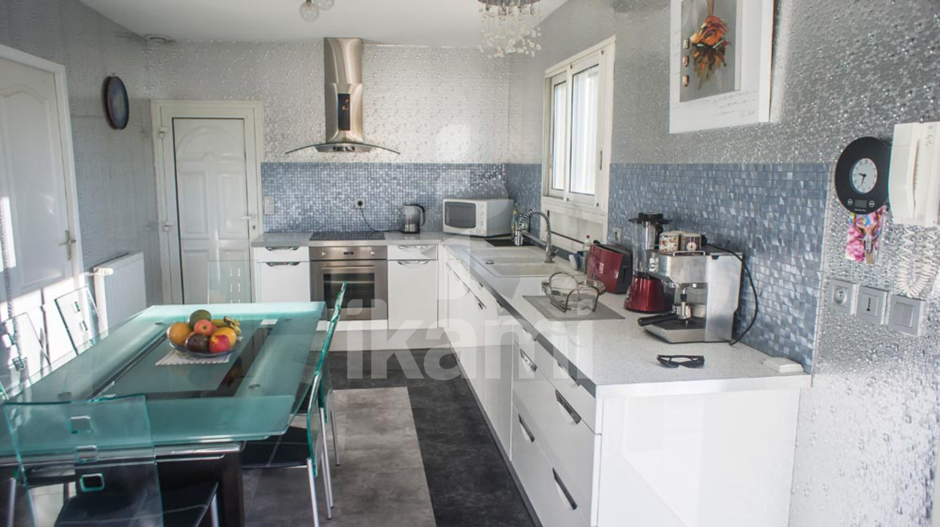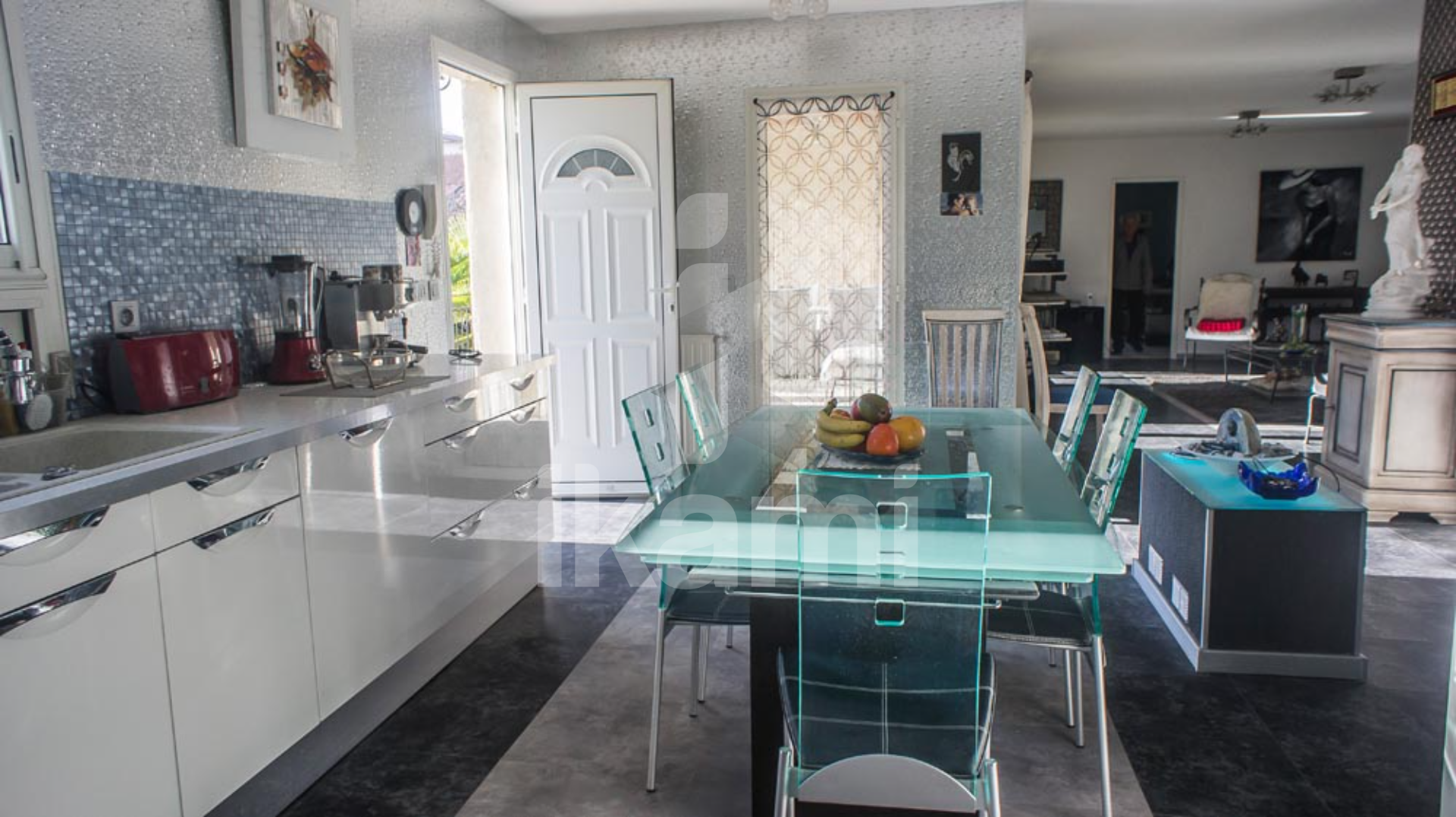 La grande cuisine équipée de 26 m2 est ouverte sur un vaste séjour de 34 m2, donnant accès à une belle terrasse de 39 m2 exposée Sud. Un grand garage de 38 m2 est également disponible.