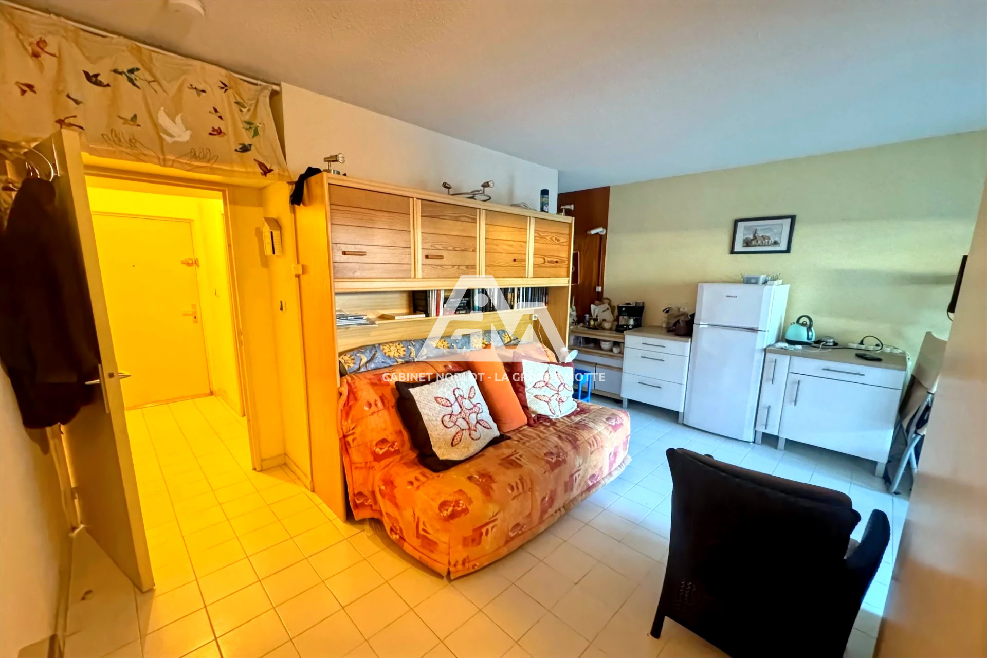 Au Golf - Dans une résidence avec piscine - Studio cabine de 33 m ² (28.86 m ² loi carrez) avec 4 m ² de loggia vitrée plus une terrasse et un jardinet - En rez de jardin - Comprenant : entrée, salle de bain avec wc, cabine, séjour, kitchenette avec placard - Bon état, à moderniser - Exposé est - Vue sur verdure - Possibilité d'un grand garage de 23 m ² en plus