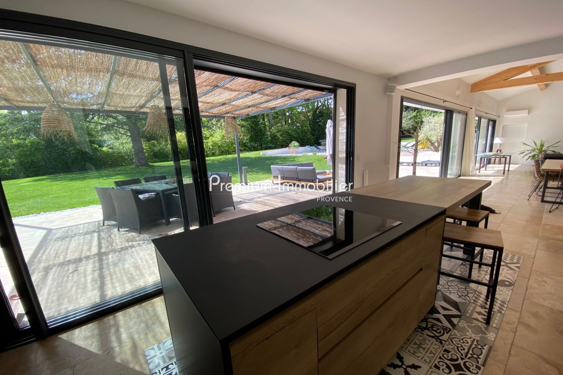 Superbe maison contemporaine à vendre Aix en Provence nord, à seulement 4km du centre ville. Premium Immobilier Provence vous présente à la vente cette belle propriété entièrement rénovée en 2020 située au calme dans une résidence sécurisée. D'une surface d'environ 220 m² incluant un studio indépendant de 18m2, elle bénéficie d'une exposition Sud et offre une vue apaisante sur le jardin paysagé. L'espace de vie principal avec sa cuisine aménagée semi-ouverte, déploie une superficie de plus de 80m² avec une grande hauteur sous plafond de 4,35m. Vous profiterez de six chambres (dont 3 suites), une salle de bain, trois salles de douche, quatre toilettes, ainsi que de multiples prestations haut de gamme dont une magnifique piscine de 11x4m avec terrasse en bois exotique, la climatisation, un poêle à bois, une buanderie, un système d'arrosage et portail automatique. Le confort est optimisé grâce à un chauffage par pompe à chaleur. L'assainissement se fait par le tout-à-l'égout. Le tout sur un beau terrain arboré de 2095 m² avec terrain de pétanque, abris de jardin, un parking pouvant accueillir plus de 4 véhicules et un grand garage de 19m2. Proximité d'un arrêt de bus à 2mn à pied. Une propriété d'exception à découvrir rapidement.
