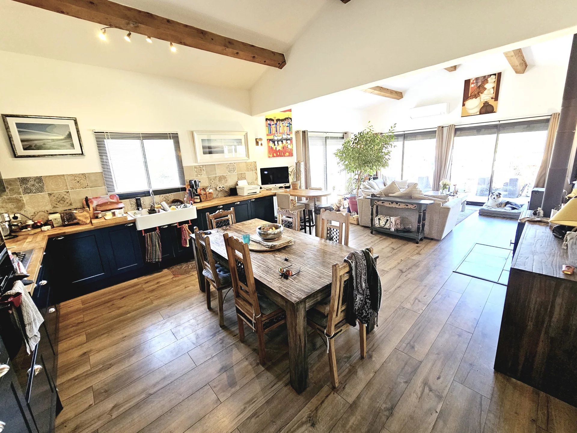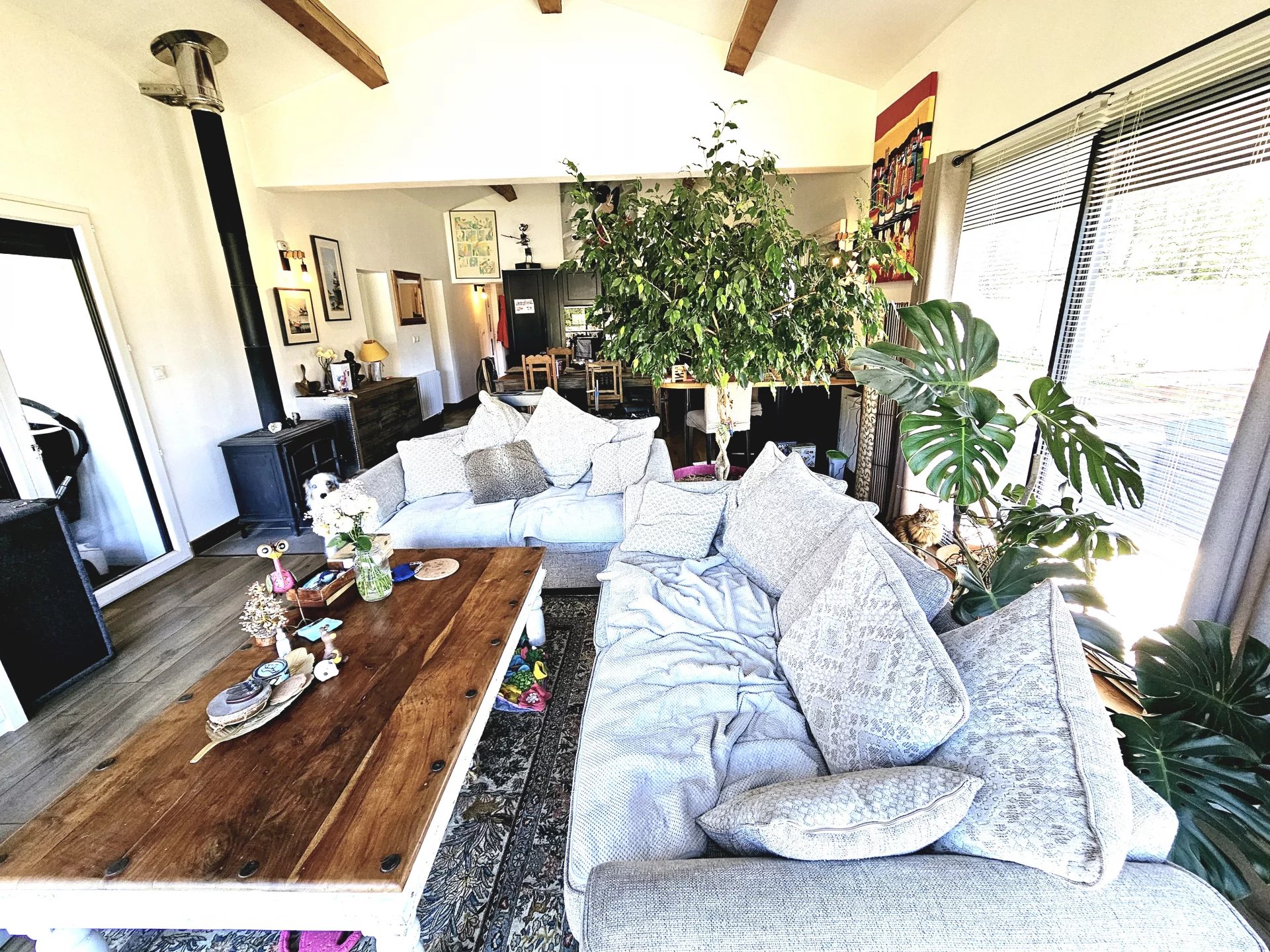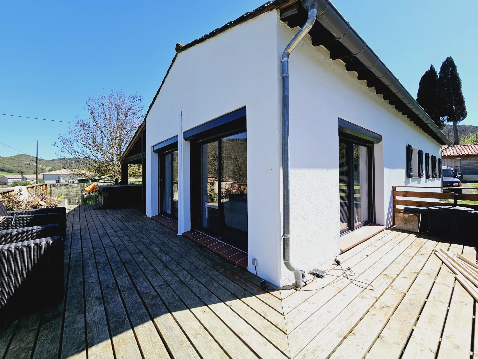 Située en bordure de Quillan, cette charmante villa offre 105,5 m² d'espace de vie spacieux, comprenant trois chambres confortables et un design contemporain élégant avec des accents rustiques. Le salon lumineux est agrémenté de poutres en bois apparentes, de grandes fenêtres coulissantes et d'une cheminée chaleureuse, créant le cadre idéal pour les réunions de famille. Les conforts modernes tels que la climatisation, le double vitrage et une connexion Internet fiable garantissent un niveau de vie élevé toute l'année. La cuisine ouverte et la salle à manger sont parfaites pour recevoir, avec un espace de comptoir suffisant et des finitions de qualité. Chaque chambre est soigneusement décorée pour maximiser la chaleur et la détente, avec beaucoup de lumière naturelle. La maison s'ouvre sans effort sur une grande terrasse extérieure, idéale pour les repas en plein air ou pour profiter de la vue sereine sur la campagne. Passez des week-ends tranquilles dans le jardin spacieux ou détendez-vous dans le jacuzzy privé après une longue journée. Le jardin clôturé, le garage et l'emplacement calme et paisible—avec de l'espace pour une maison mobile de 2/3 chambres—font de cette villa un mélange parfait de confort, de fonctionnalité et de charme. VIDÉOS DISPONIBLES SUR DEMANDE.