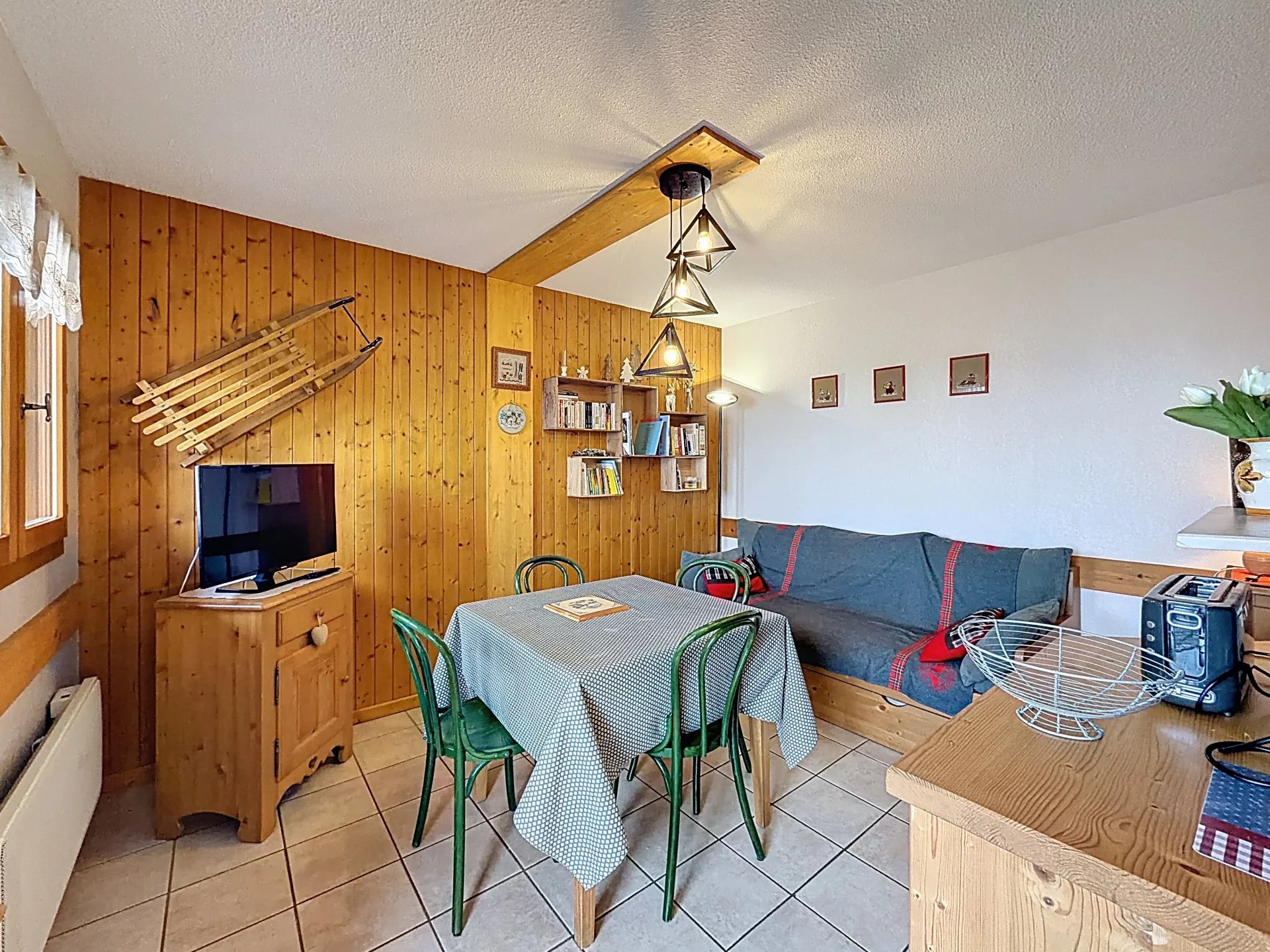 Situé à 4,5 k m de Combloux, au pied des pistes de ski l'hiver, dans un endroit calme et champêtre l'été, 2 pièces d'environ 32 m2 composé de : Une entrée, une chambre avec 1 lit 2 personnes et grand placard, wc, salle de bains, séjour avec 2 lits gigognes (80), coin cuisine équipée (four, 2 plaques électriques, frigo, lave vaisselle). Balcon vue Aravis donnant sur séjour et chambre. Garage box fermé, casier à ski porte de droite dans le garage numéro 16. - A régler lors de votre arrivée : Taxe de séjour et caution logement par carte bancaire uniquement. Services en option à prévoir avant l’arrivée (la semaine précédente) : - Linge de maison - Ménage fin de séjour - Location mini box wifi : 39.00 € la semaine dans la limite des stocks disponibles.