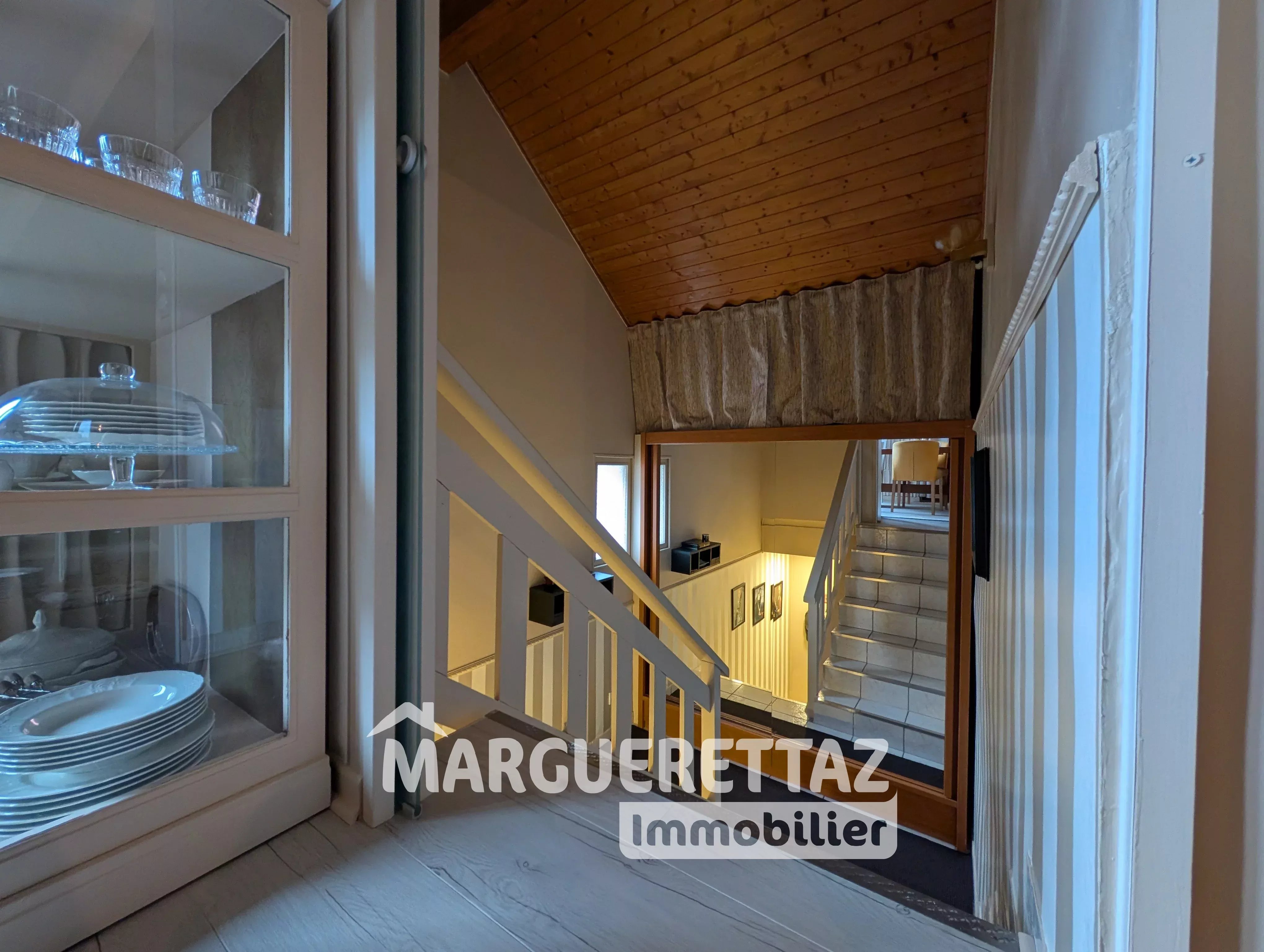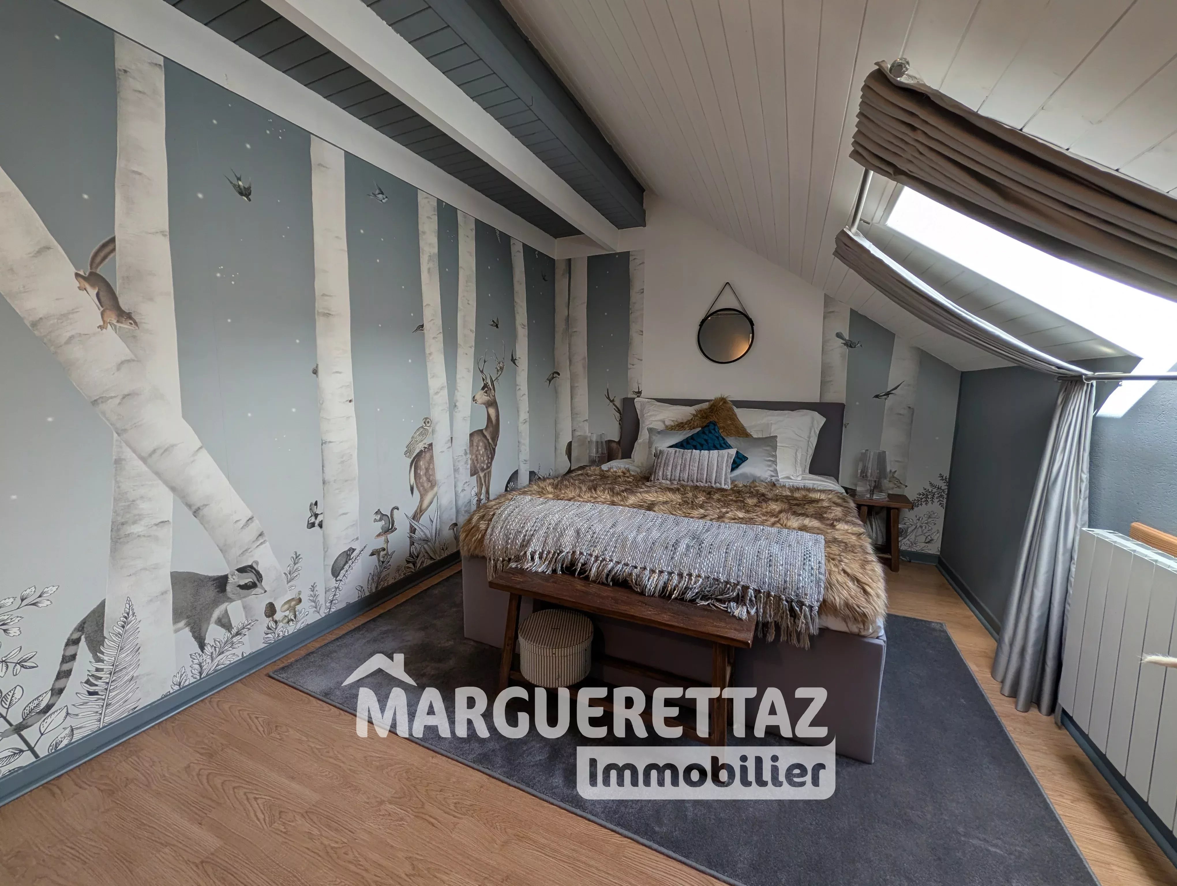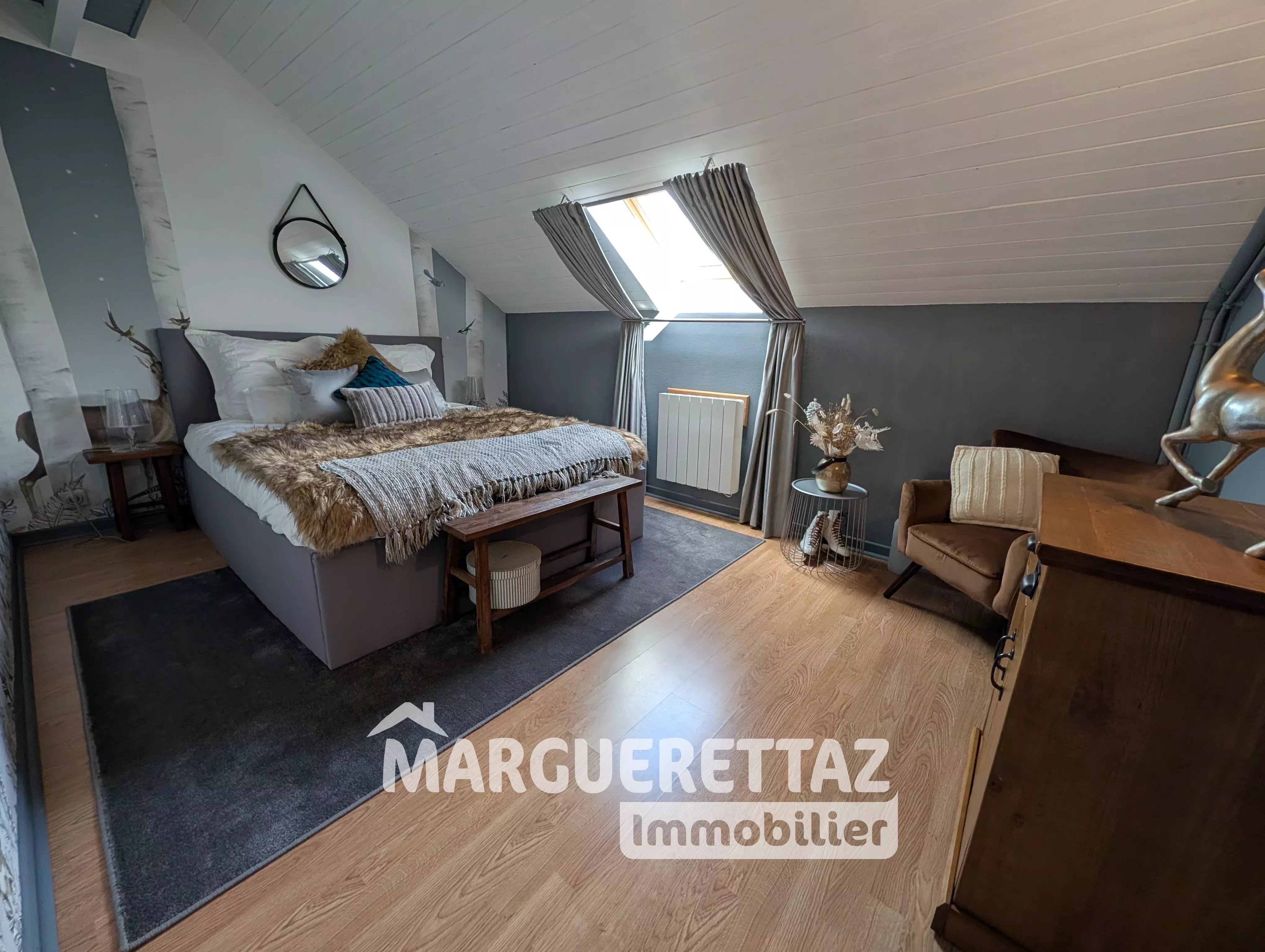 NOUVELLE EXCLUSITE A L'AGENCE Coup de cœur à ST JEOIRE pour ce joli T4 de 82 m² rénové en 2021, traversant, il est situé au dernier étage d'une petite résidence bien entretenue et entièrement rénovée en 2014 (faible charge 40 € / mois syndic bénévole). CE BIEN EST VENDU ENTIEREMENT MEUBLE (aucun travaux à prévoir). L'appartement se compose : D'une belle pièce de vie avec cuisine ouverte et équipée, placard de rangement, 3 chambres, une salle douche, un WC qui se compose: D'une grande entrée avec placard, une vaste pièce de vie mansardée ayant accès sur le balcon avec cuisine ouverte et équipée, 1 WC séparé, 1 salle de bain, 3 chambres avec placard, à l'étage une mezzanine servant de bureau, salon ou 4 éme chambre avec 1 grand dressing aménagé. 1 place de parking privative en extérieur et 1 cave complètent ce bien. (Pas d'ascenseur) A VISITER SANS TARDER ET POSER VOS VALISES !! Niveau de consommation énergétique : 226 kWh D Niveau émission des gaz à effet de serre : 8 kg B Montant estimé des dépenses annuelles d'énergie pour un usage standard : (entre 1 648 € et 2 230 € par an) Prix moyens des énergies indexés au 1er janvier 2021 Logement situé dans une copropriété loi n°65-557 du 10 juillet 1965. Nombre de lots principaux : (à confirmer). Montant moyen annuel de la quote-part de charges courantes : 500 euros / an. Aucune procédure en cours menée sur le fondement des articles 29-1A et 29-1 de la loi n°65-557 du 10 juillet 1965 et de l’article L.615-6 du CCH. BENTZ Sonia - Agent Commercial immatriculé au Registre Spécial des Agents Commerciaux (RSAC) du Tribunal de Commerce de Bonneville sous le numéro 399 391 853. Les informations sur les risques auquel ce bien est exposé sont disponibles sur le site Géorisques : www.georisque.gouv.fr