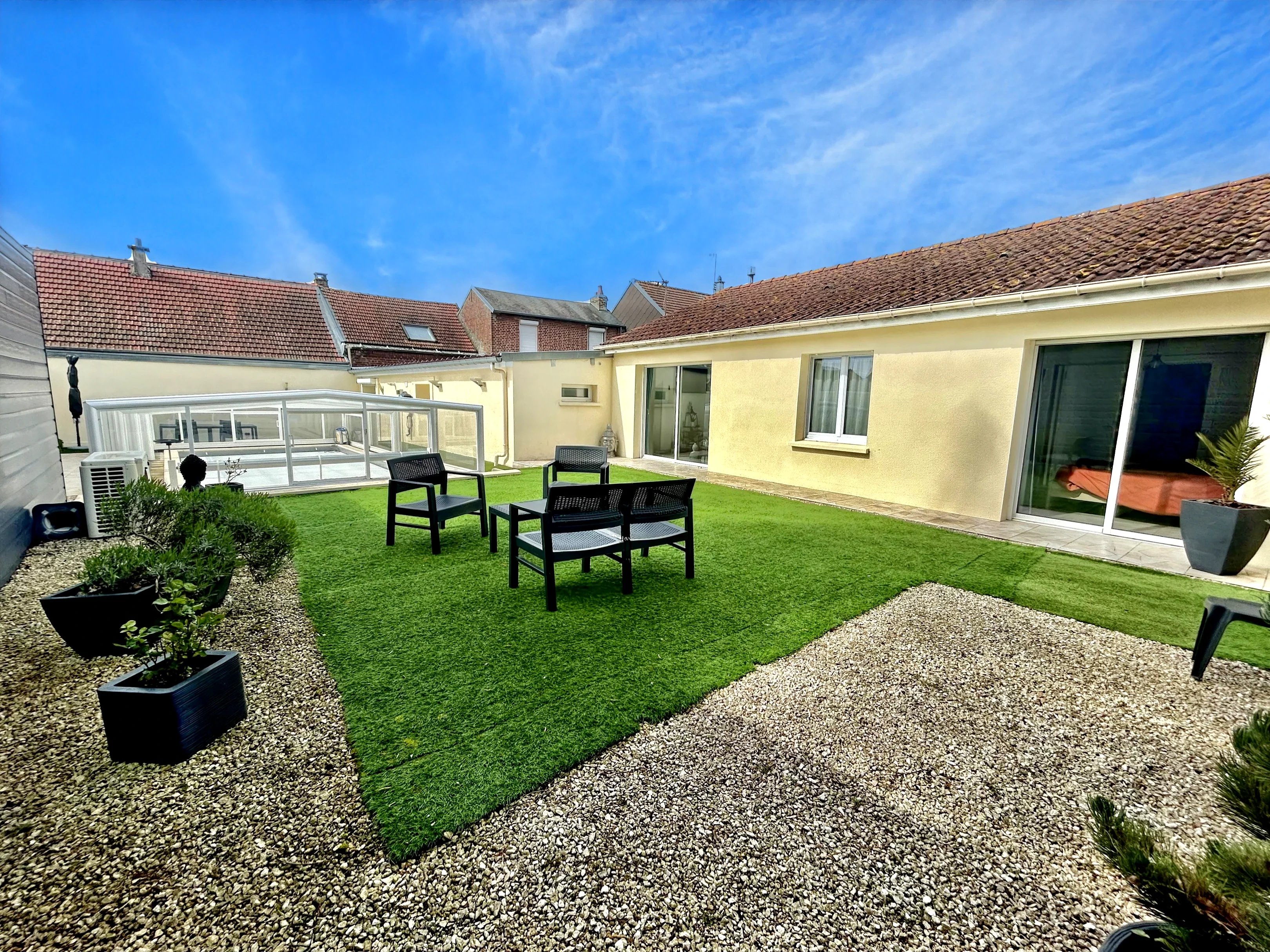 L'agence immobilière H2Z IMMOBILIER vous propose EN EXCLUSVITÉ: Découvrez cette belle maison de 169 m² habitables, idéalement située à Villers-Bretonneux (80800), sur une parcelle de 354 m² sans vis-à-vis, offrant confort, espace et prestations de qualité comprenant : RDC : Très bel espace de vie avec pôele à granulés, cuisine équipée ouverte, un deuxième grand salon avec bureau, sauna et poêle à granulé, deux chambres dont une suite parentale avec grand dressing et salle d'eau (douche à l'italienne), une grande salle de bain (avec douche italienne, double vasque et baignoire), buanderie, cellier, wc séparé, accès terrasse et piscine. ÉTAGE : Palier desservant deux chambres et un wc. EXTERIEUR : Parcelle de 354m² sans vis à vis, terrasse, piscine (7x3,5) couverte et chauffée par une pompe à chaleur + volet de sécurité, un double garage de 54m2 avec porte électrique et un point d'eau PRESTATIONS : Relié au TAE, chauffage électrique et gaz, chaudière gaz de 2021, deux pôeles à granulés, huisserie PVC double vitrage, baie coulissante en alu, volet roulant électrique, adoucisseur d'eau, caméra et alarme SITUATIONS : À proximité des commodités (transport, commerces, école et collège), proche centre-ville, gare et accès autoroute... DPE = C / GES = C Les +++ : - Maison fonctionnelle et bien pensée - Prestations bien-être : piscine & sauna - Beaux volumes - Aucun travaux à prévoir PRIX : 330 000 euros Honoraires Agence Inclus à la charge du vendeur. « Les informations sur les risques auxquels ce bien est exposé sont disponibles sur le site Géorisques : www.georisques.gouv.fr »