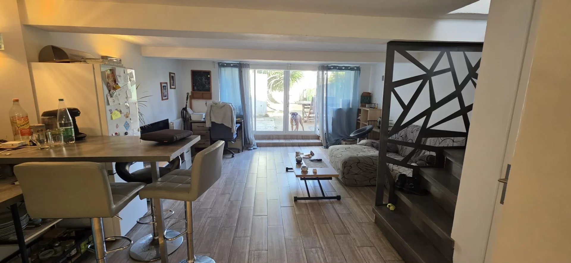 Au rez-de-chaussée, vous trouverez une spacieuse pièce de vie avec une grande baie vitrée donnant directement sur une terrasse et un jardin intime, idéal pour profiter des beaux jours en toute tranquillité.
