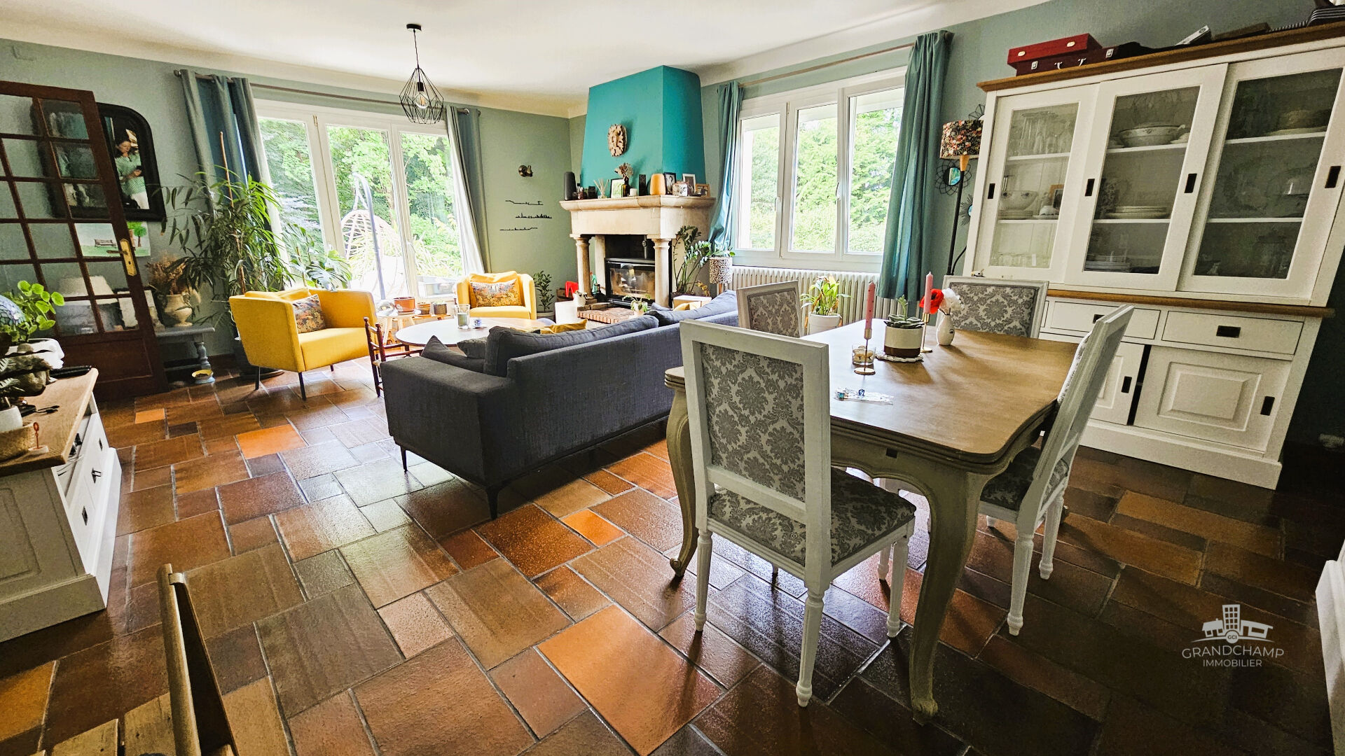 Nichée au coeur d'un parc arboré de 5605 m² , cette élégante et spacieuse traditionnelle (183 m² habitables sur un sous-sol de 120 m²) laisse libre cours à tout projet familial ou professionnel. Au rez-de-chaussée, la pièce de vie de 35 m² et la cuisine de 12 m² s'ouvrent sur une confortable terrasse exposée sud et entourée de verdure. Côté nuit, un dégagement équipé de placards distribue 4 chambres dont une de 12.50 m² avec un accès à la terrasse et 3 autres de 9 m² . Une salle d'eau et des toilettes viennent compléter le rez-de-chaussée. De l'entrée cathédrale, l'escalier dessert l'étage par la grande mezzanine distribuant d'un côté une grande chambre de 37 m² et les toilettes et de l'autre une chambre de 13 m² avec sa salle d'eau privative et deux greniers servant de rangement. Travaux récents: production d'eau chaude et chauffage par une pompe à chaleur AIR/EAU en 2018, poêle à bois, rénovation du tableau électrique, cuisine refaite à neuf en 2025 Les Plus: carport et cabanon de jardin, grand sous-sol aménagé avec garage, chaufferie, cuisine et cave. Jardin avec fruitiers et arbustes à fleur. (3.48 % honoraires TTC à la charge de l'acquéreur.) Annick Le Nevé (EI) Agent Commercial - Numéro RSAC : 477839716 - NANTES 44.