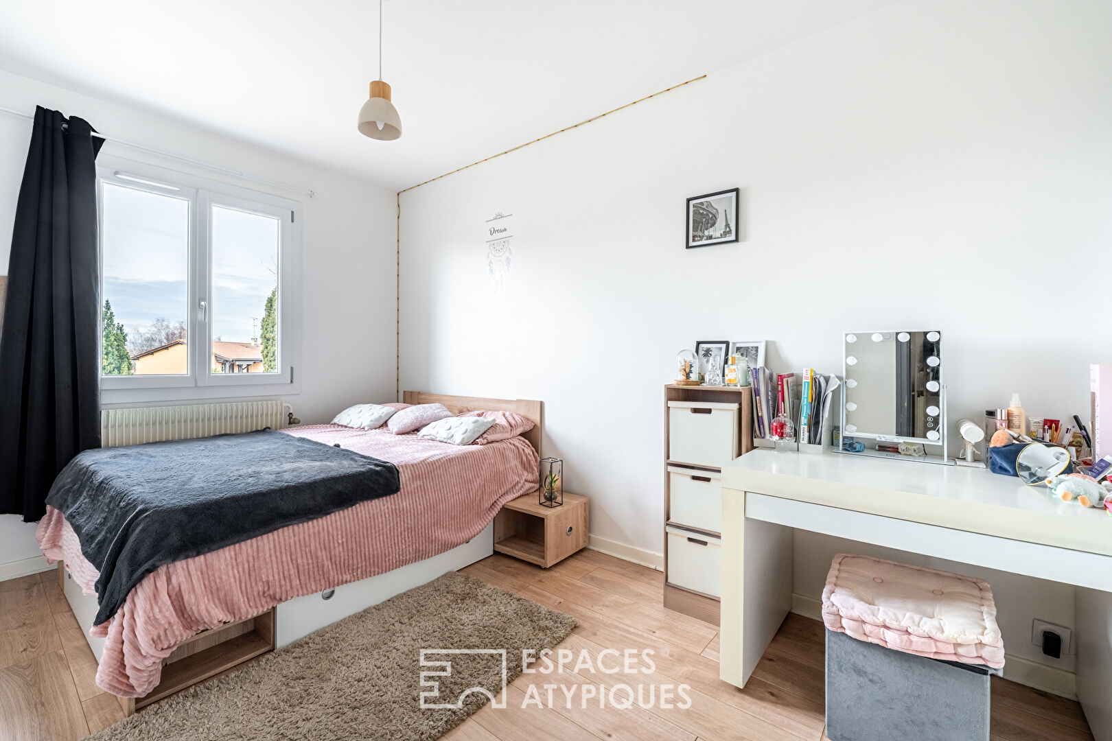 Située à Chaleins, dans un environnement résidentiel calme et verdoyant, cette maison individuelle de 1979 entièrement rénovée développe environ 100 m² habitables, complétés par une véranda de 13 m² à aménager, sur une parcelle arborée de 879 m². L'entrée dessert une pièce de vie chaleureuse composée d'un salon et d'une salle à manger baignés de lumière naturelle, sublimés par une cheminée qui structure l'espace et invite à la convivialité. La circulation est fluide et met en valeur les perspectives vers l'extérieur grâce à un accès direct à la terrasse. La cuisine indépendante, parfaitement intégrée, propose un espace fonctionnel et agréable pour le quotidien. A l'étage, un dégagement distribue trois chambres aux volumes équilibrés, pensées comme de véritables espaces nuit. Une salle d'eau et des toilettes séparées complètent ce niveau. Le confort est renforcé par un chauffage au sol, garantissant une chaleur douce et homogène dans l'ensemble de la maison. Le sous-sol accueille un garage et une buanderie d'environ 48 m², ainsi qu'une cave de 9 m², offrant des espaces annexes appréciables pour le rangement et les usages techniques. L'environnement immédiat conjugue calme et proximité des commodités, avec écoles et commerces accessibles à quelques minutes. Repensée avec soin, elle séduit par la qualité de sa rénovation, sa luminosité et ses volumes fonctionnels, offrant un cadre de vie confortable et harmonieux. CLASSE ENERGIE : D / CLASSE CLIMAT : D Montant moyen estimé des dépenses annuelles d'énergie pour un usage standard, établi à partir des prix de l'énergie de l'année 2021, 2022, 2023 : entre 1610 euros et 2230 euros Contact : Héloïse - 06 68 44 82 46 Héloïse Restier (EI) Agent Commercial - Numéro RSAC : 828 524 058 - Villefranche-Tarare.