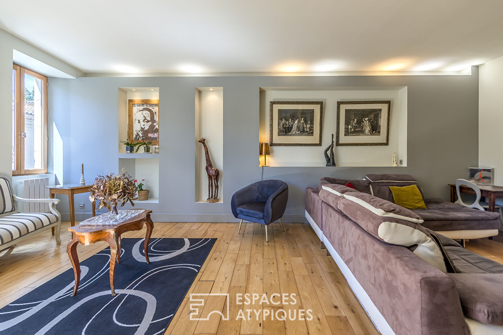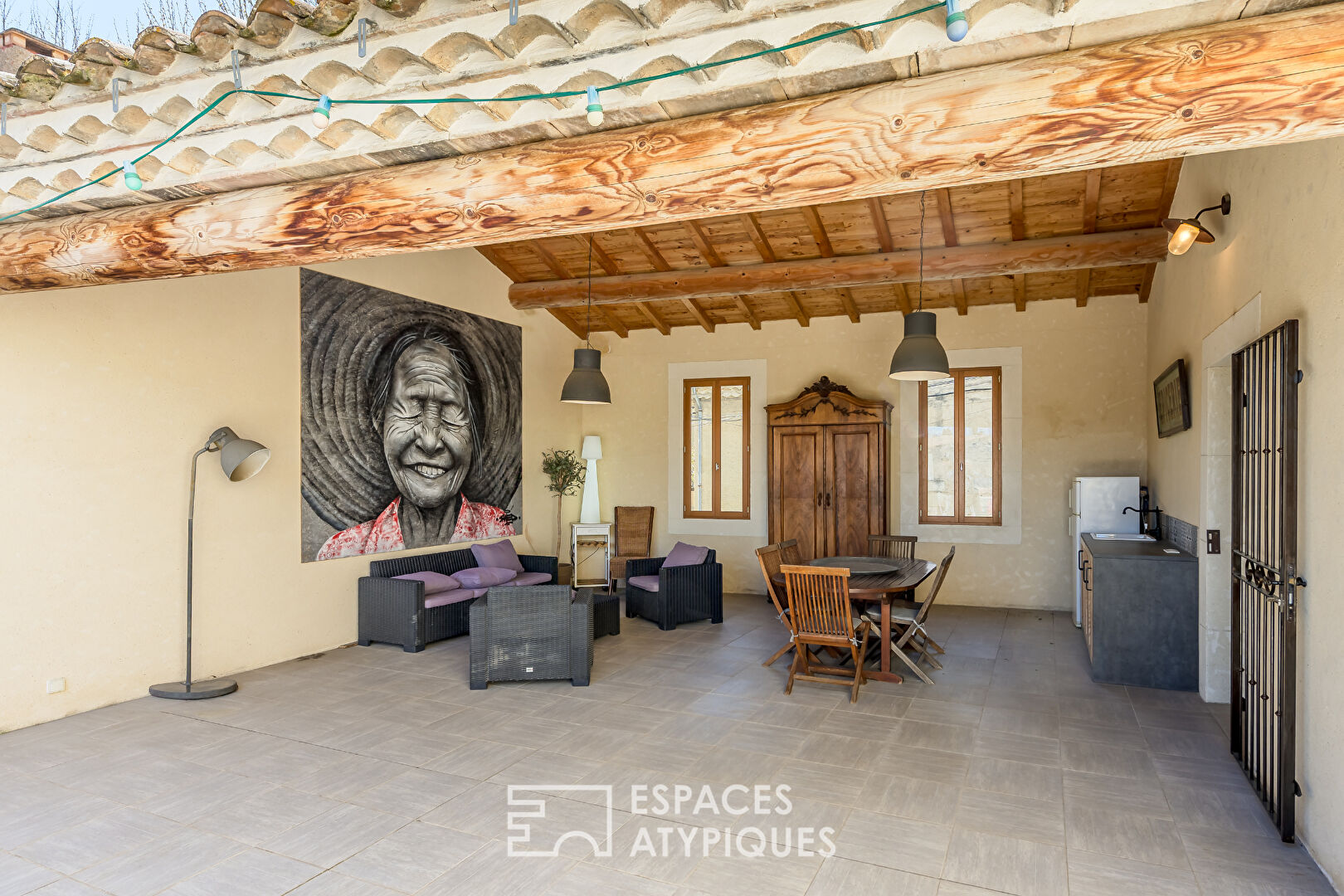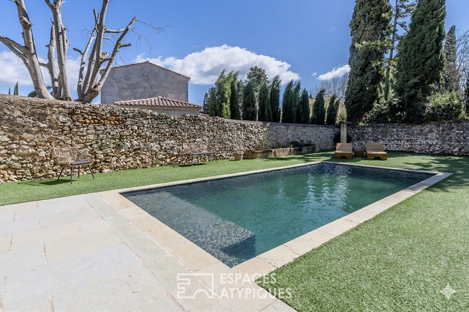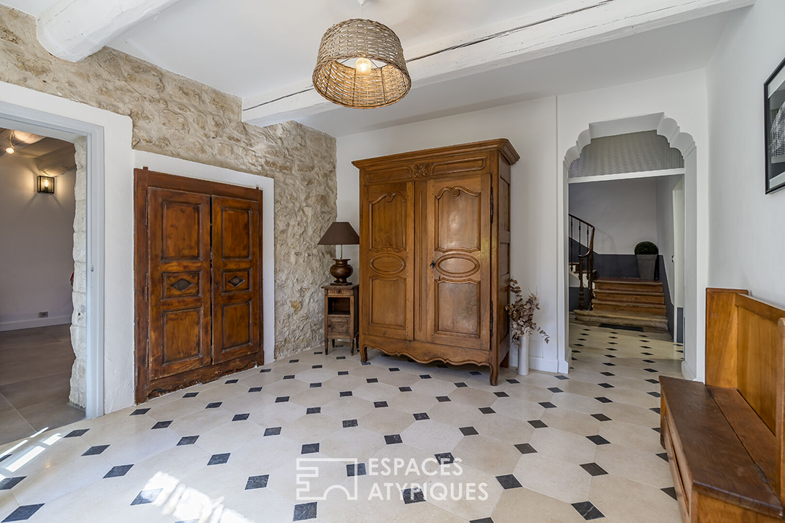 Au coeur du village de Rochefort-du-Gard, cette maison de maître de 263 m² s'affirme comme un bien rare. Entièrement rénovée, la demeure a su préserver son âme d'antan tout en intégrant des codes architecturaux contemporains et fluides. Le rez-de-jardin accueille un vaste hall, une chambre, une salle d'eau ainsi qu'un grand séjour de réception avec cuisine. Un escalier majestueux dessert les 2 autres niveaux. Le 1er étage, véritable coeur battant de la maison, offre un espace de vie baigné de lumière, chaleureux par son poêle à bois double face où salon et salle à manger communiquent avec une cuisine ouverte très contemporaine. Ce niveau se prolonge vers une exceptionnelle terrasse couverte de 78 m², véritable pièce de vie extérieure aux allures de loggia. Un bureau et une petite chambre avec salle d'eau le complète. Le dernier étage est dédié a l'espace nuit avec deux chambres, une salle d'eau et une vaste suite parentale dotée d'un dressing et d'une salle de bain. L'extérieur est une invitation à la sérénité. Rare en centre-village, il révèle un jardin clos de murs en pierres sèches abritant une piscine aux teintes naturelles et aux lignes épurées. Ce havre de paix, permet de profiter de la douceur du climat gardois à quelques pas des commerces et des écoles. Ce bien singulier, entièrement rénové avec soin, offre un cadre de vie privilégié à proximité d'Avignon. Les prestations sont complétées par un immense garage, atout précieux en centre-village. Ce bien au cachet incomparable, répond aux attentes des acquéreurs en quête d'un immobilier atypique et élégant. CLASSE ENERGIE : B / CLASSE CLIMAT : A Montant moyen estimé des dépenses annuelles d'énergie pour un usage standard établi à partir des prix de l'énergie de l'année 2021, 2022, 2023 entre 1760 euros et 2460 euros. Les informations sur les risques auxquels ce bien est exposé sont disponibles sur le site Géorisques : www.georisques.gouv.fr