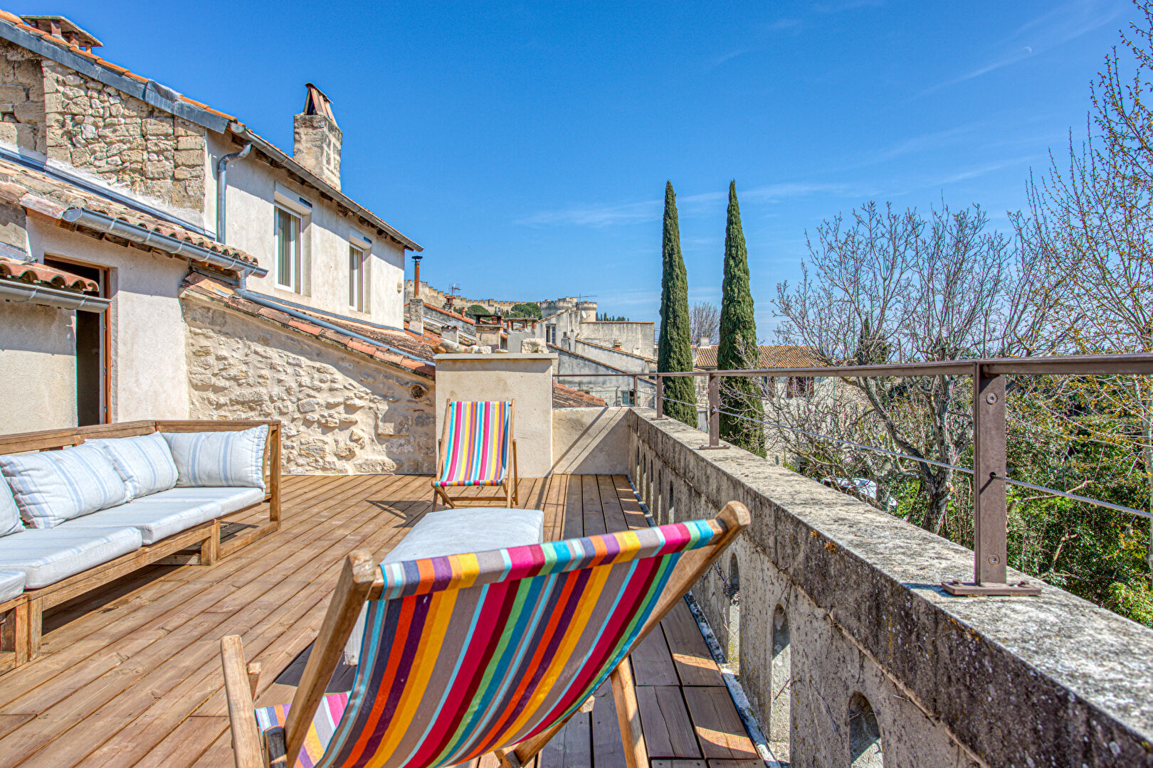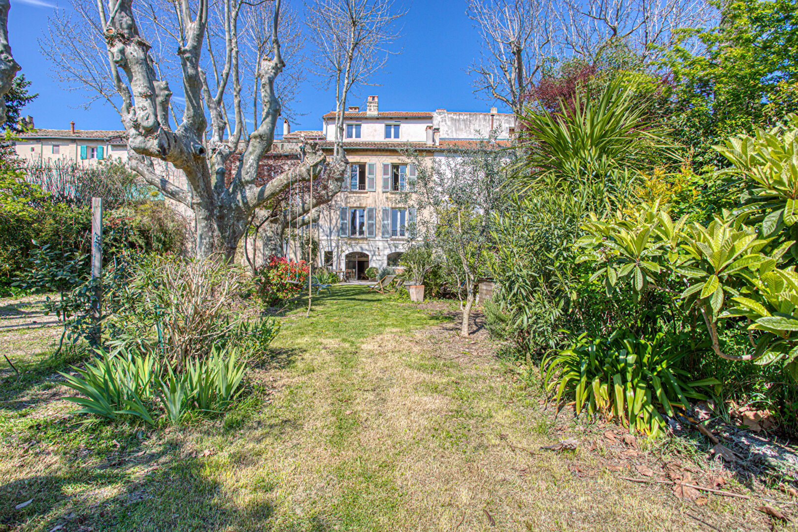 Idéalement placée dans le centre historique de Villeneuve-lès-Avignon, cet ensemble immobilier rare incarne un art de vivre unique, entre patrimoine, volumes et potentiel infini. Réunissant deux maisons de caractère, ce lieu singulier développe une surface habitable d'environ 490 m² et offre une multitude de possibilités, tant pour une résidence familiale d'exception que pour un projet d'accueil. La maison principale de 348 m2, entièrement rénovée, s'ouvre sur une vaste entrée élégante intégrant des espaces de rangement et un local technique. Une pièce indépendante avec salle d'eau, actuellement louée, génère un revenu immédiat et peut être libérée selon les projets. Dans le prolongement, un salon chaleureux doté d'une cheminée invite à la convivialité, tandis qu'un escalier en pierre mène à la cuisine, véritable coeur de la maison, en rez de jardin. Cet espace de vie central, tourné vers l'extérieur, incarne à lui seul l'âme des lieux. Un majestueux escalier dessert les étages supérieurs : Au premier niveau, une superbe suite parentale contemple le jardin, accompagnée de trois autres chambres aux volumes généreux, partageant deux salles d'eau dont une au caractère affirmé, sublimée par un meuble de métier. Au second étage, deux chambres supplémentaires s'articulent autour d'un espace détente, propice à un usage familial ou indépendant. Au même niveau, un atelier composé de deux vastes pièces vient parfaire cet ensemble, offrant de multiples perspectives : espace créatif, bureau ou extension de l'habitation. La seconde maison, mitoyenne, dispose aujourd'hui d'une entrée indépendante depuis la rue tout en étant reliée au jardin. A réhabiliter complètement, elle possède de très beaux sols en carreaux de ciment, développe environ 140 m² sur 3 niveaux et représente un potentiel exceptionnel : agrandissement de la propriété, création de chambres d'hôtes ou projet locatif. Elle se compose actuellement d'un séjour, de 3 chambres et d'un atelier et est prolongée en son sommet par une exceptionnelle terrasse d'environ 30 m² offrant une vue imprenable sur le Fort Saint-André et la douce colline des Mourgues, cadre idéal pour profiter des soirées d'été. Enfin, véritable privilège en coeur de village, le jardin paysagé d'environ 1 000 m² avec bassin est pourvu de 2 forages. Il constitue l'atout majeur de cette propriété. Rare et préservé, cette ancienne cour d'école avec ses 3 platanes séculaires à l'ombrage salutaire offre une sensation unique de campagne en pleine ville, comme un prolongement naturel de la maison. Un bien hors normes, chargé d'histoire et d'élégance, destiné aux amateurs de lieux de vie uniques et inspirants. CLASSE ENERGIE : C / CLASSE CLIMAT : C Montant estimé des dépenses annuelles d'énergie pour un usage standard, établi à partir des prix moyens des énergies indexés sur les années 2021,2022 et 2023 entre 3710 euros et 5080 euros Les informations sur les risques auxquels ce bien est exposé sont disponibles sur le site Géorisques : www.georisques.gouv.fr