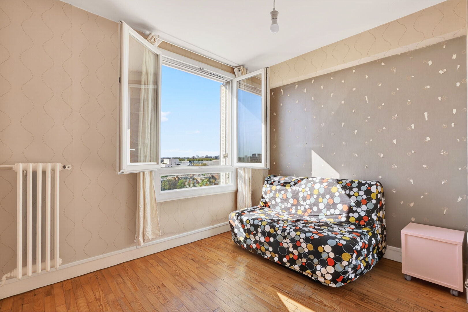 COLOMBES - Gare du Stade - Dans une résidence fermée avec parking extérieur collectif, Appartement 3/4 pièces : 65m², en étage élevé avec ascenseur; Calme, Lumineux et offrant une Superbe Vue Dégagée Plein Ouest; comprenant : entrée, vaste double séjour de 29m² + Cuisine US entièrement équipée, BALCON, 2 chambres (3ème possible en réduisant la taille du salon), SdE, WC et placards. Chauffage collectif. Cave. Fenêtres PVC. Très bon DPE en C (idéal pour de la location). Gare et commerces à 3min, et proche Futur Tramway T1. (4.29 % honoraires TTC à la charge de l'acquéreur.) Copropriété de 704 lots - dont 296 lots habitation. Charges annuelles : 2800 euros.