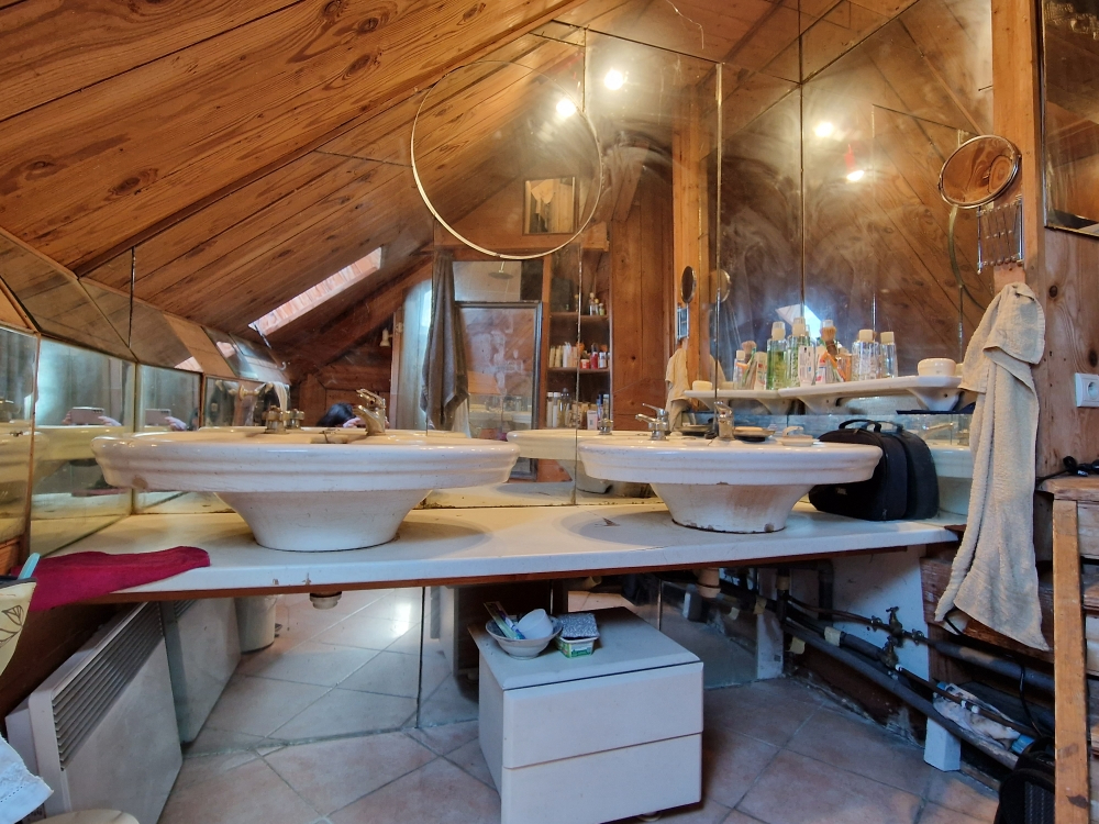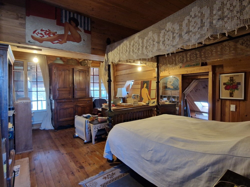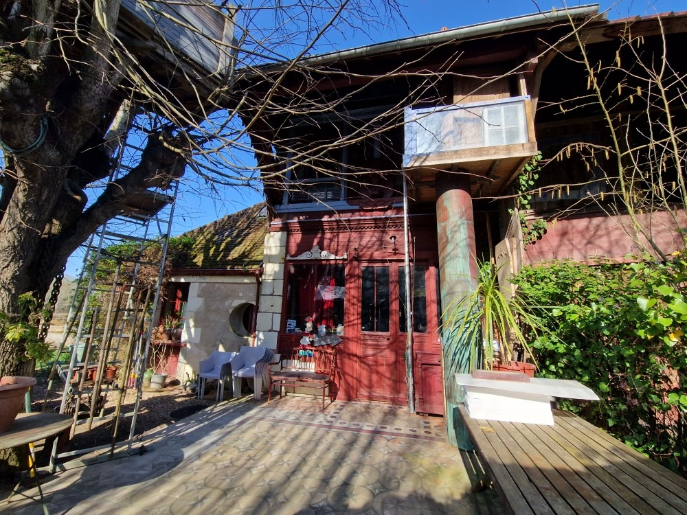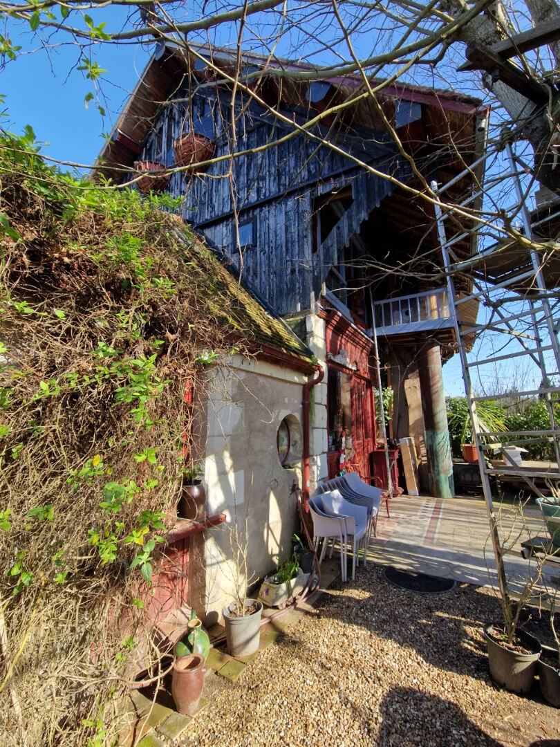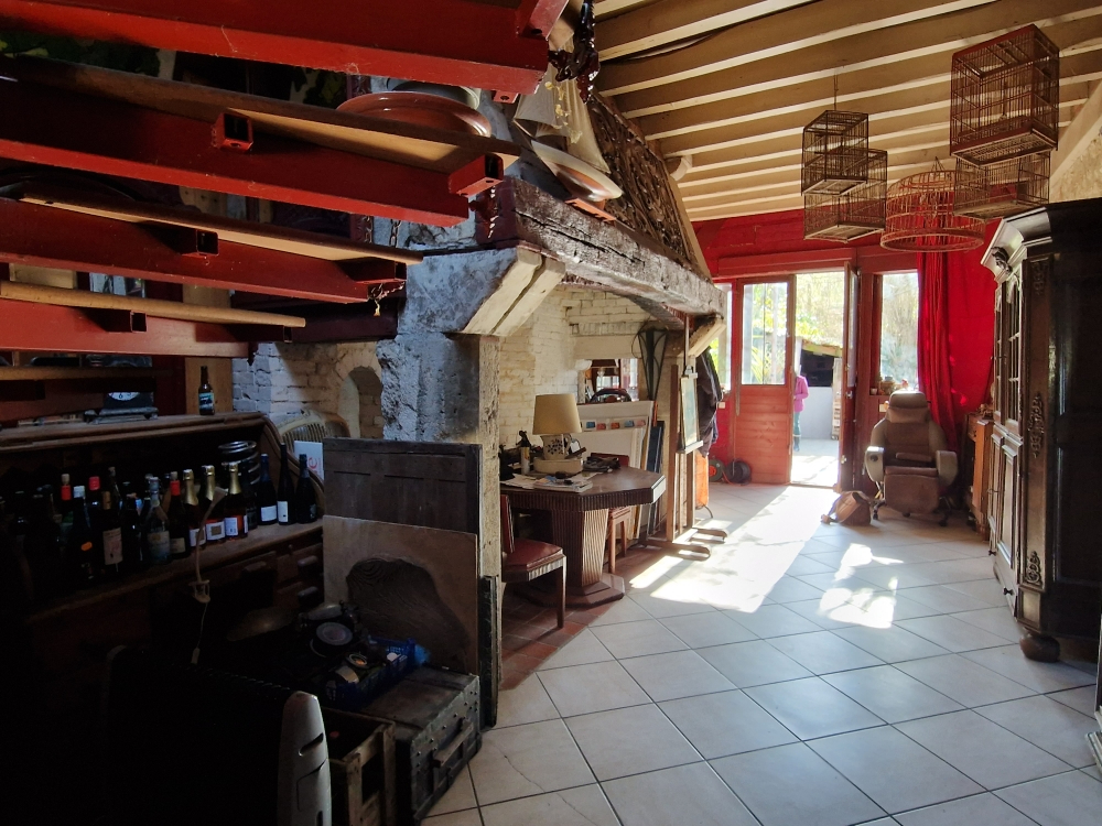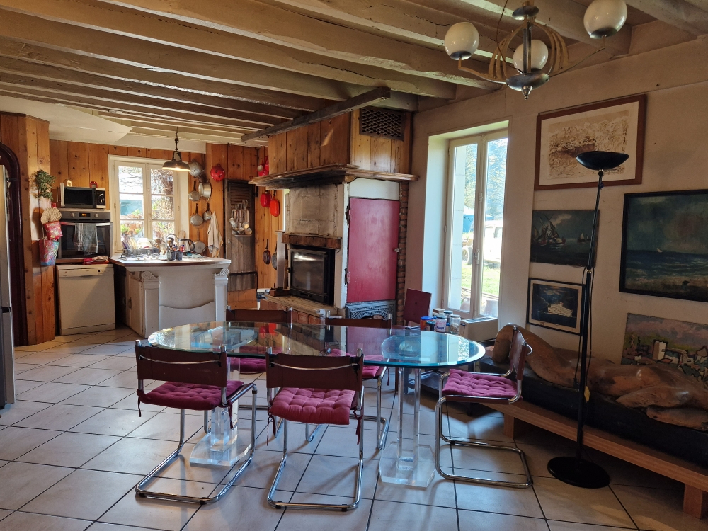 Maison atypique comprenant : un séjour (40 m²) avec une grande cheminée et grand escalier en colimaçon pour accéder à l'étage, une salle à manger avec cuisine ouverte (37 m²), wc. A la suite du séjour : un logement (27 m²) (porte d'accès au jardin) comprenant : une pièce avec coin cuisinette, une salle d'eau, wc. (chauffage par poêle au bois). A l'étage : une grande chambre (27,5 m²), une salle d'eau, un dressing. Au dessus : une chambre mansardée Une terrasse. Un jardin. Le tout sur 2232 m² (5.59 % honoraires TTC à la charge de l'acquéreur.)