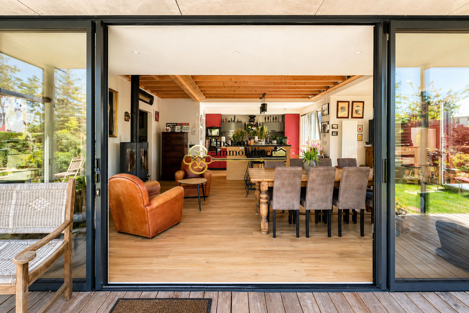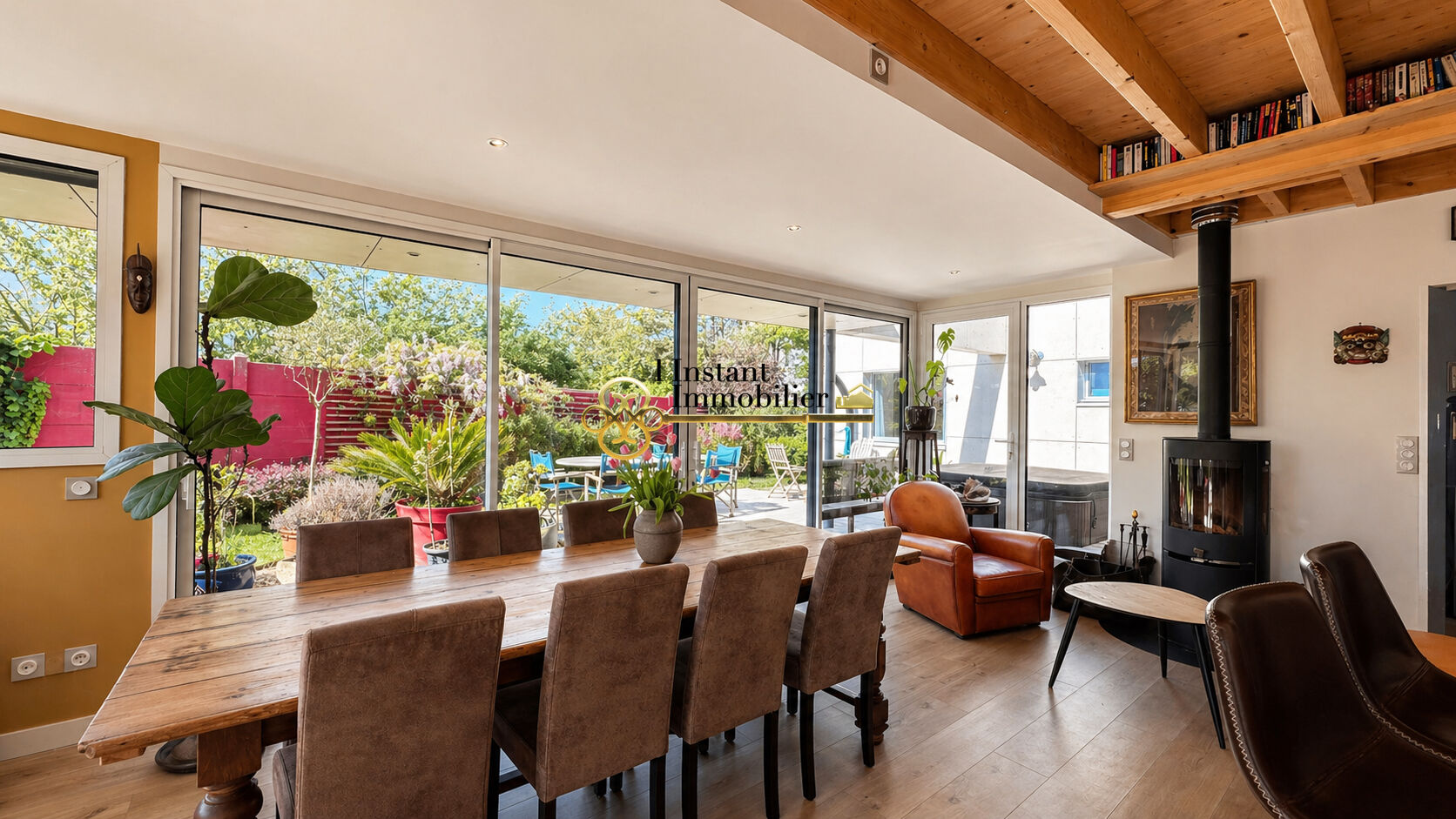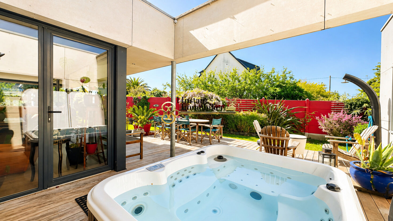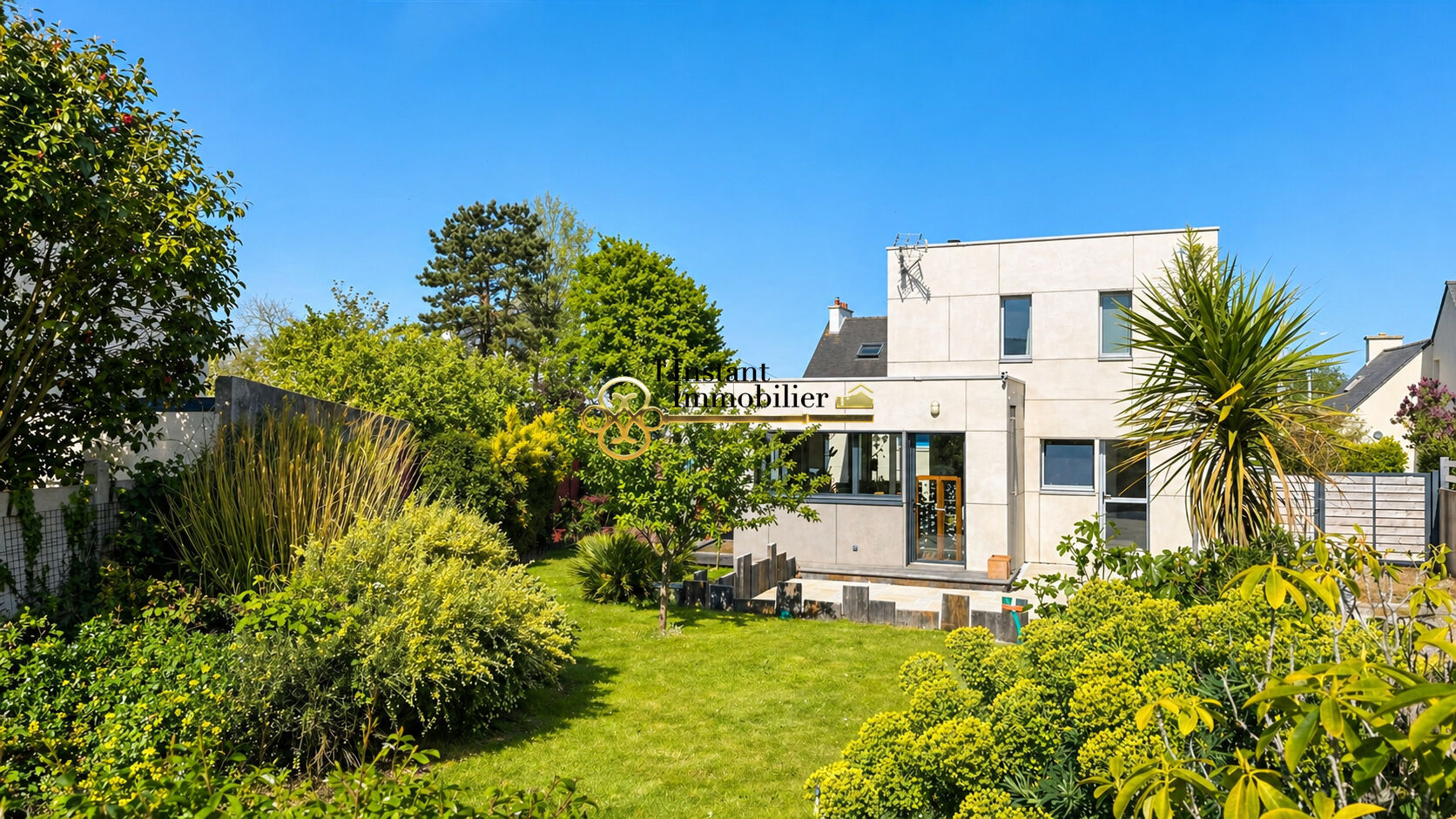 Cette maison d'architecte de 2019 de 140 m² habitables, vivable de plain-pied, est située sur un terrain de 900 m², à proximité du bourg de Carantec. La maison est composée au rez-de-chaussée d'un vestibule, d'une pièce de vie (cuisine/salon/séjour) très lumineuse, d'une arrière-cuisine, d'une chambre avec salle d'eau attenante, d'un grand dressing, d'une lingerie, d'un w-c avec lave-mains, et d'un garage à porte sectionnelle électrique. Au 1er étage, on trouve deux chambres, une mezzanine avec bureau, une salle d'eau, et un w-c. Extérieurs : Une allée enrobée avec plusieurs places de parking, un jardin arboré, 2 terrasses orientées au sud-est et au sud-ouest (jacuzzi), un carport, un atelier, une serre (5.00 % honoraires TTC à la charge de l'acquéreur.)
